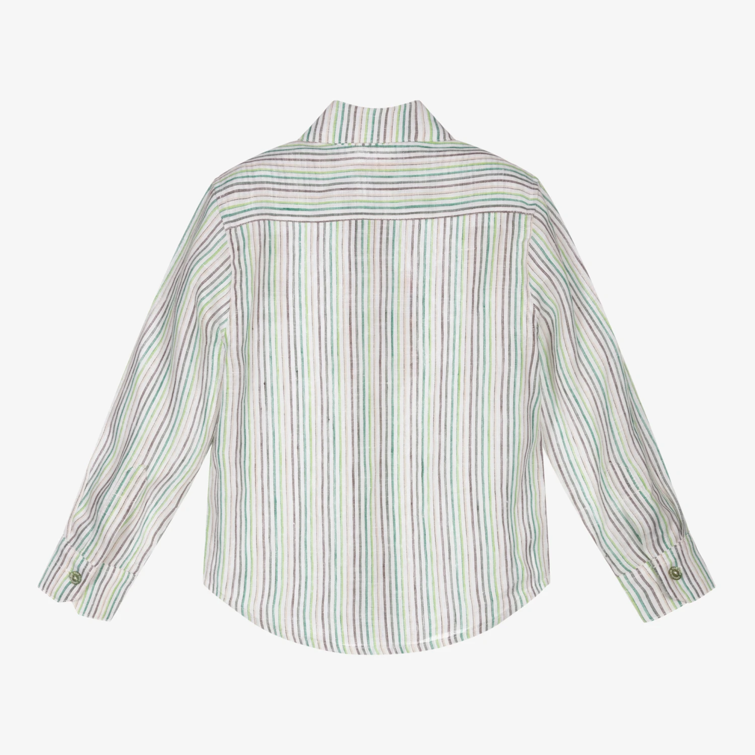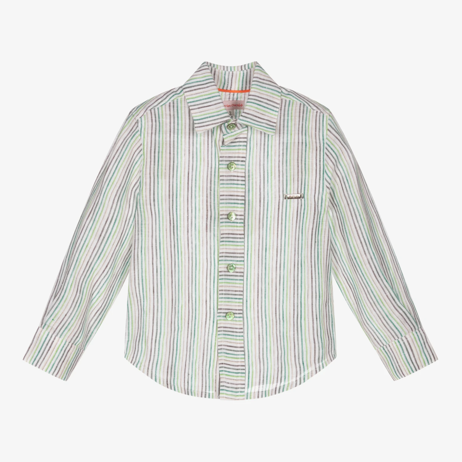 A smart green and white shirt for boys from Pan Con Chocolate, made in a soft and lightweight linen and cotton blend. With an all-over stripe pattern, this shirt has a silver metal logo plate on the chest and a classic collar. It fastens with buttons on the front and cuffs.
