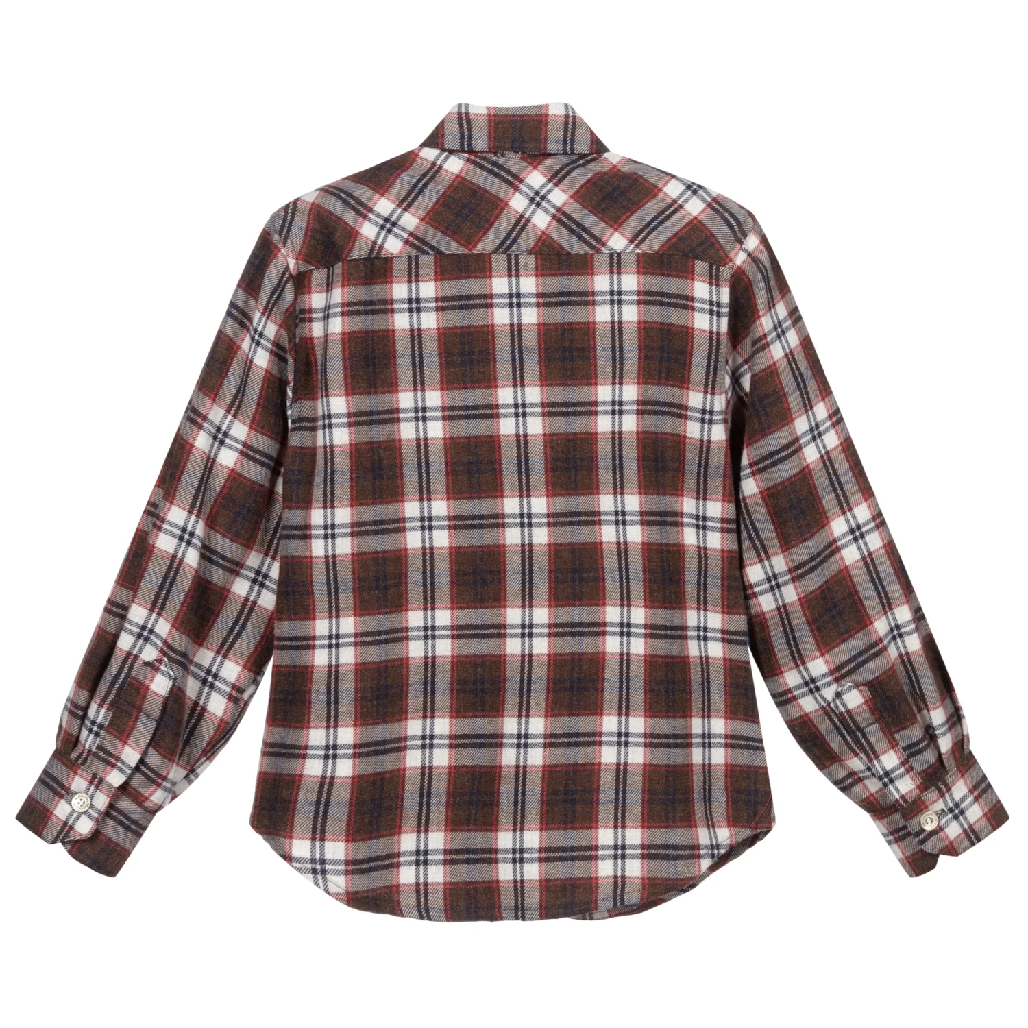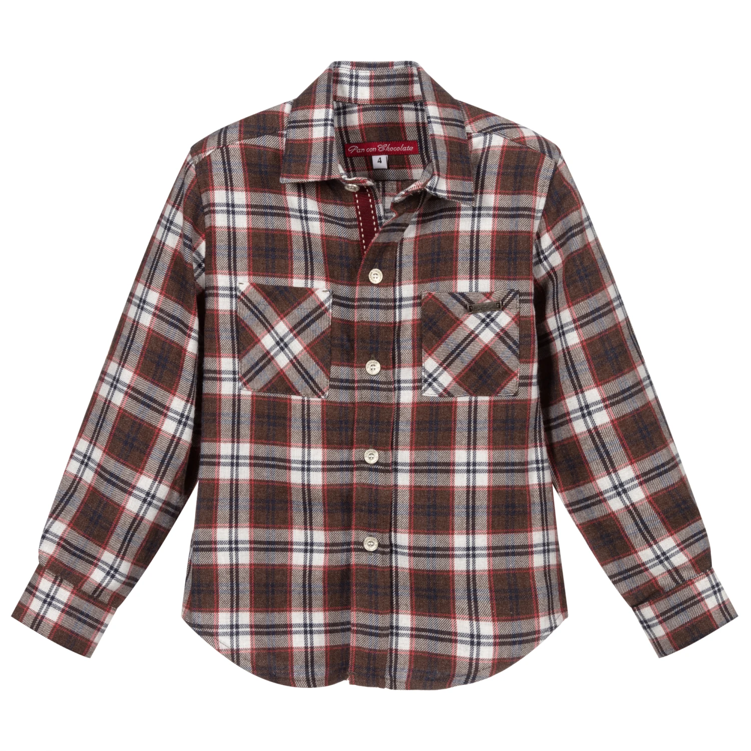 Brown, red and blue checked shirt for boys by Pan Con Chocolate. it is made soft brushed cotton, with a useful chest pocket.