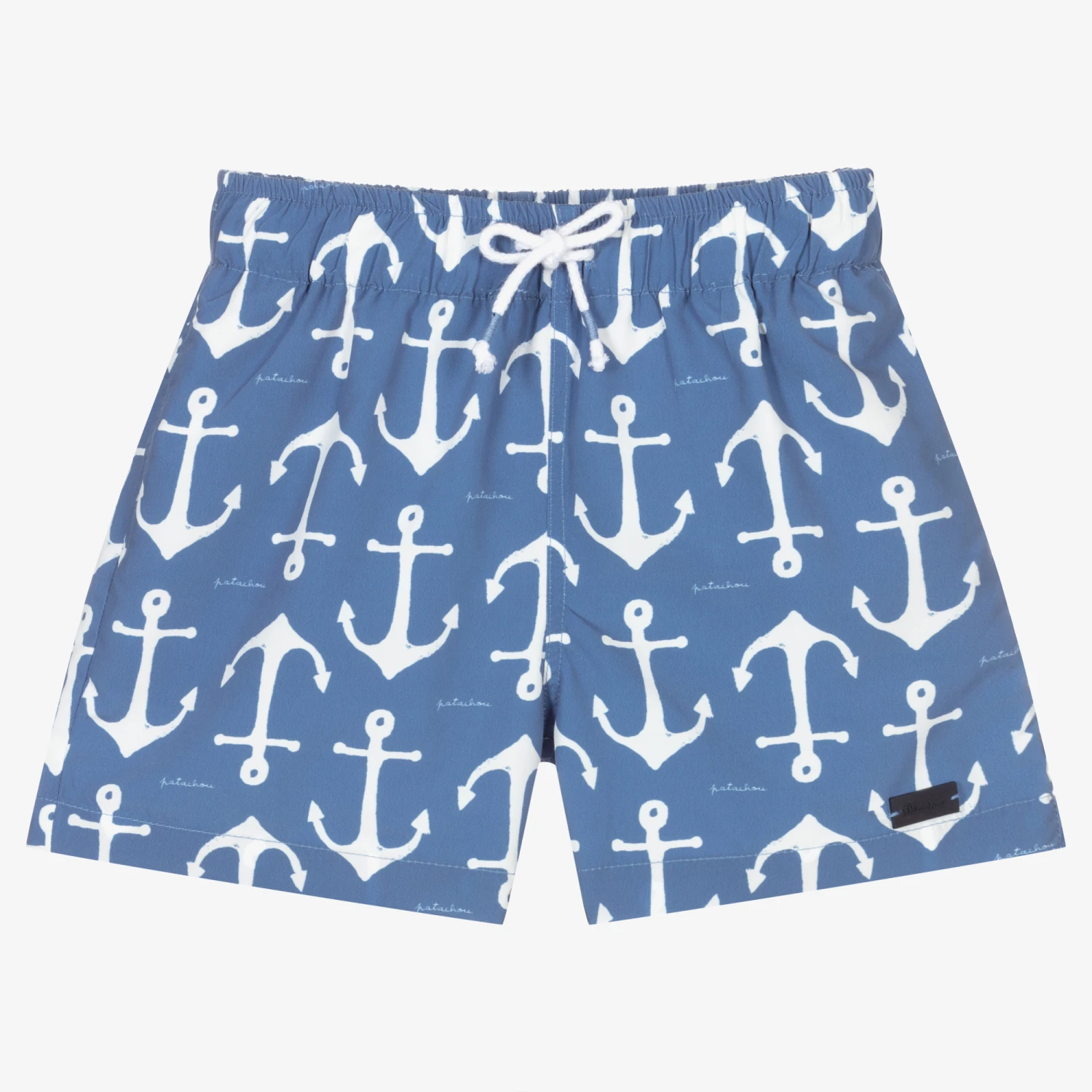 Mid-blue swim shorts for boys by Patachou, with a white anchor and logo print. Super soft and silky, they have a mesh lining for comfort. There are useful concealed pockets on the sides and a faux white drawstring on the elasticated waistband. The brand’s black rubberised logo tab is on one leg.