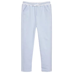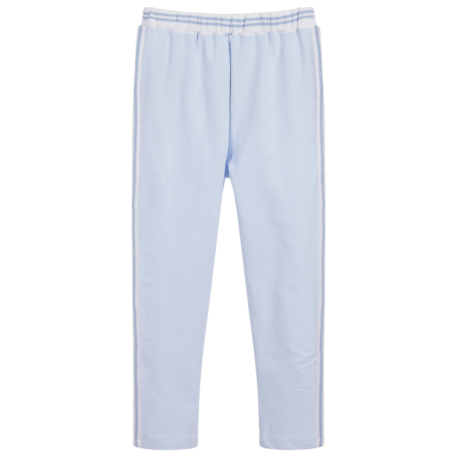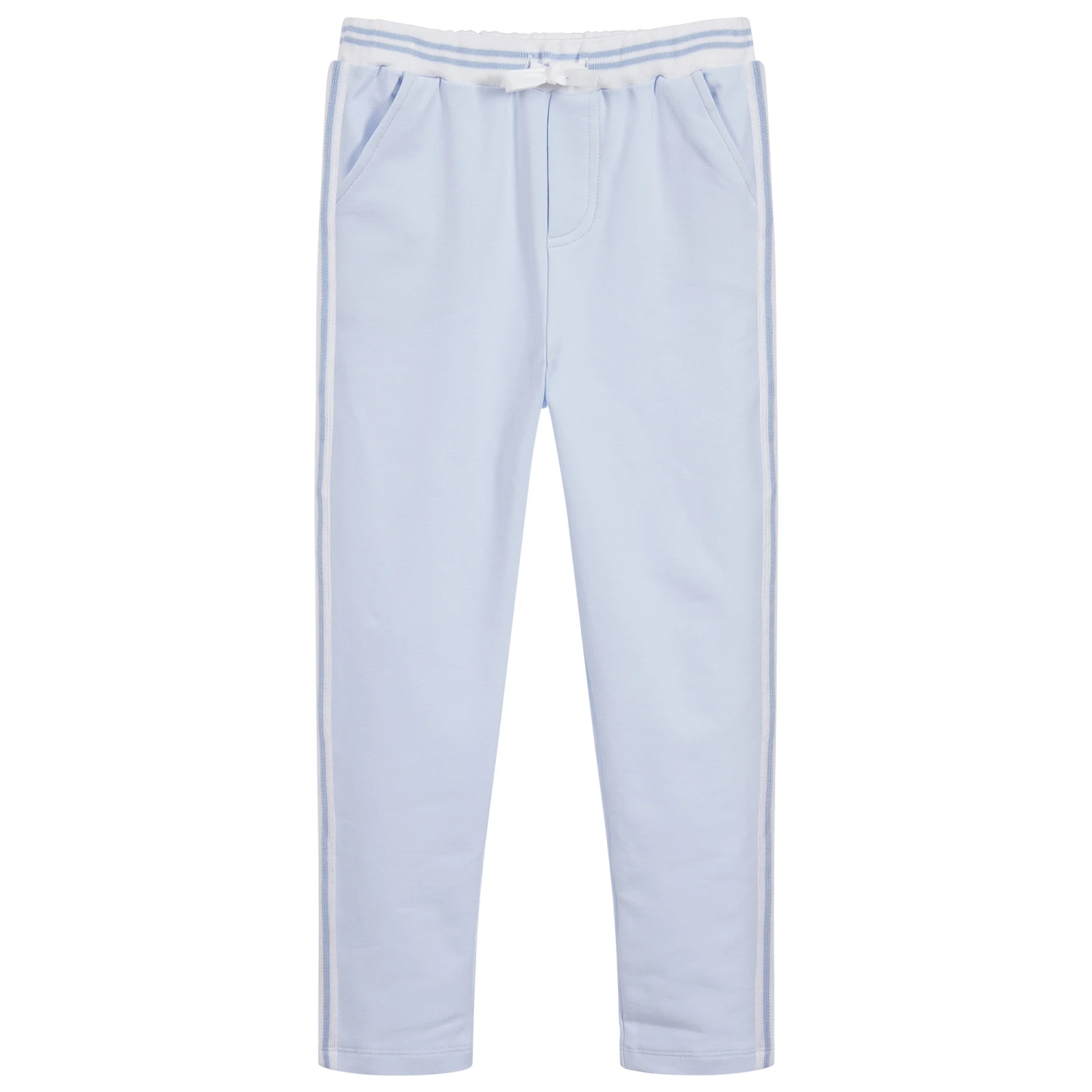 Boys blue cotton jersey joggers from Patachou, with an elasticated waist and white trim.
