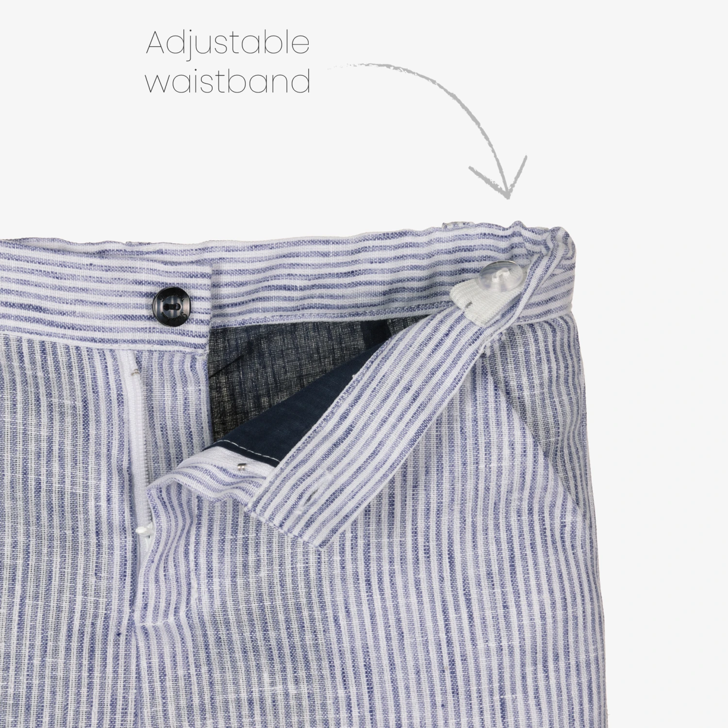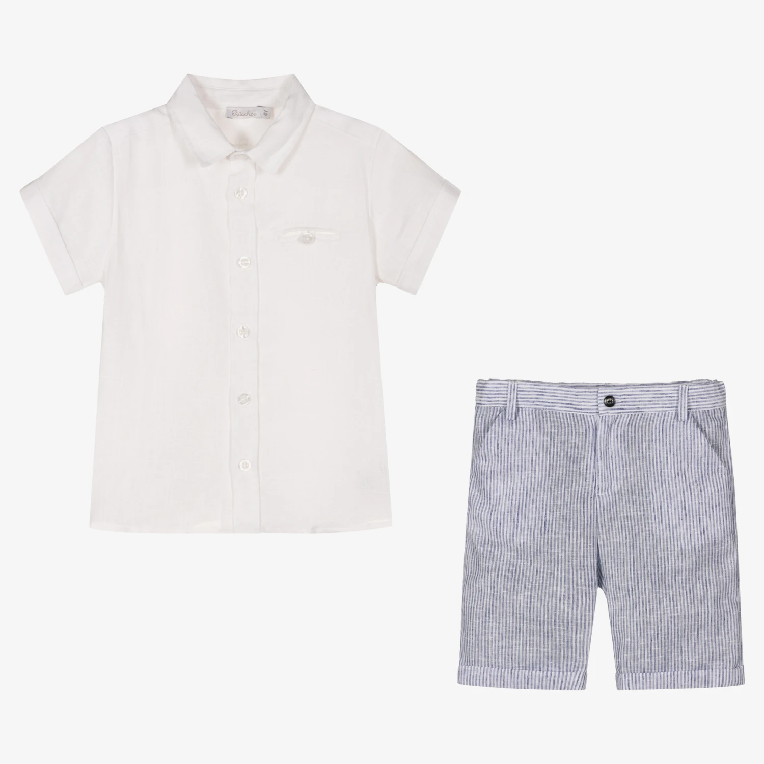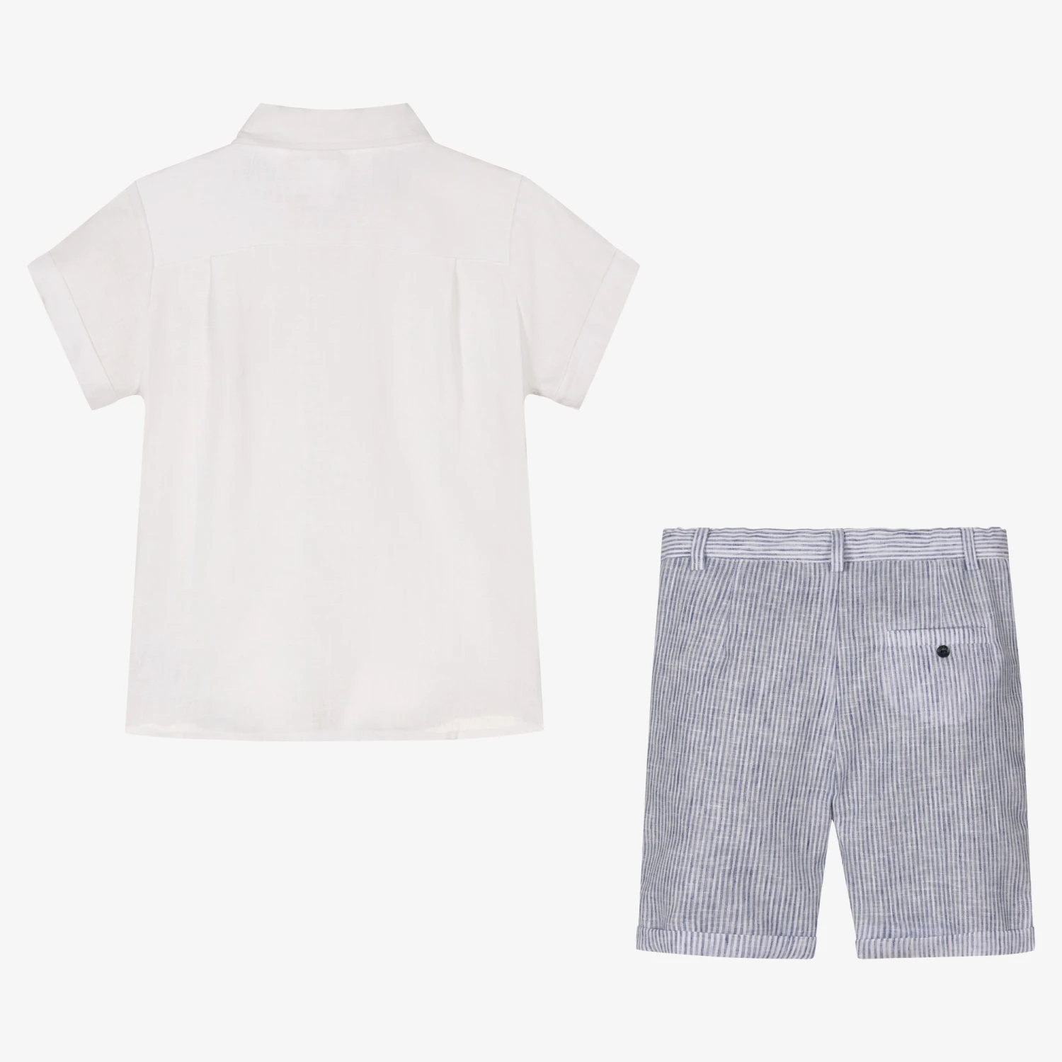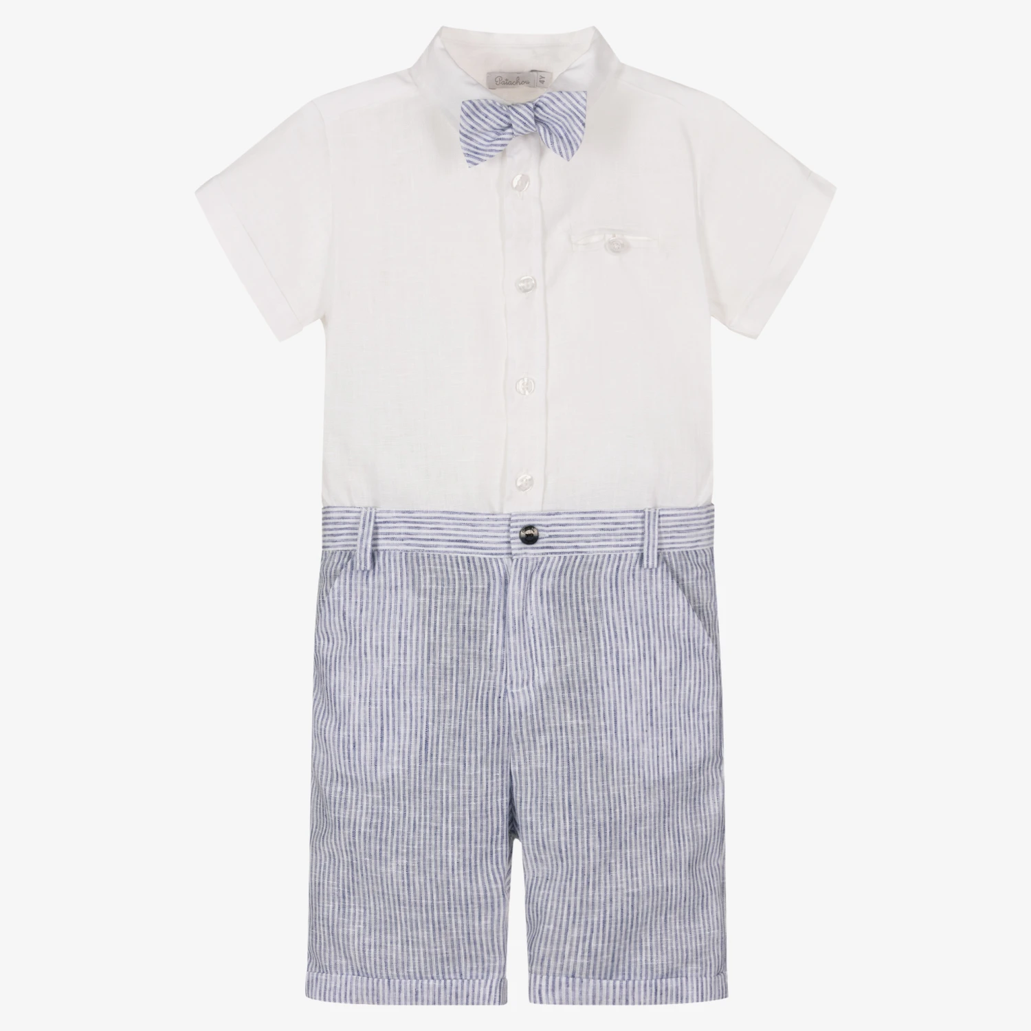Blue and white shorts set for boys by Patachou, with a lightweight and breathable linen shirt. Ideal for the warmer months, the short-sleeved shirt has a smart point collar, front button fastenings, and a charming chest pocket. The blue, striped shorts are styled with turn-up cuffs and slanted pockets on the hips. Fully lined for comfort, they have a button and zip fastening on the front with an adjustable waist to ensure a suitable fit. The set includes a detachable bow tie designed in matching stripes to complete the outfit.