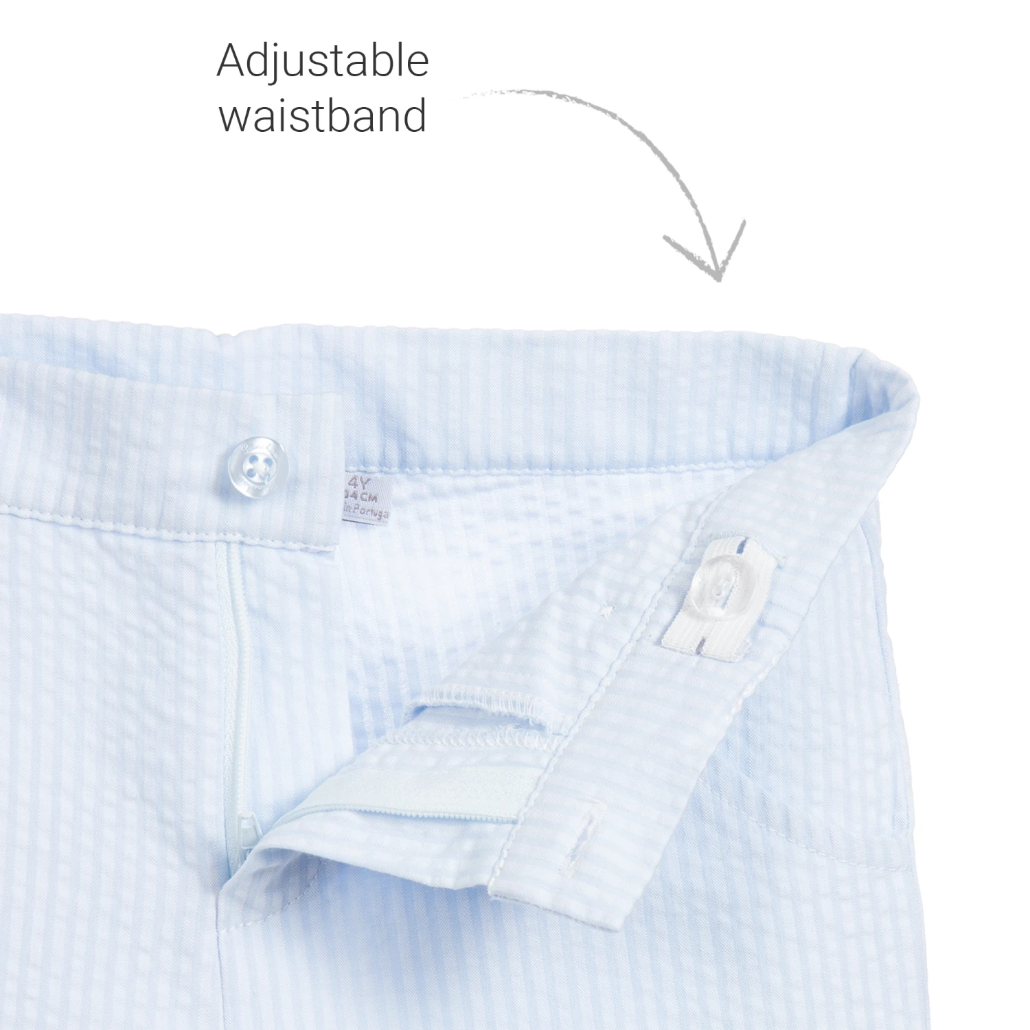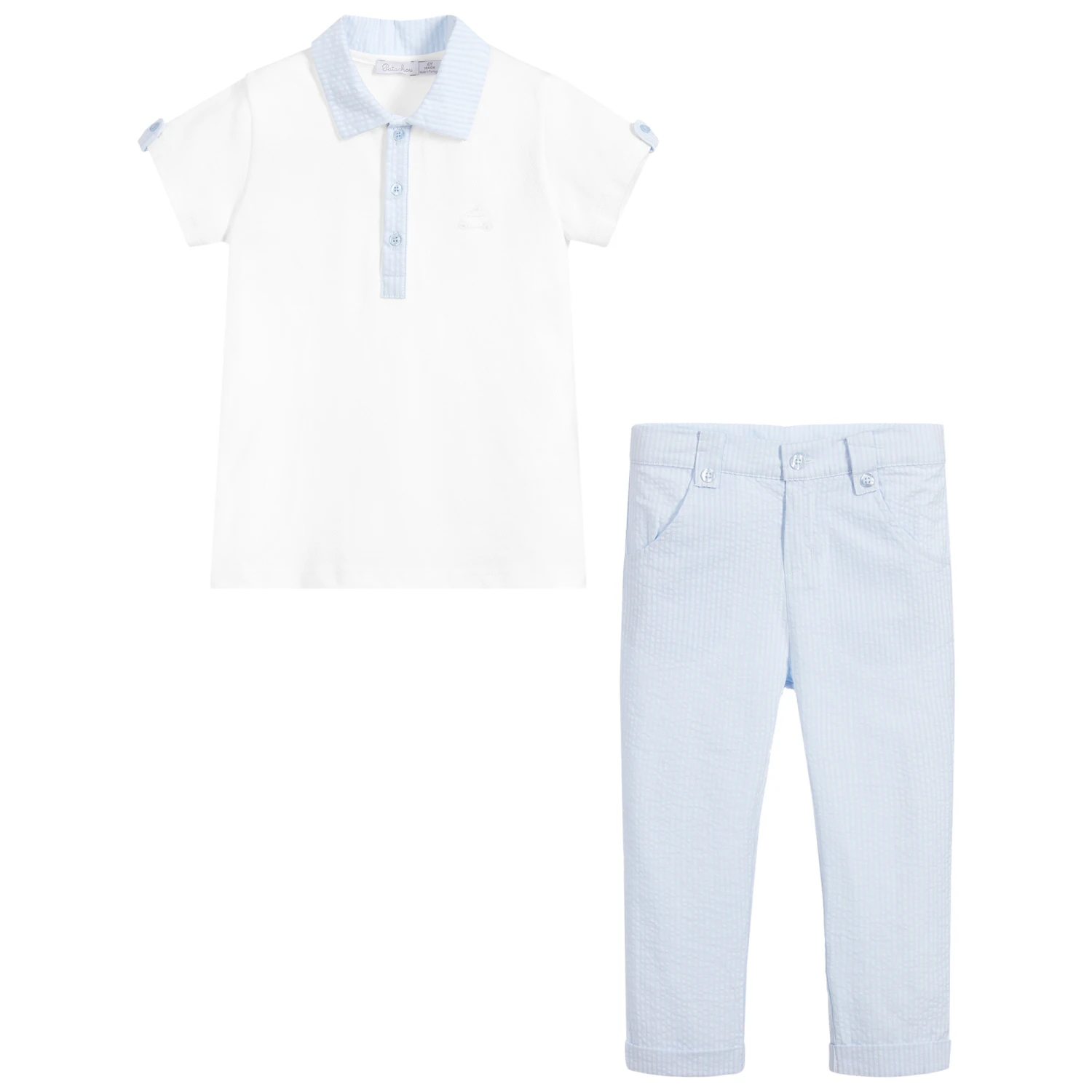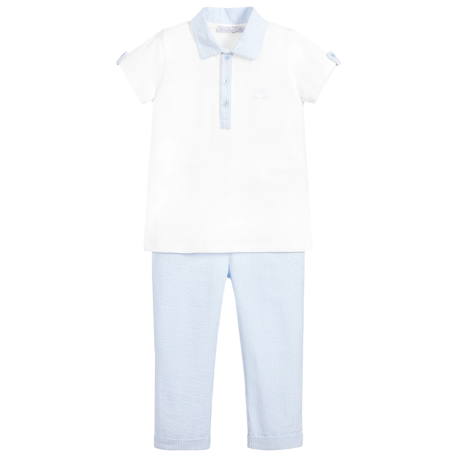 Boys white polo shirt and light blue trousers set by Patachou. The soft cotton piqué top has a car embroidery on the chest. The trousers with turned up cuffs are made in striped cotton seersucker, matching the trims on the top.