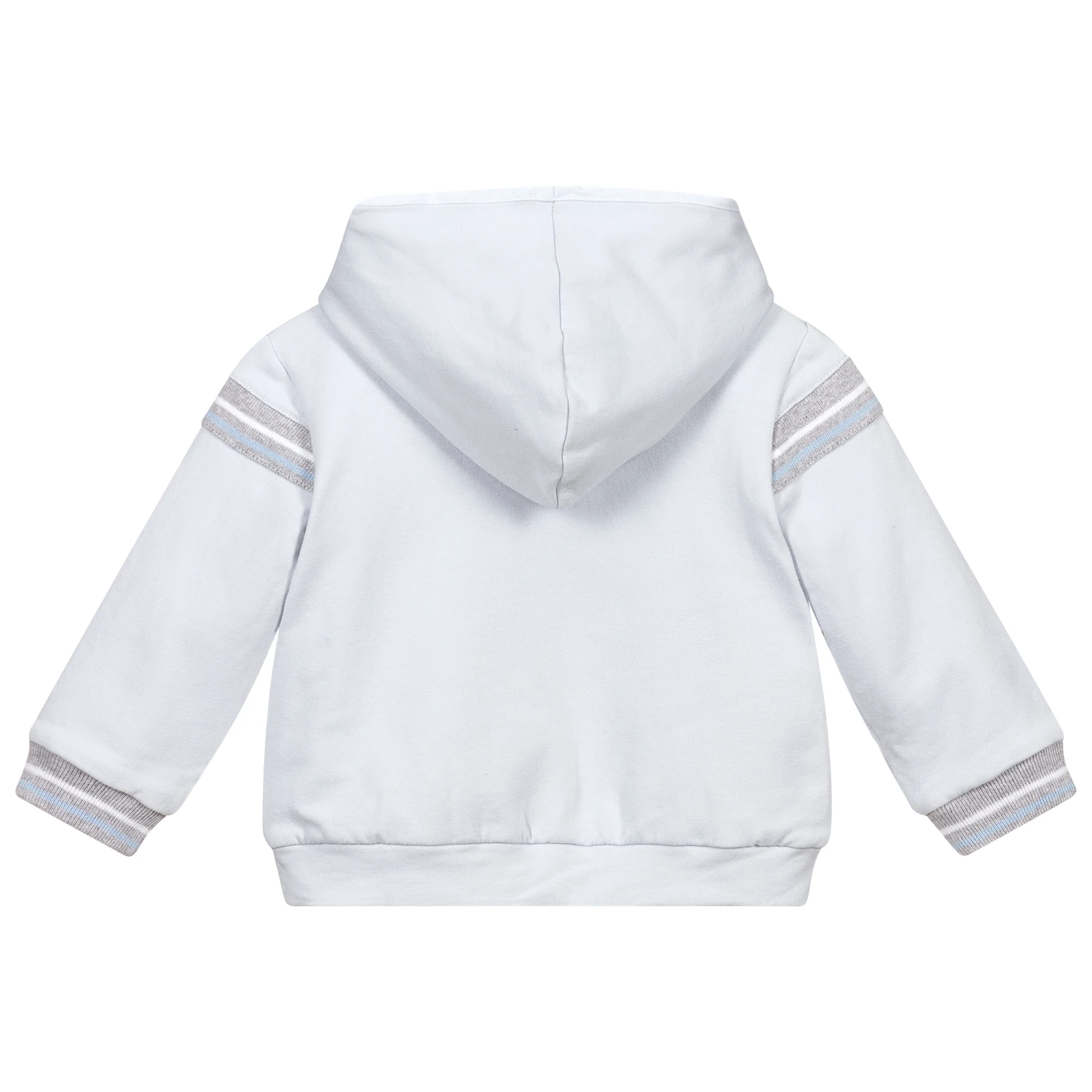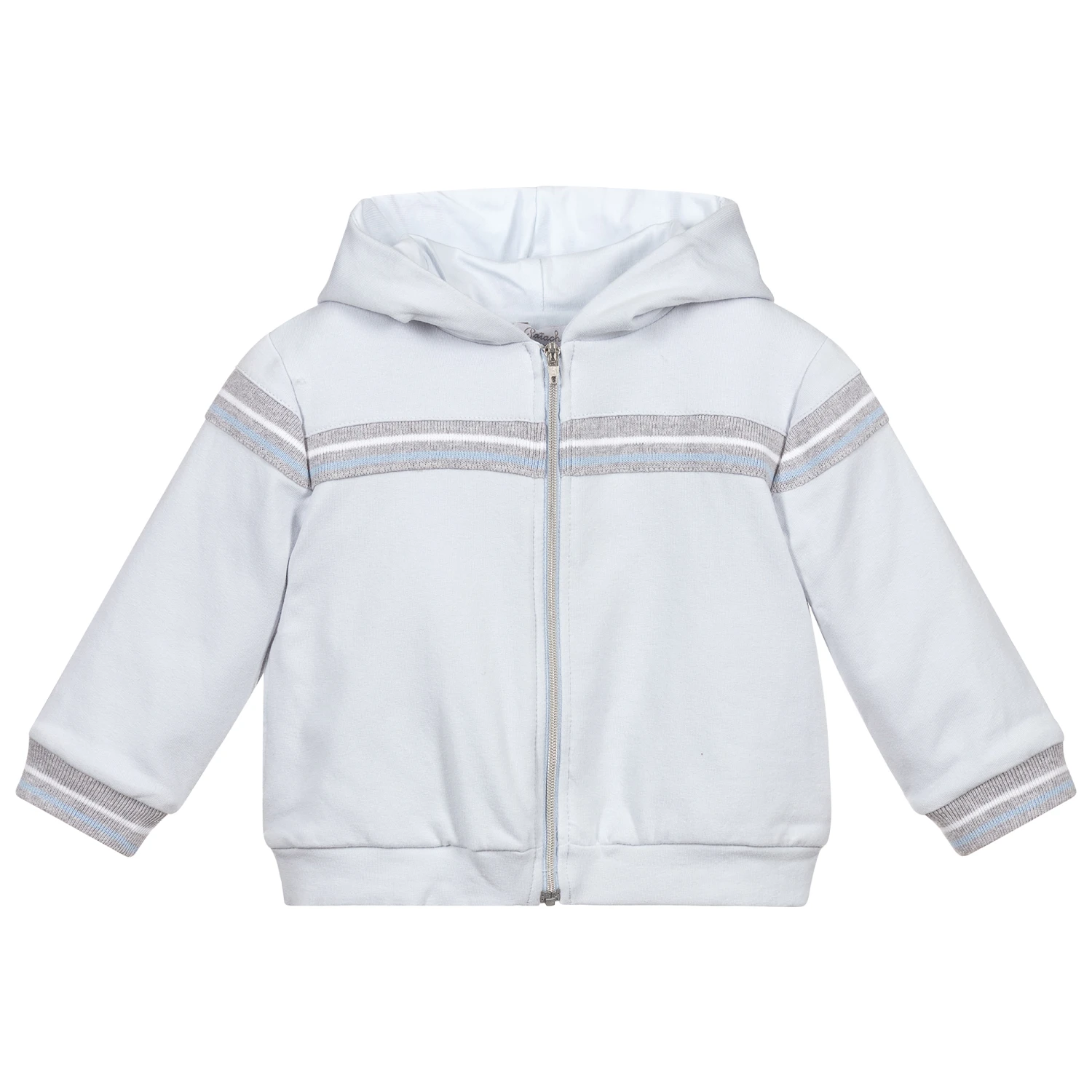 Pale blue zip-up jacket for boys by Patachou. Made in comfortable cotton jersey, it has ribbed trim on the chest, arms and cuffs in grey, pale blue and white. It is fully lined for comfort.