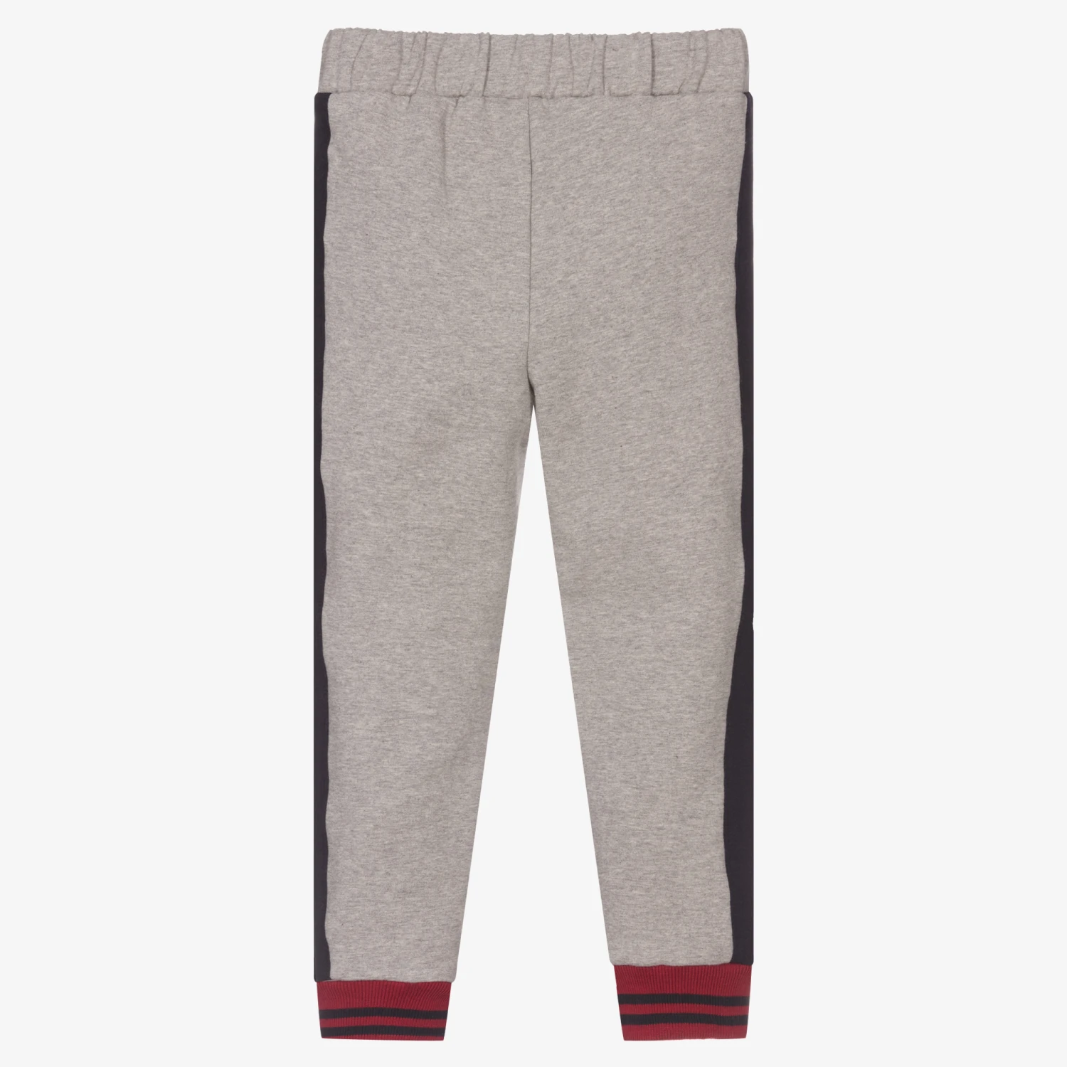 Grey marl joggers for boys by Patachou, made in comfortable, mid-weight cotton jersey. There are concealed front pockets with a ribbon trim and an elasticated drawstring waist for maximum comfort. There is a blue, sporty trim on the sides of the leg finished off with red and blue striped knitted ribbed cuffs.