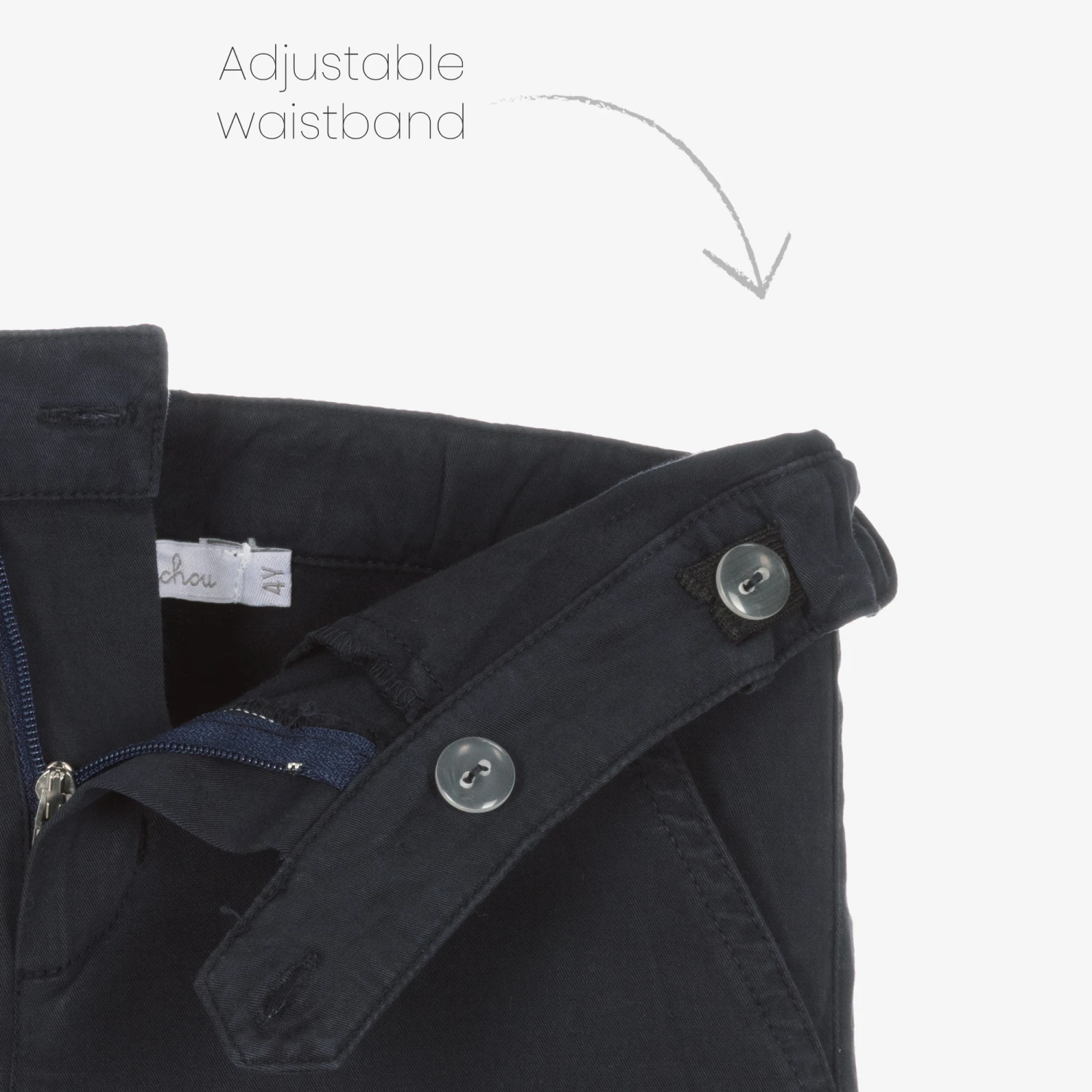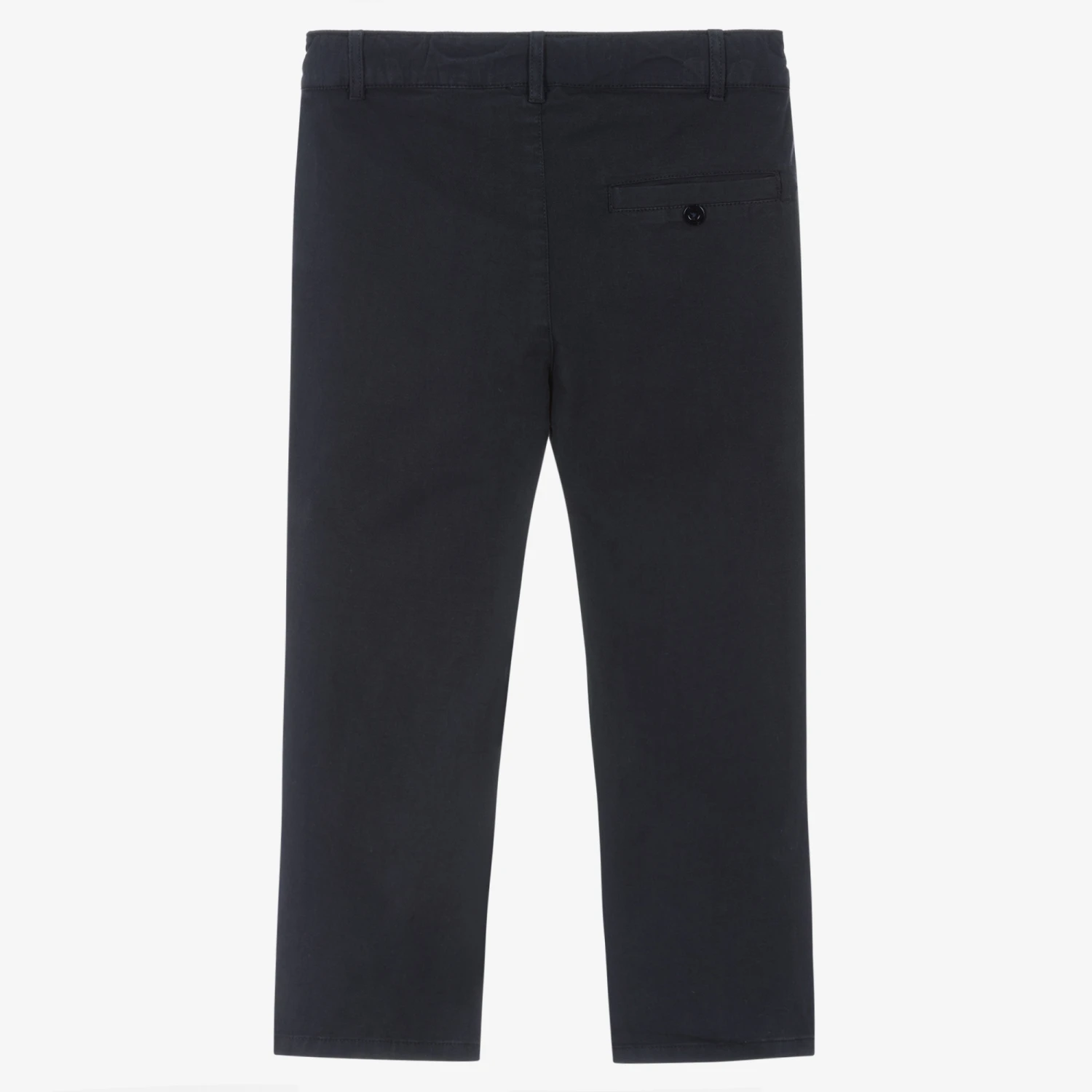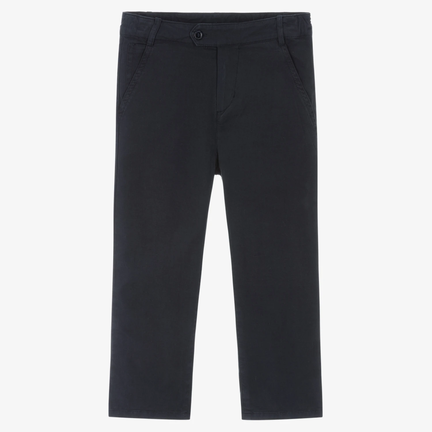 Navy blue chino trousers for younger boys by Patachou, made in cotton twill with added stretch for comfort. In a classic style, these versatile bottoms have an adjustable waist for an ideal fit with a button and zip fastening on the front. There are slanted pockets on the hips and a single welt pocket on the back.