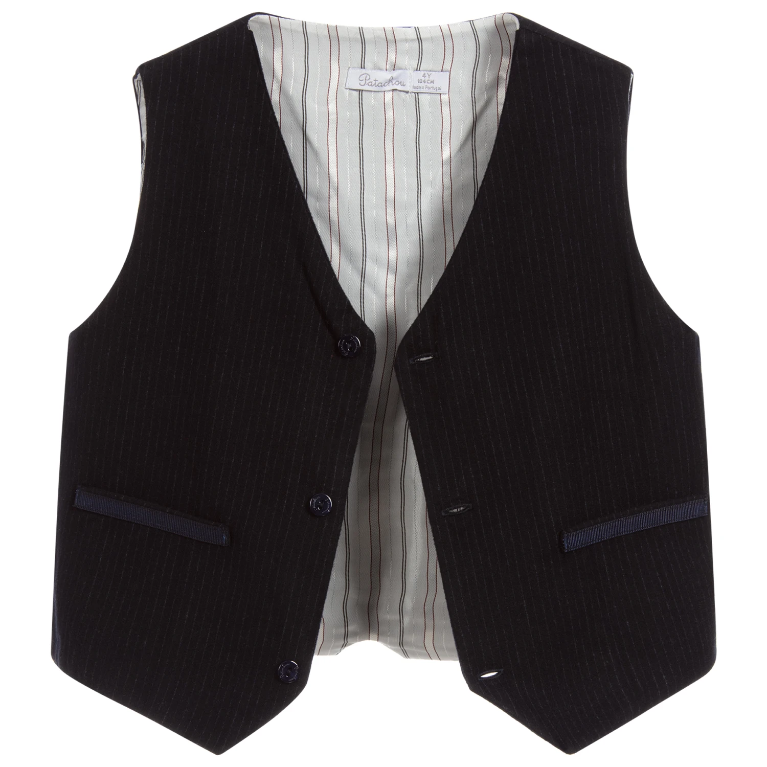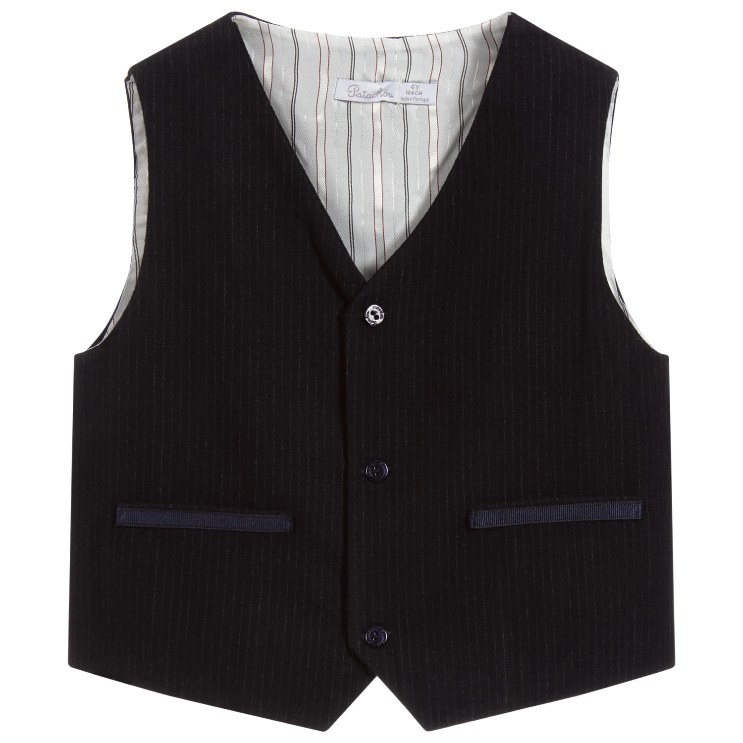 Lightweight, navy blue pin-striped waistcoat for boys by Patachou. Made in a soft viscose blend, with a striped white, silky lining.