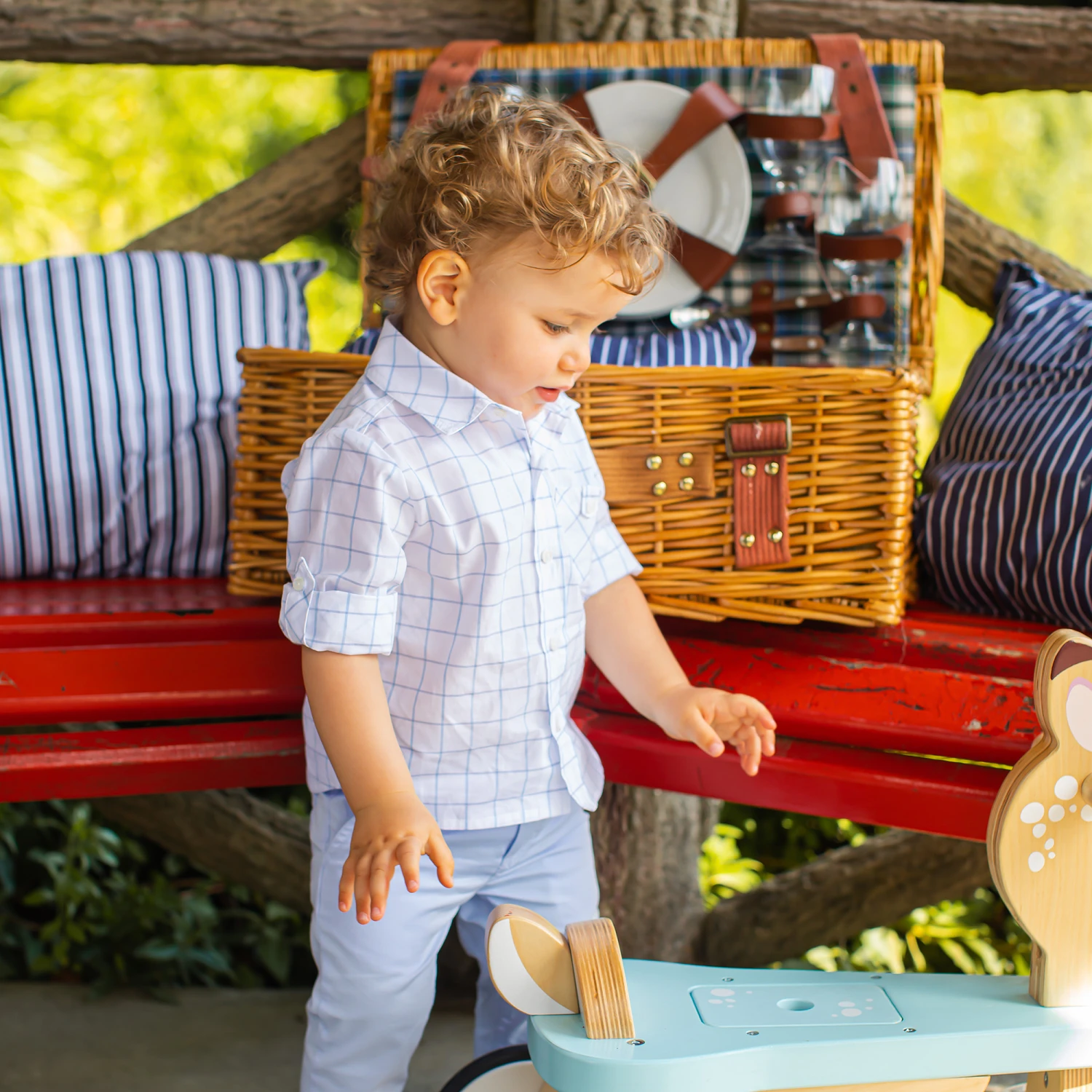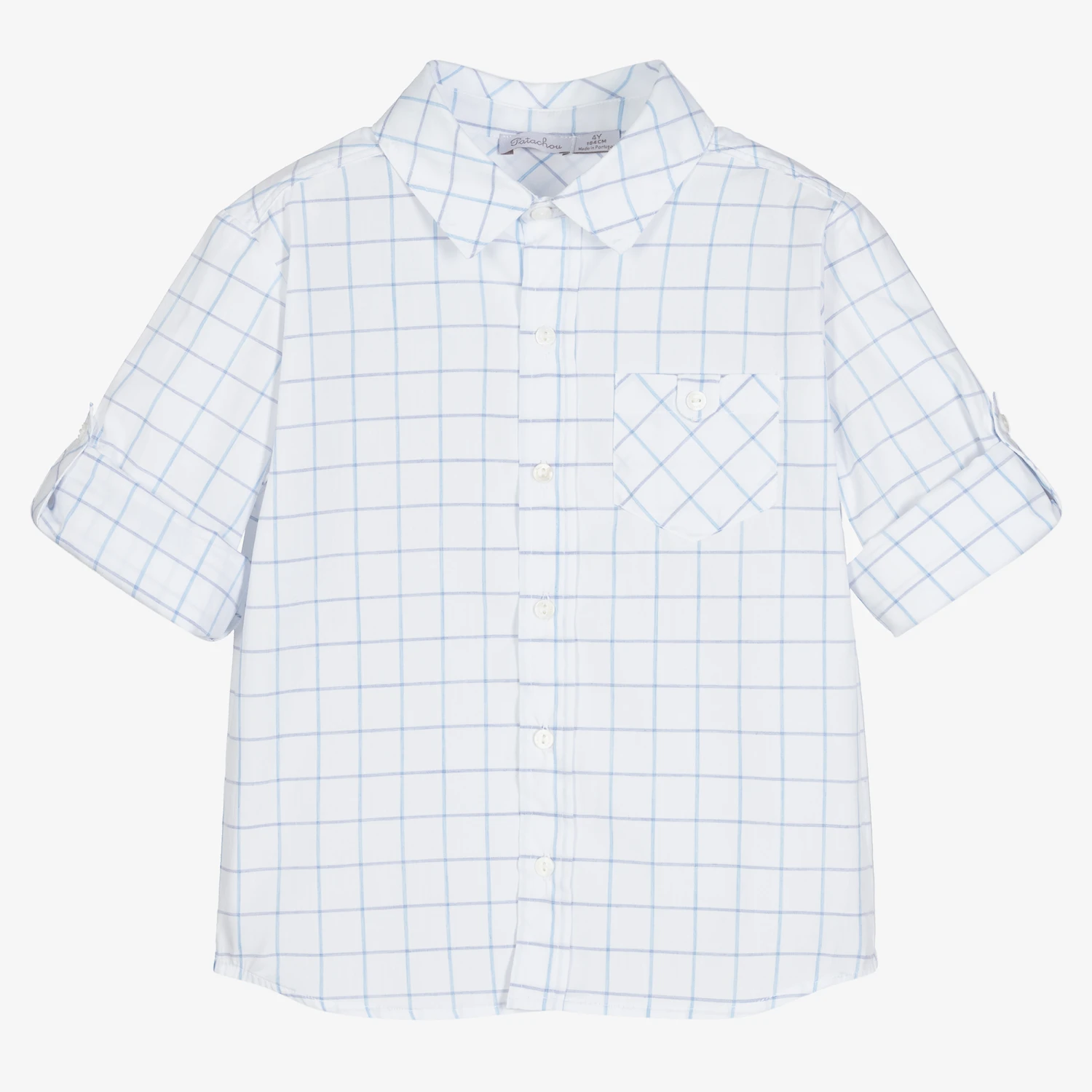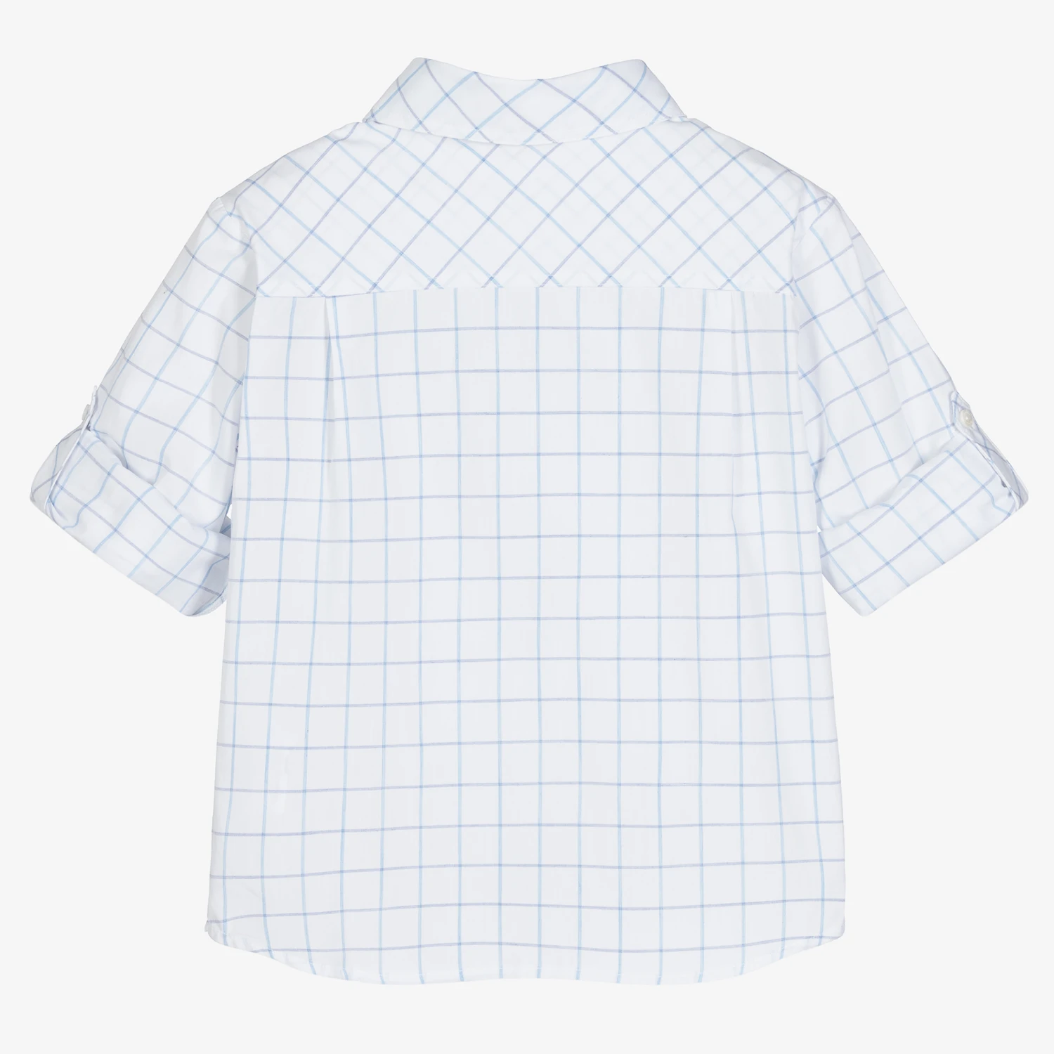 Boys white shirt with pale blue checks by Patachou, made in comfortable cotton poplin. It has logo button fastenings and a decorative logo button and tab on the chest pocket. The sleeves can roll up and be secured with a button and tab.