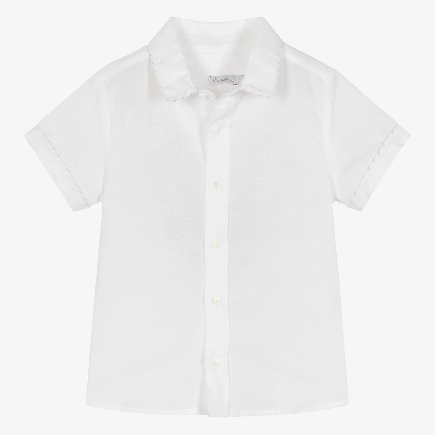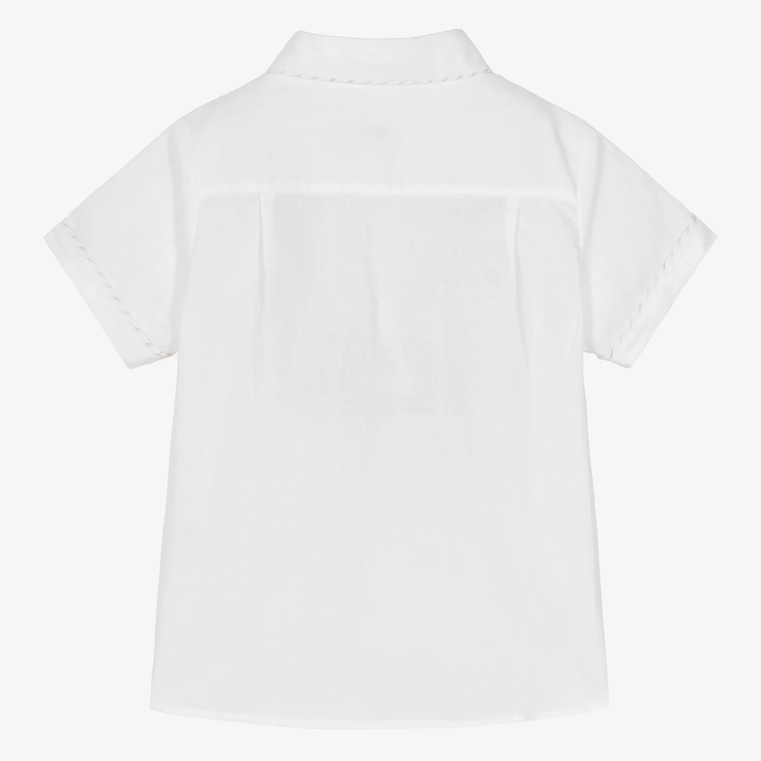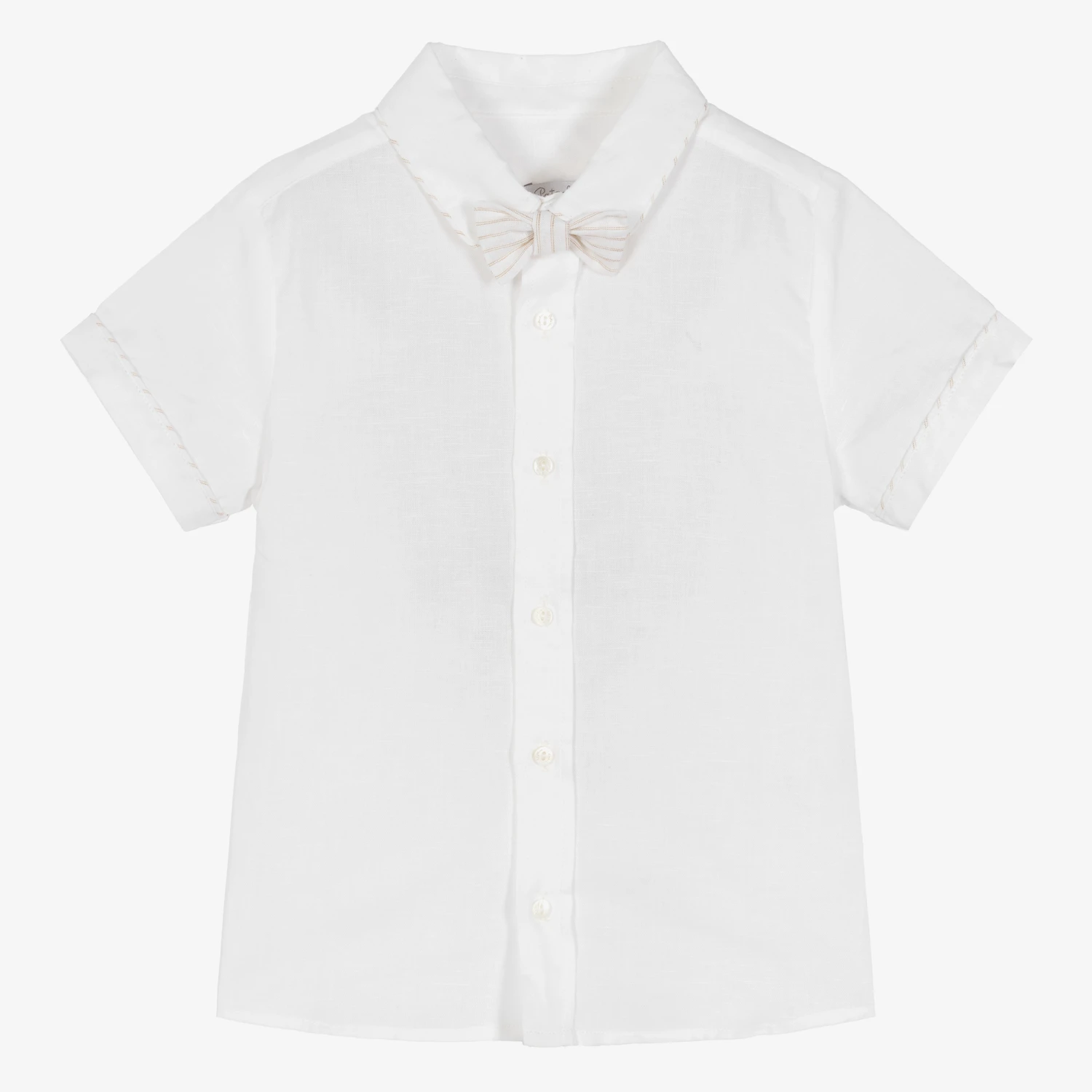 Smart white shirt for boys by Patachou, made in a lightweight cotton and linen blend. It has beige striped trims and a matching, detachable bow tie.