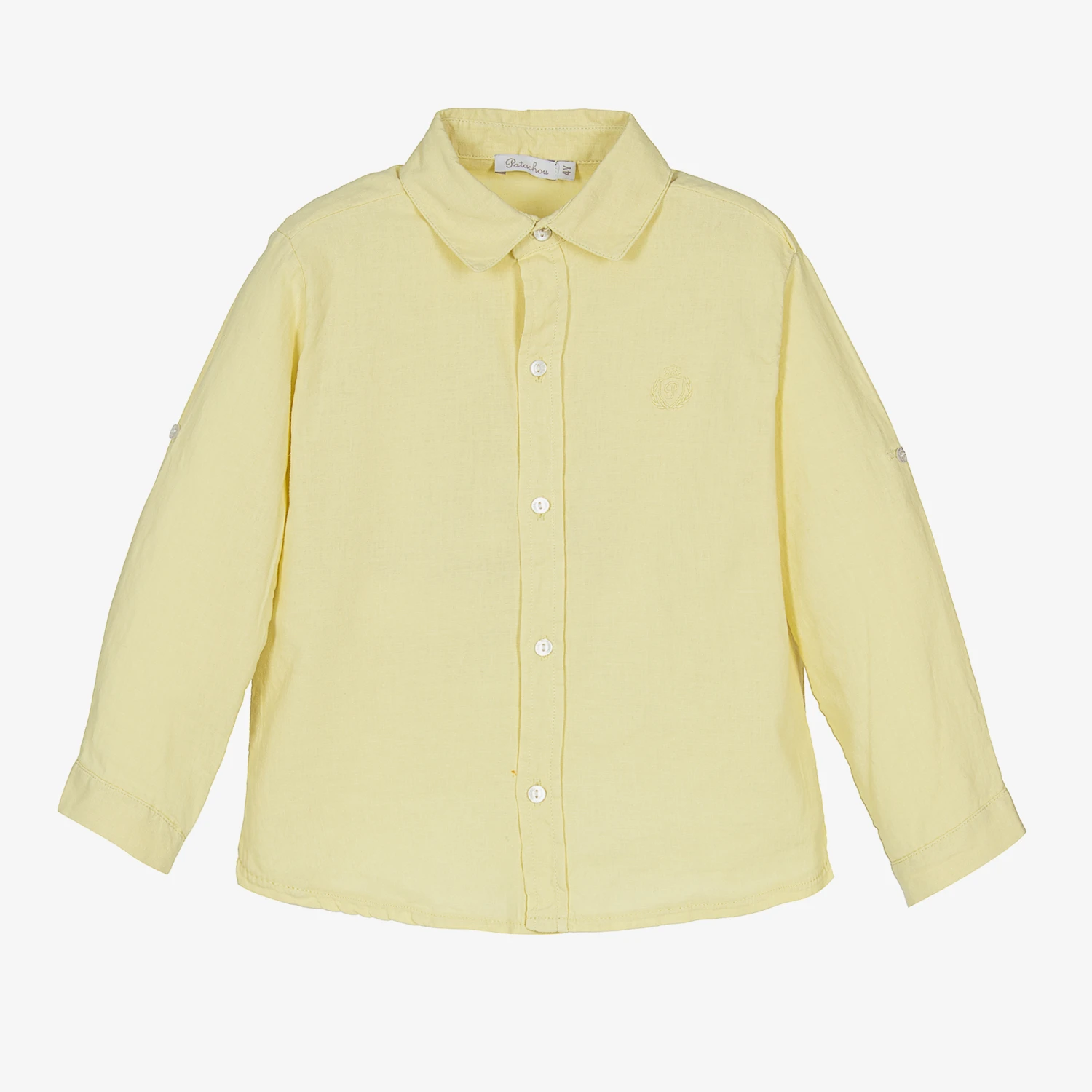 Boys classic yellow shirt from Patachou. Soft, breathable and lightweight, it is woven in cotton and linen for comfort in warm weather. This smart shirt has button tabs on the long sleeves, allowing the cuffs to be rolled up to keep cool. Subtle tone-on-tone branding is embroidered on the chest.
