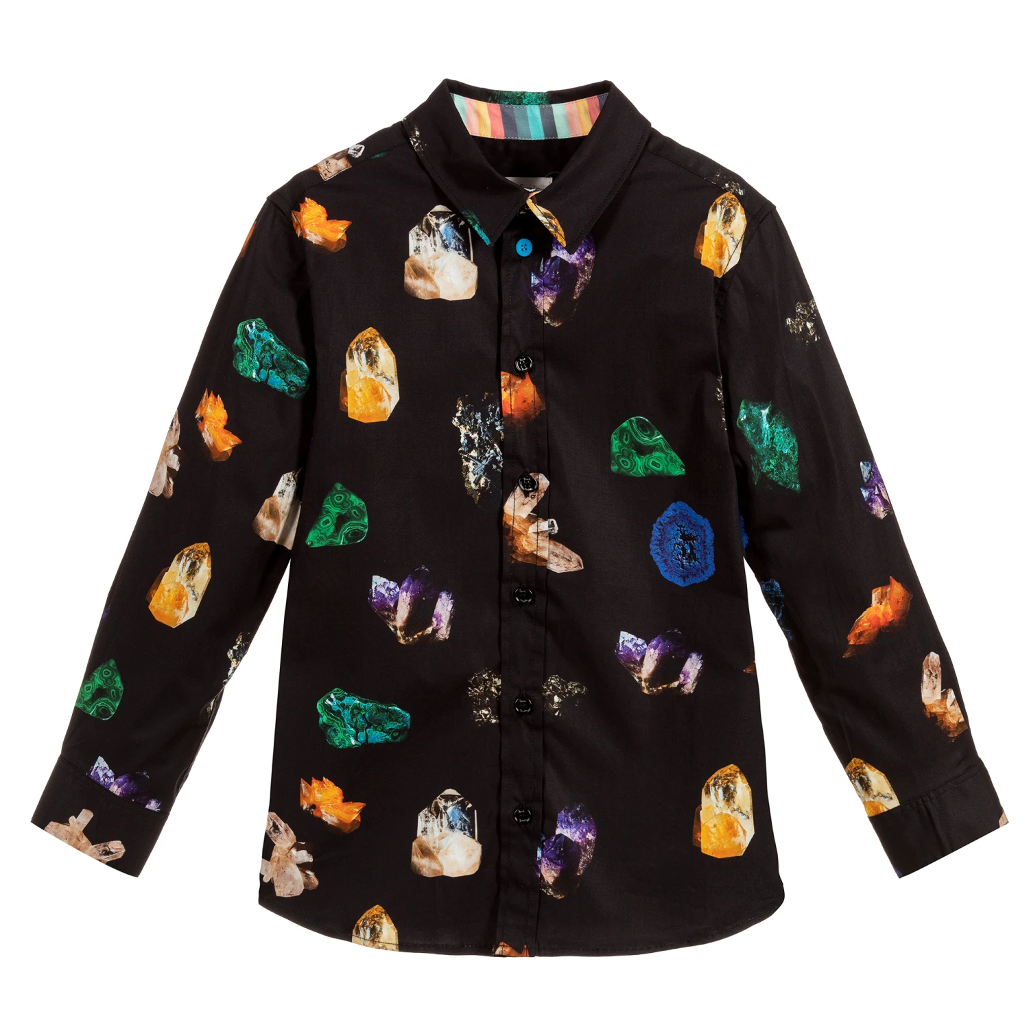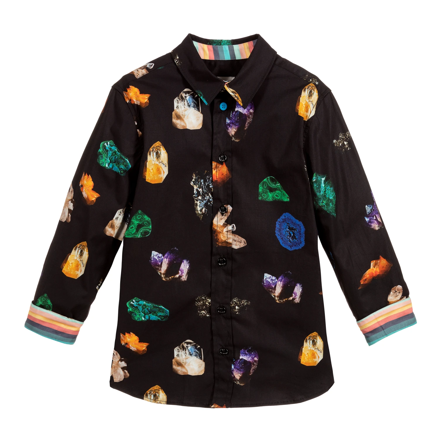 Boys black Mini-me shirt from Paul Smith Junior, with a colourful gem pattern. It is made in soft cotton, with front button fastening.