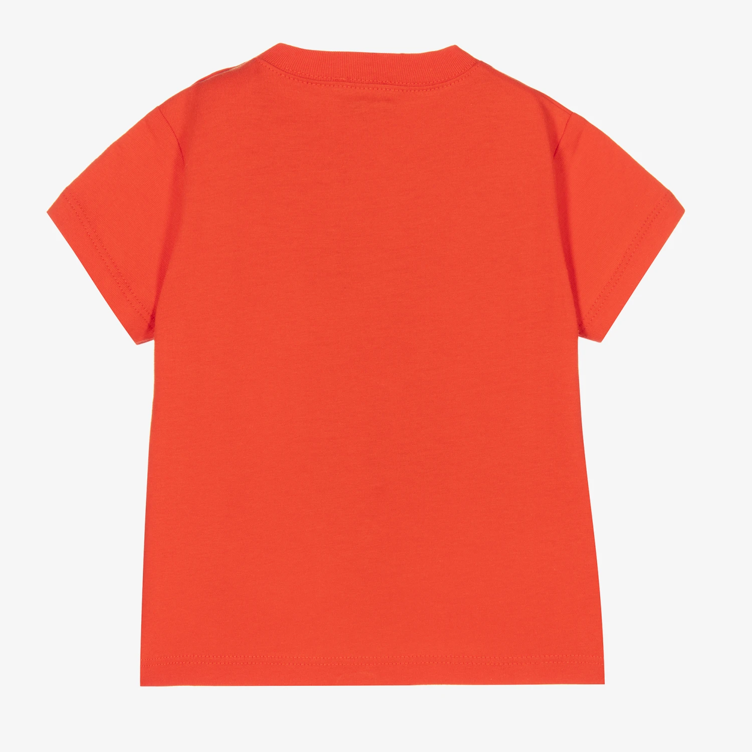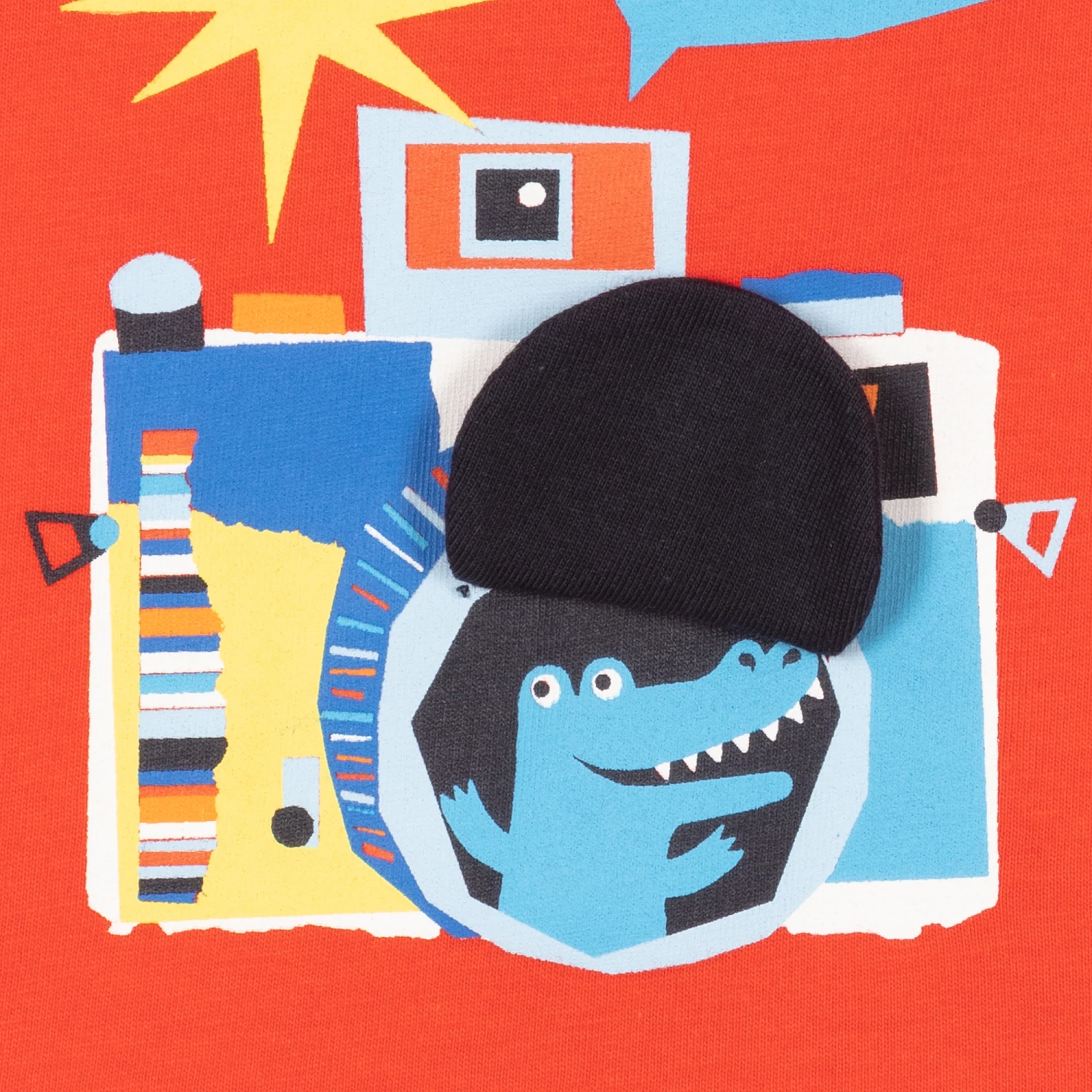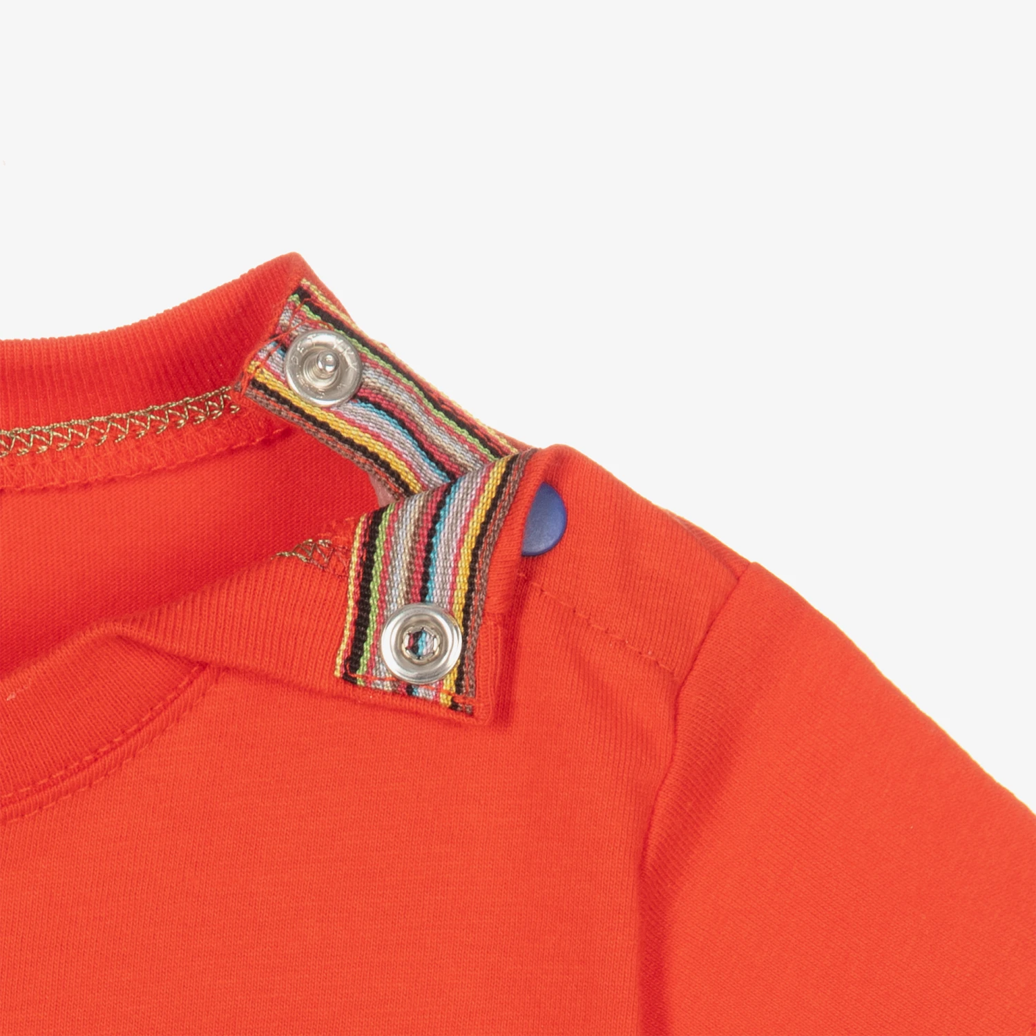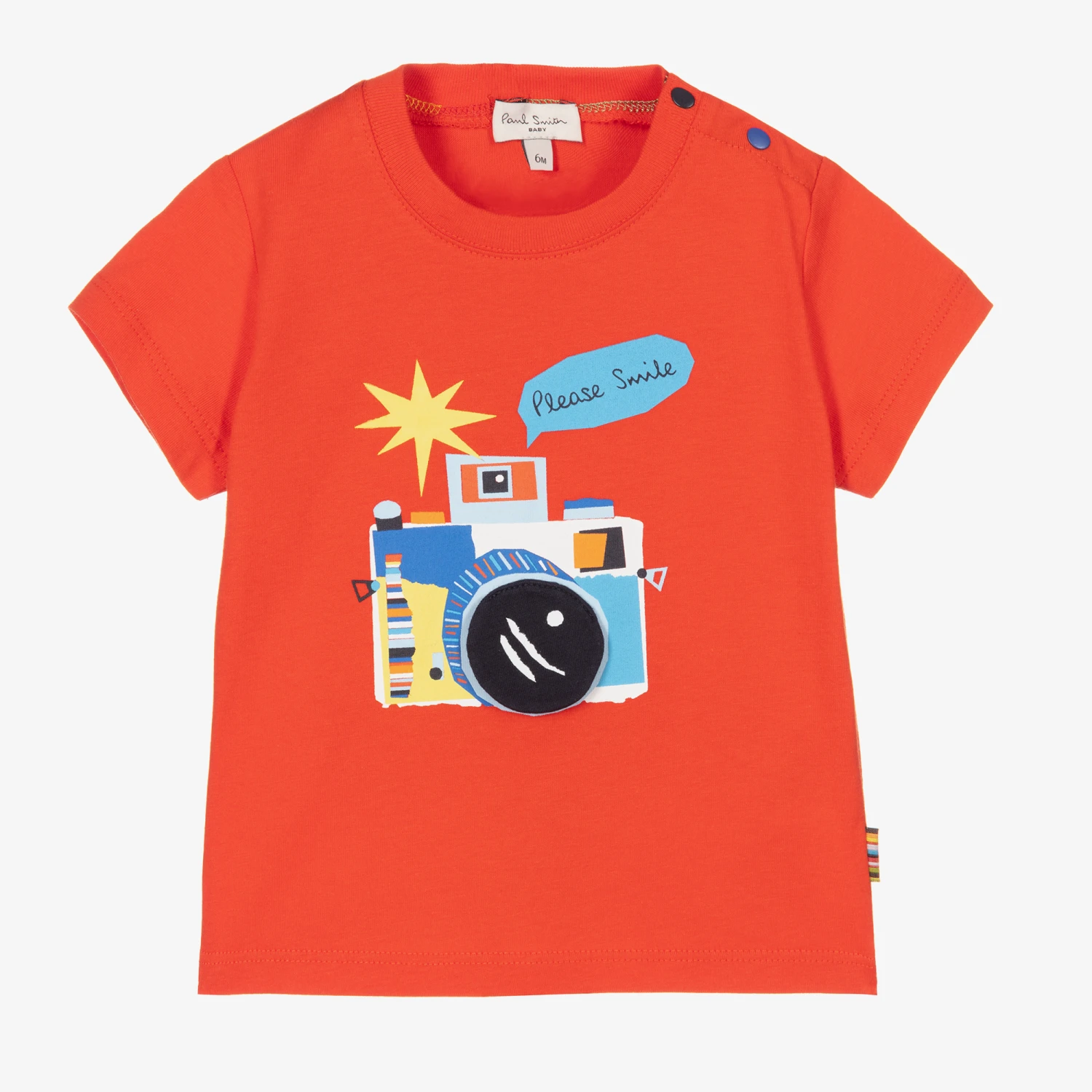 Little boys organic cotton T-shirt by Paul Smith Junior in bright red. The front has a fun camera Croc character appliqué and popper fastenings on one shoulder. The designer’s signature striped logo tag is stitched on the side seam.