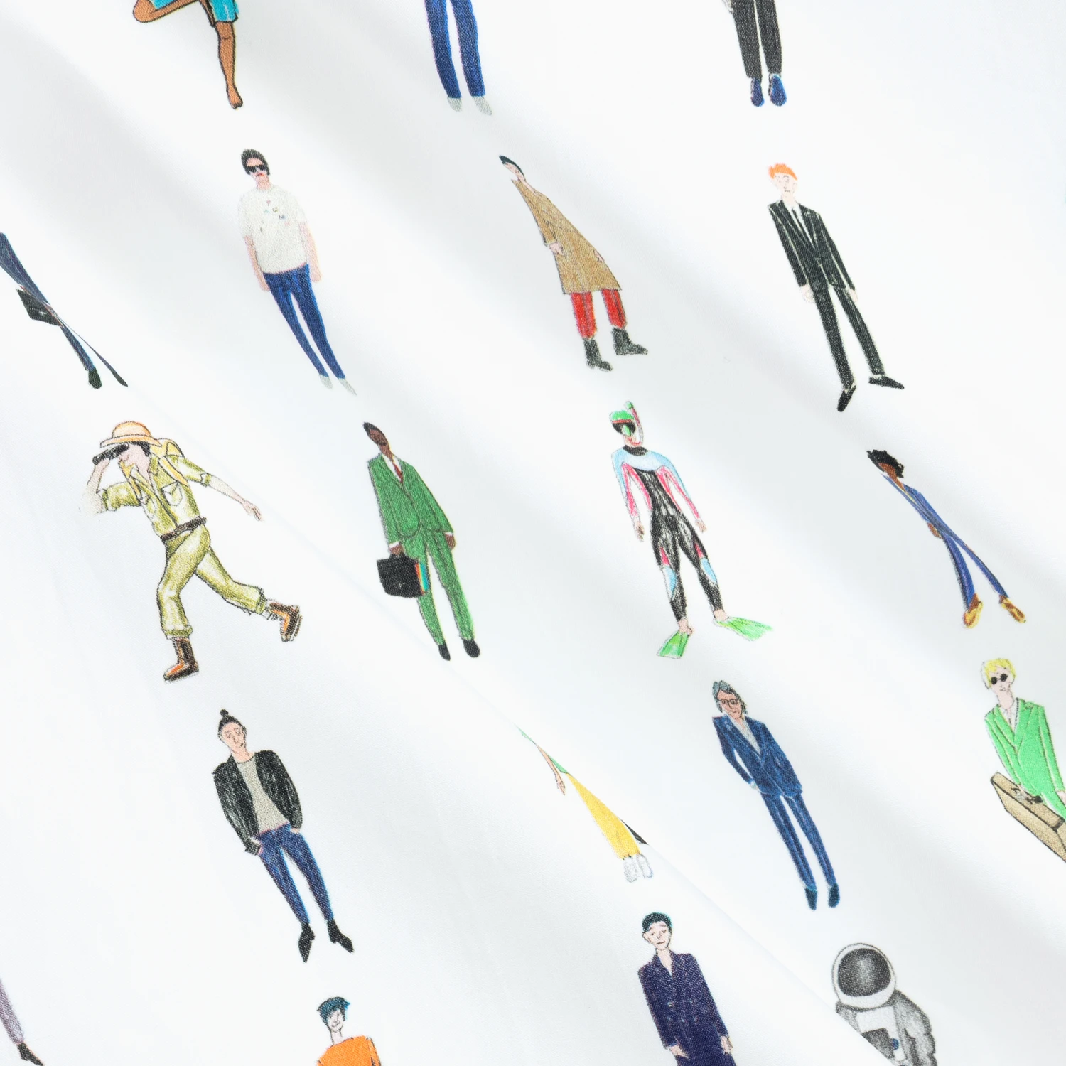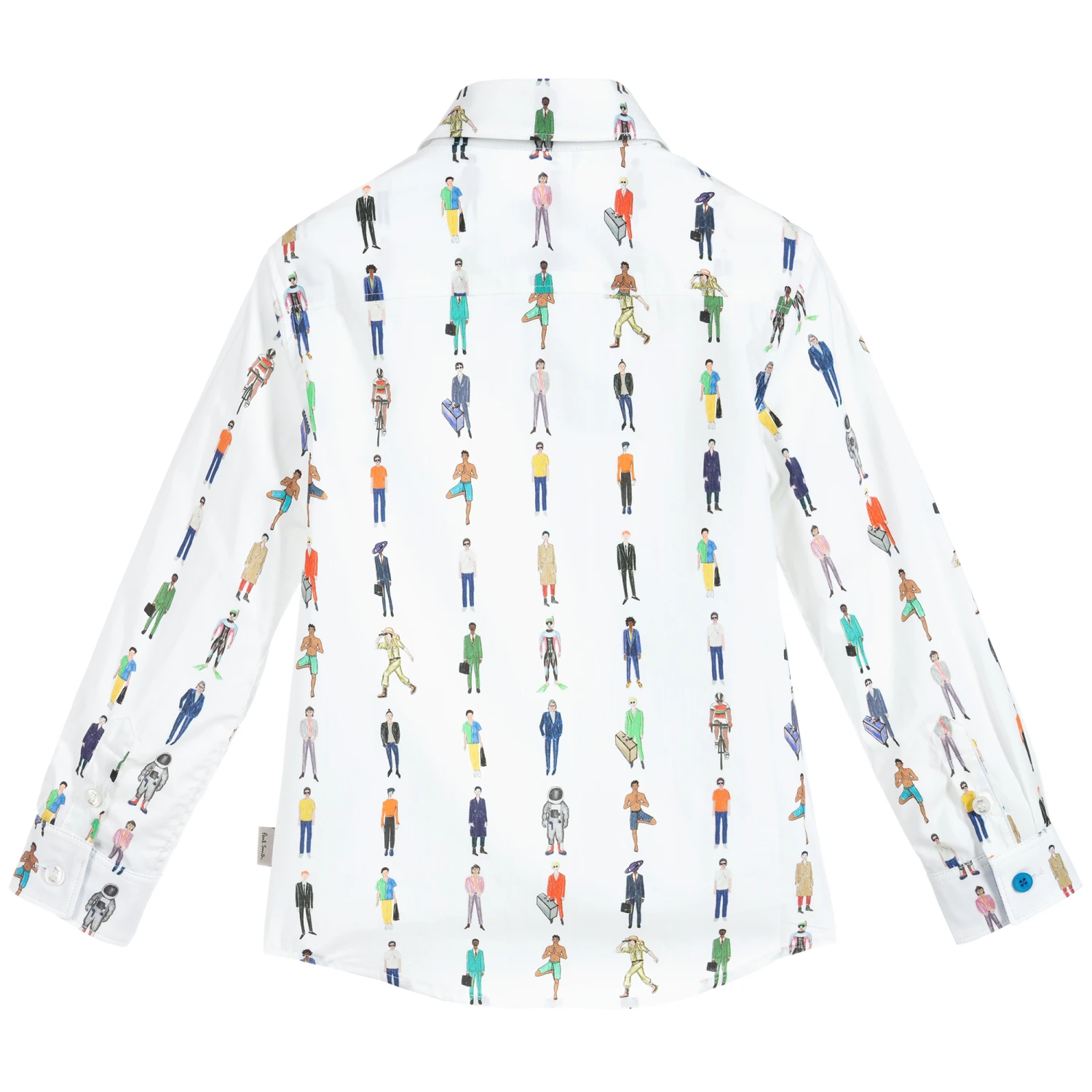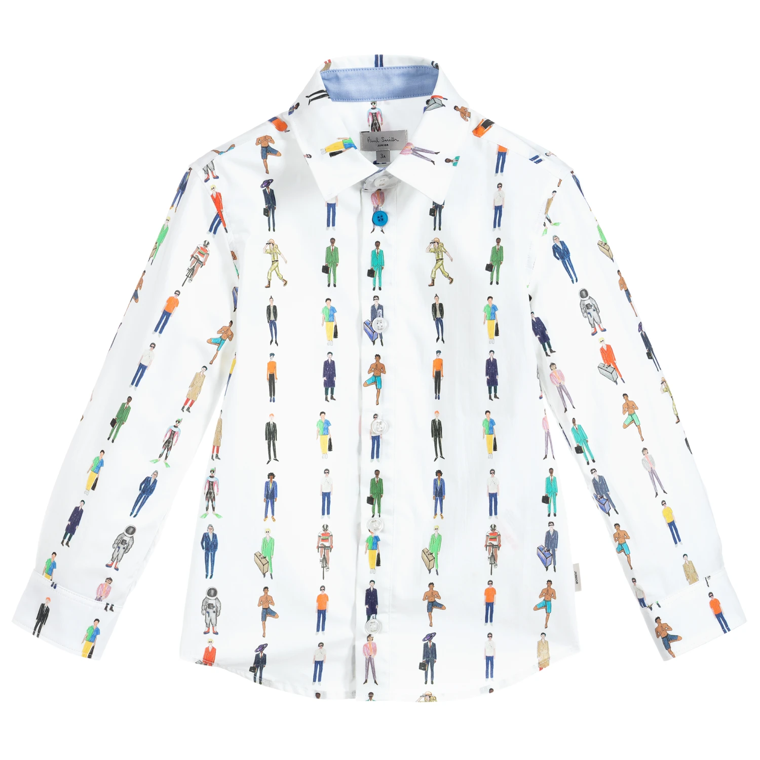 Boys white shirt by Paul Smith Junior, with a colourful people print. It is made in lightweight cotton and fastens with buttons.
