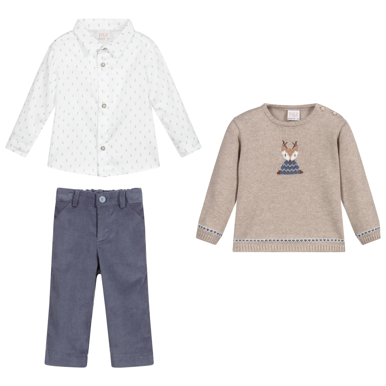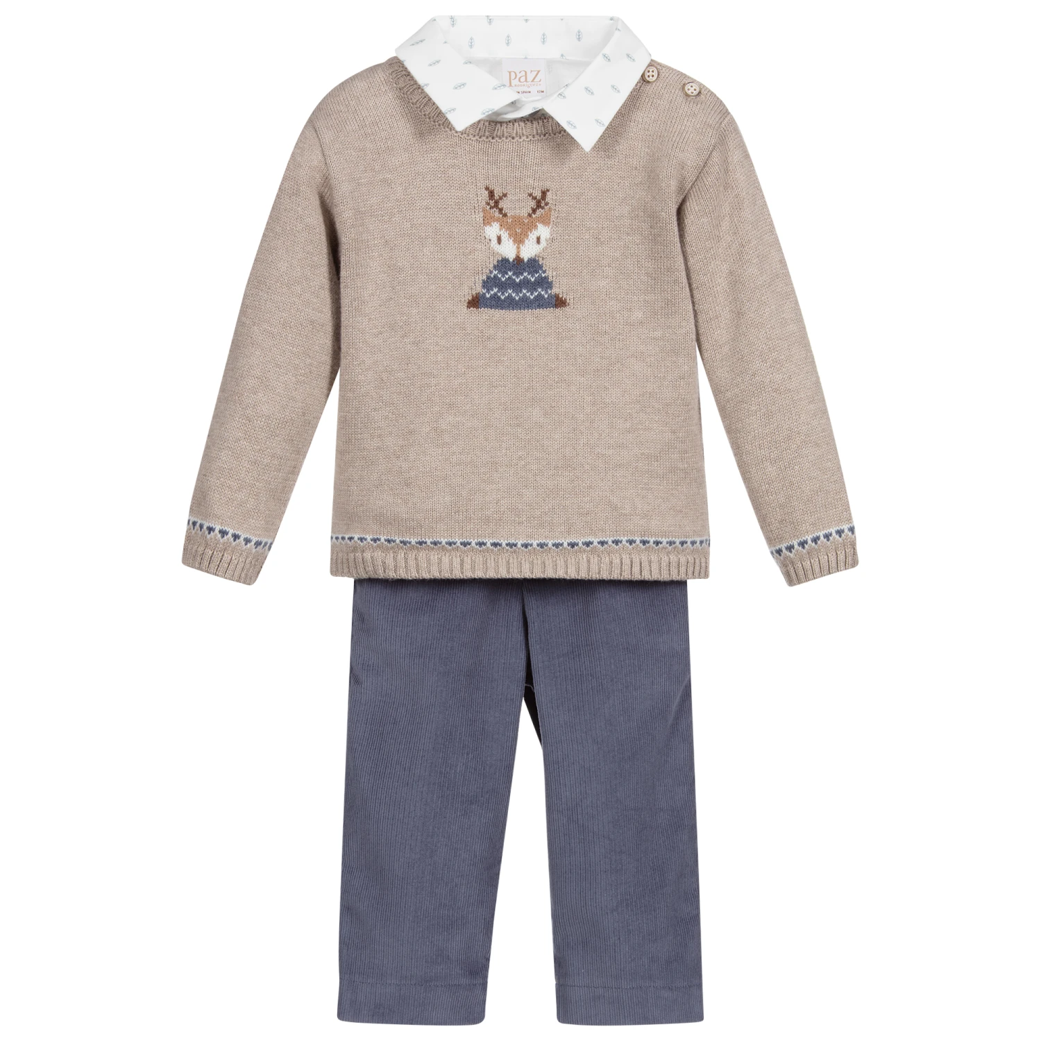Younger boys outfit set by Paz Rodriguez. The white cotton shirt has a blue leaf print and fastens with branded buttons. The beige jumper is made in a softly knitted cotton and cashmere blend with a reindeer motif in blue, beige and white. Blue trousers in soft corduroy complete the set. They have side pockets, zip and button fastening and an adjustable waistband.