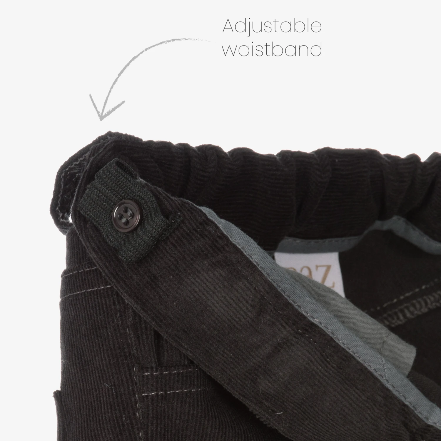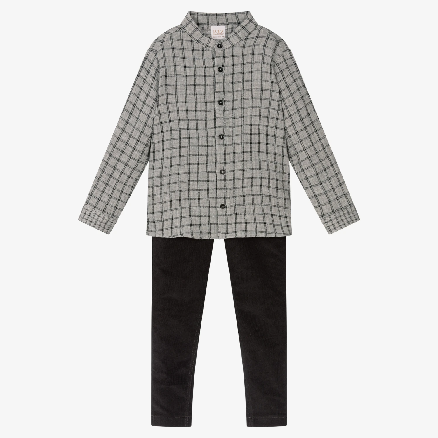 A smart-casual grey shirt and trouser set for boys by Paz Rodriguez. The light grey check shirt is made in soft cotton cheesecloth and fastens with buttons on the front. The dark grey corduroy trousers are in a classic five-pocket style, with an elasticated adjustable waistband for a comfortable fit, and a zip and branded button fastening.