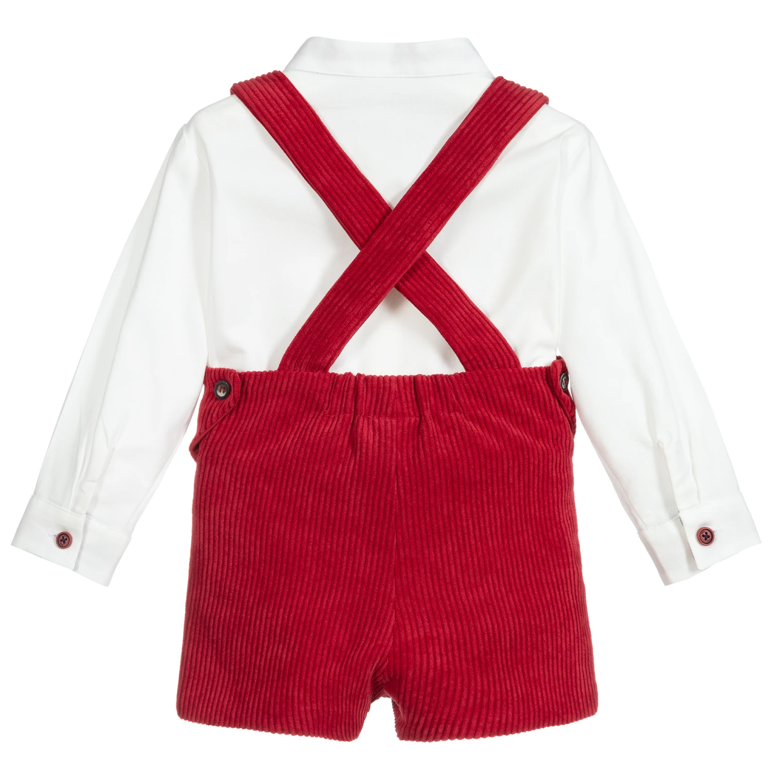 Red and ivory shirt and shorts set for little boys by Paz Rodriguez. The collarless shirt has internal tartan trims and button fastenings. The red dungaree shorts are made in soft chunky corduroy.