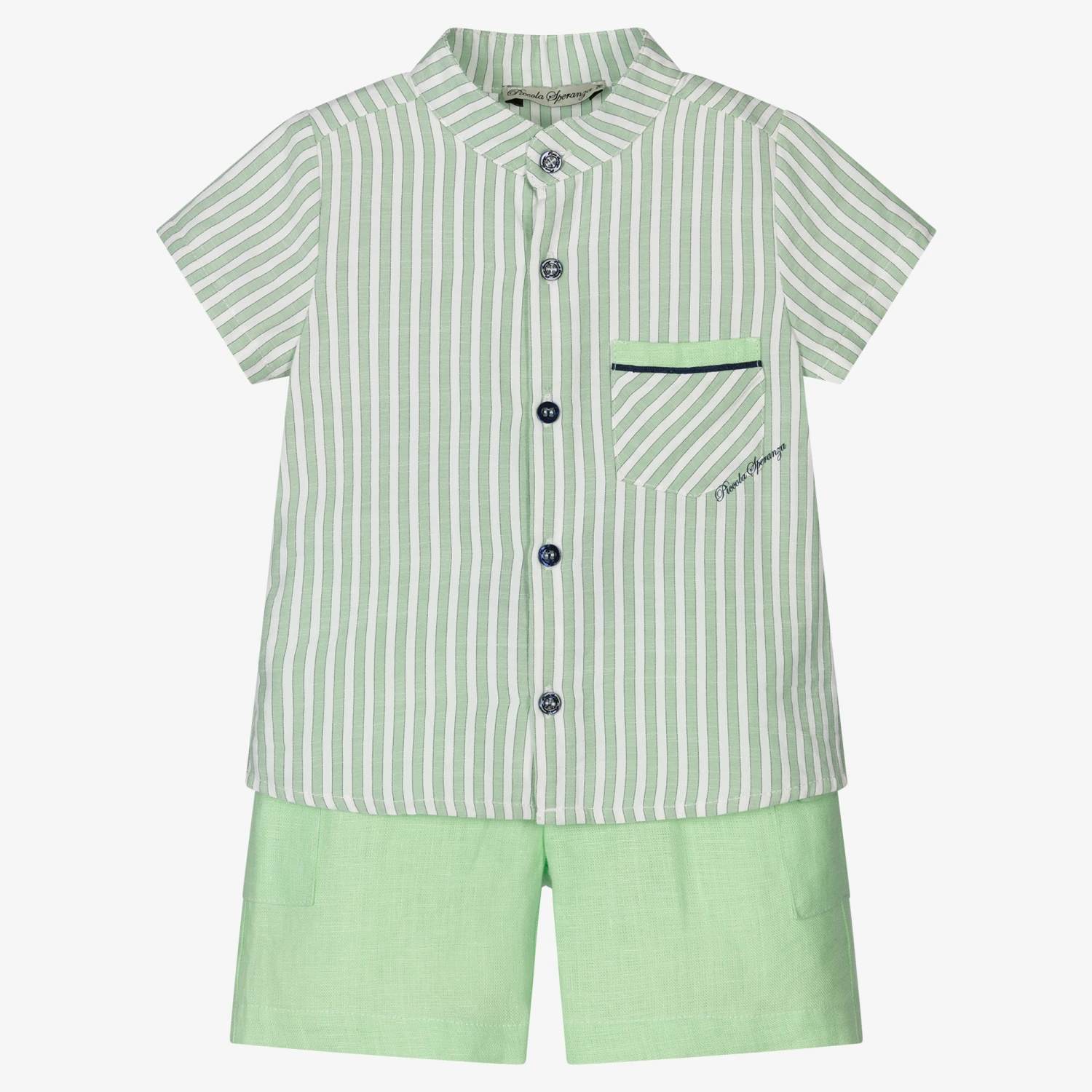 Casual and comfortable two-piece shorts set for boys by Piccola Speranza. The linen shorts have button fastening flap pockets at the sides, with an elasticated waist with a navy blue drawstring. The collarless striped shirt is made in lightweight cotton and has front button fastenings. There is matching linen trim on the chest pocket, with the brand’s logo name printed below.