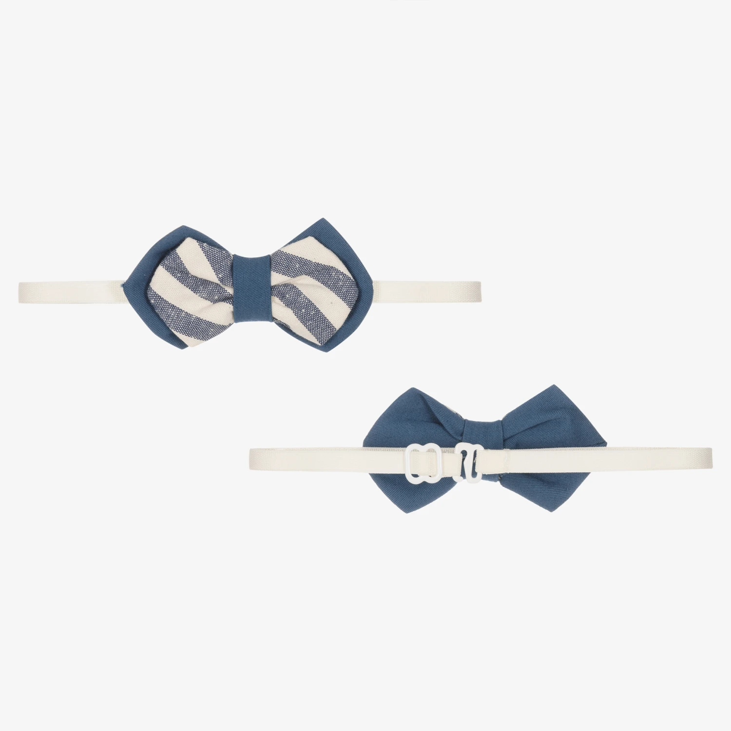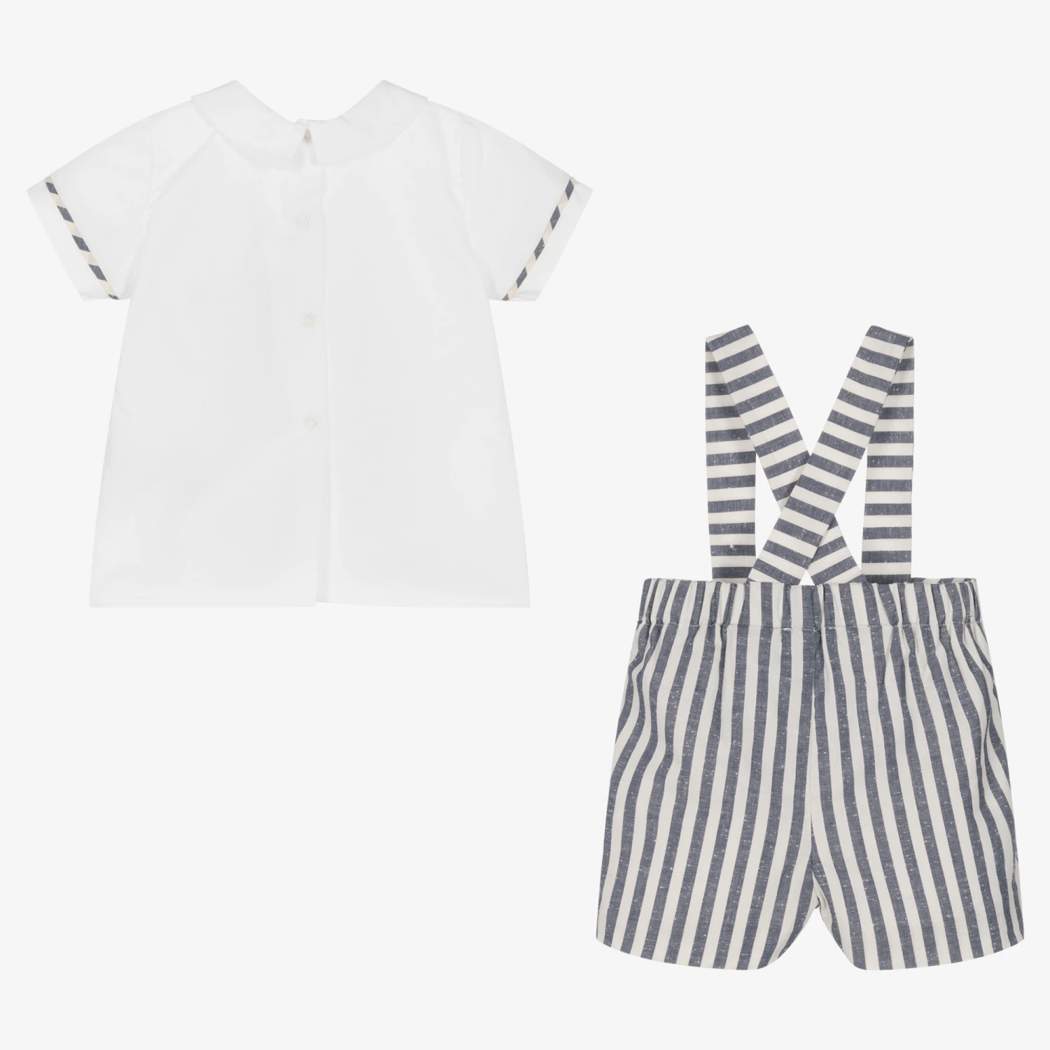 White and navy blue striped shorts set for little boys by Piccola Speranza. Made in organic cotton and fully lined, the shorts have adjustable button-fastening shoulder straps and a comfortable elasticated waistband. The smart white cotton shirt has decorative covered buttons on the front and trims to match the shorts. It fastens with poppers on the back and comes with a cute bow tie to complete the look.