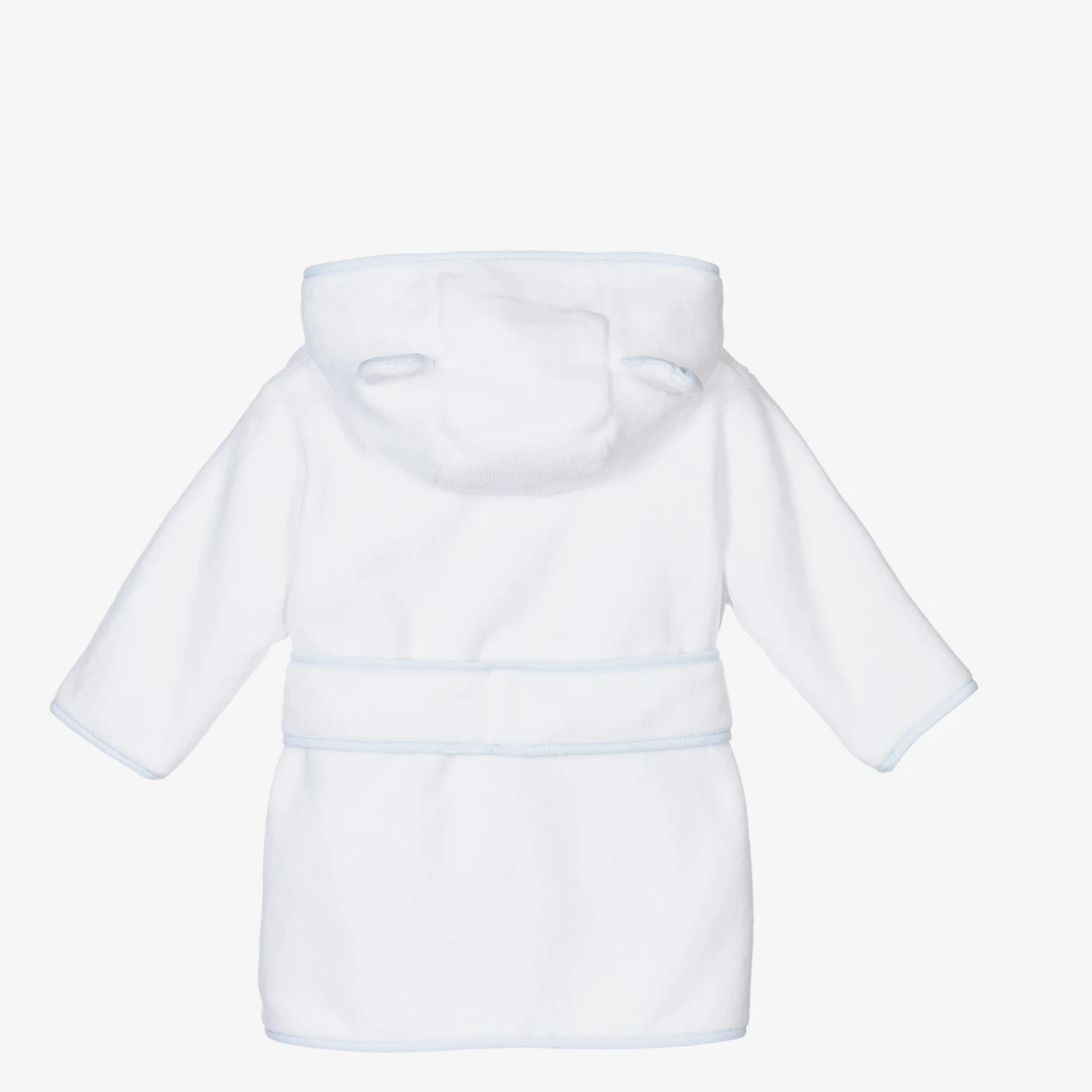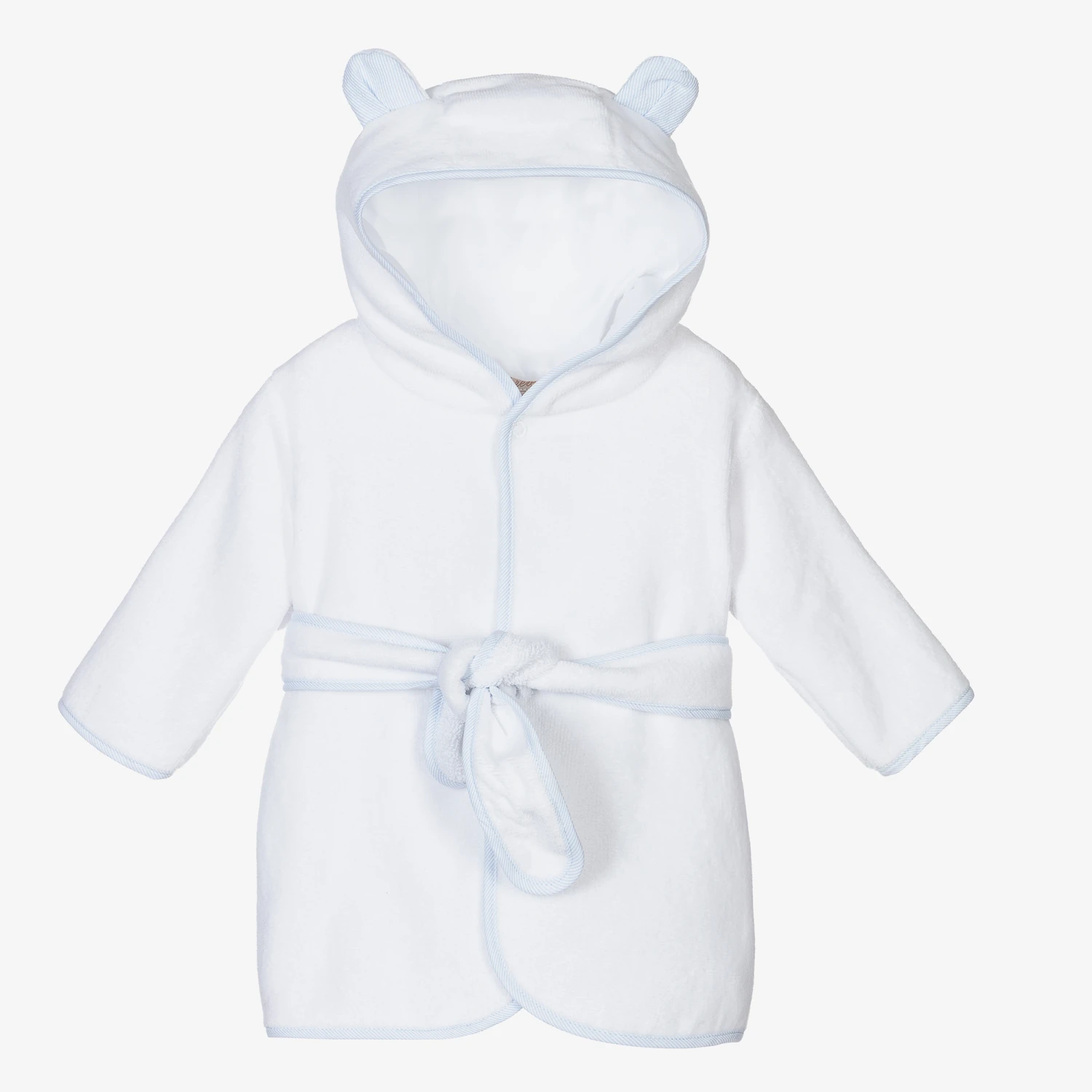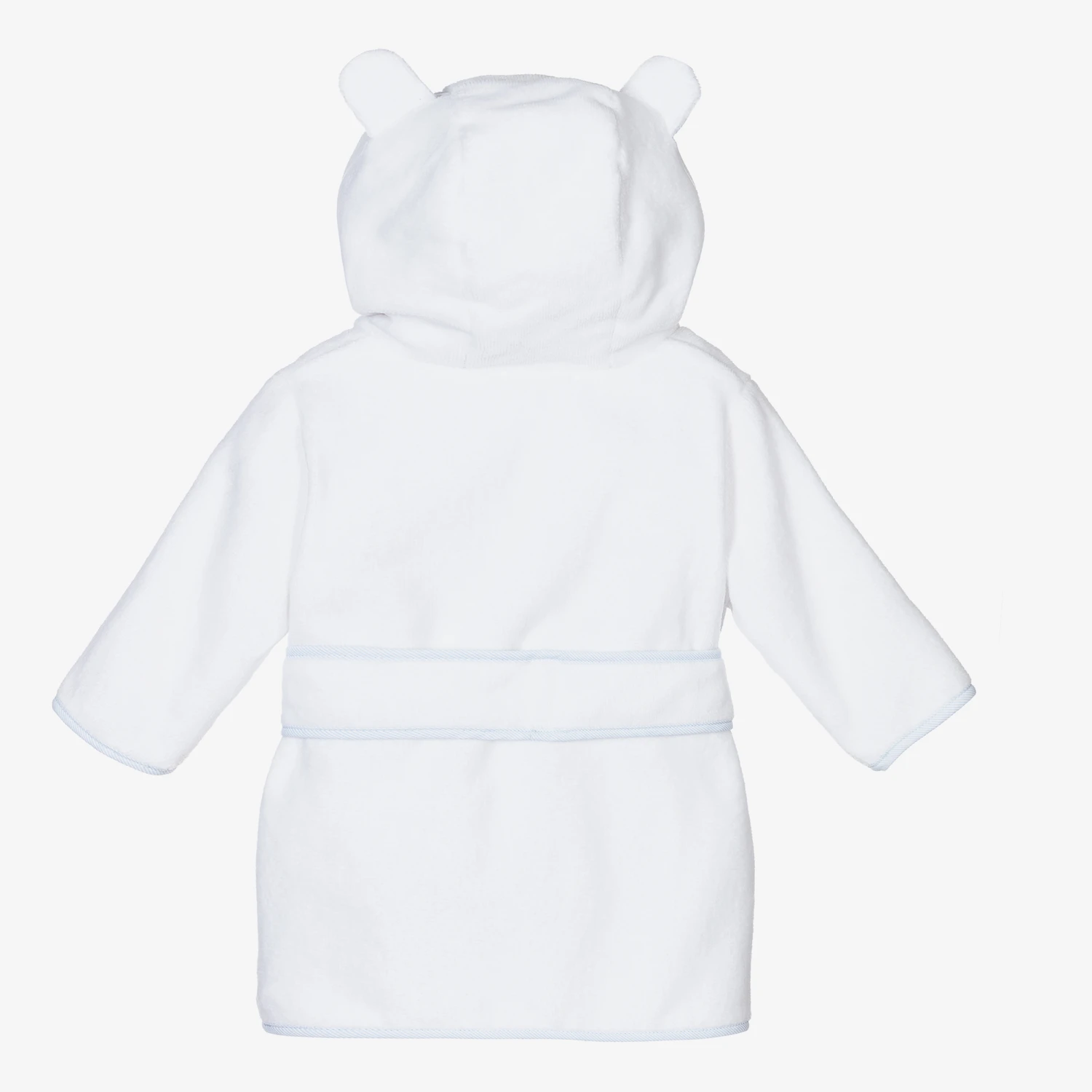 White bathrobe for younger boys by Pureté Du… Bébé, made in comfortable, absorbent cotton towelling trimmed in pale blue and white stripes. The hood is lined with jersey and has cute ear appliqués. It has a popper fastening under the chin and an attached sash belt.
