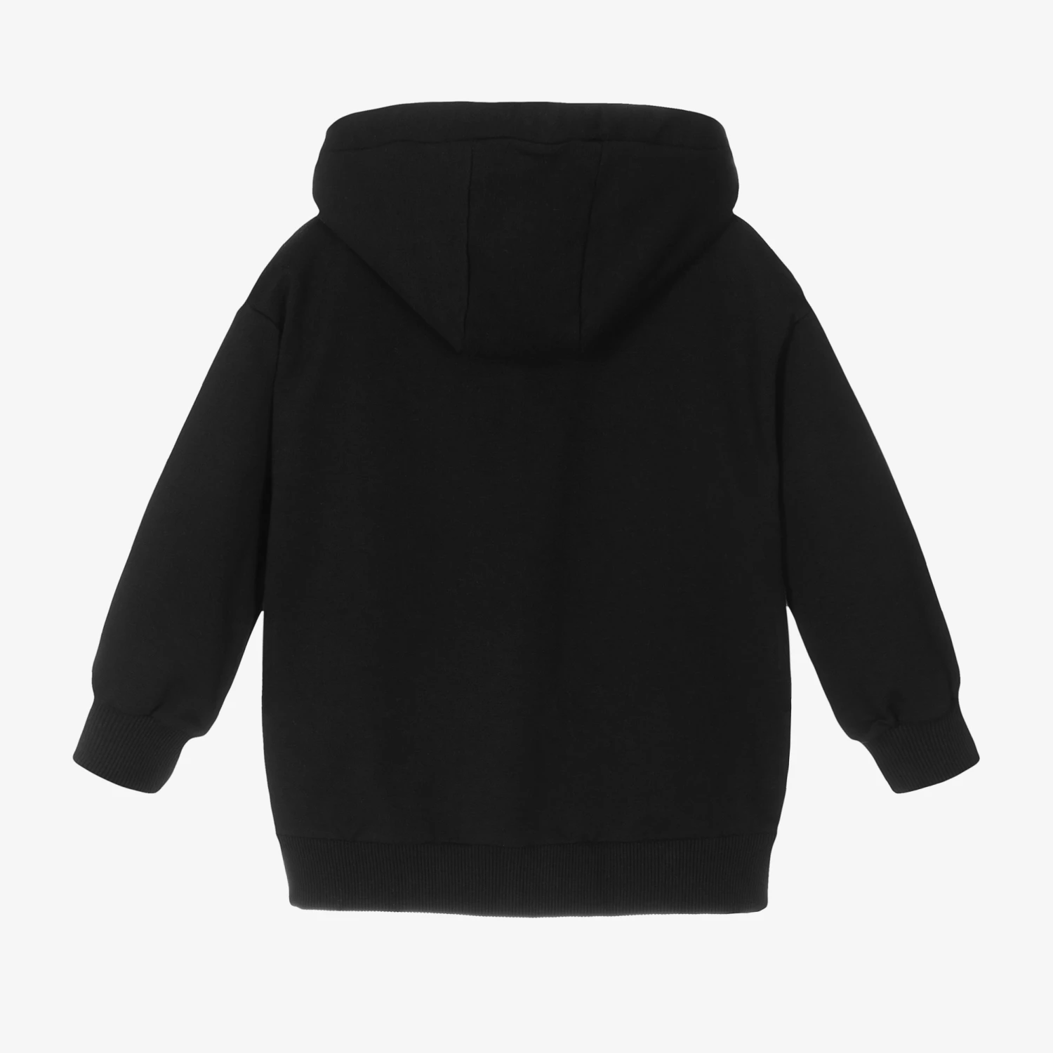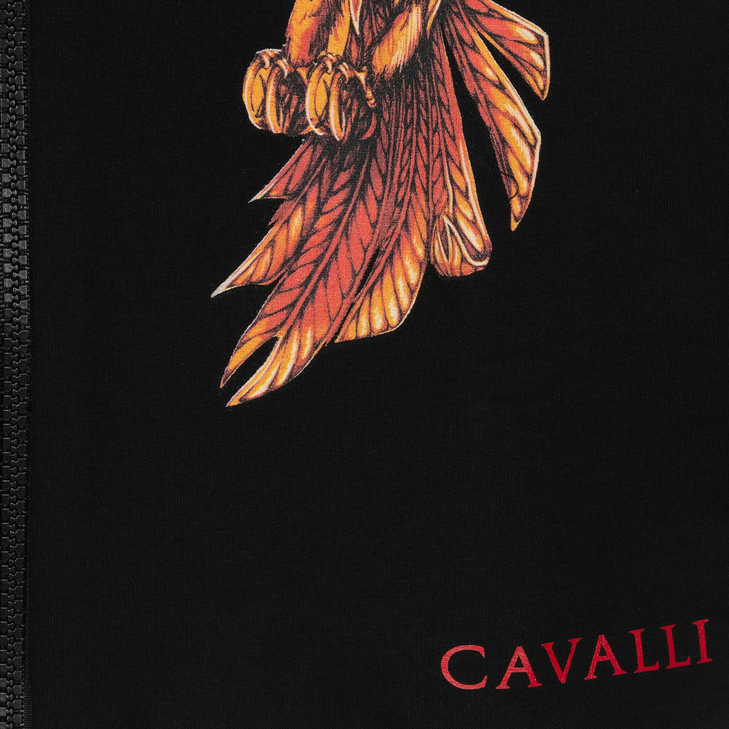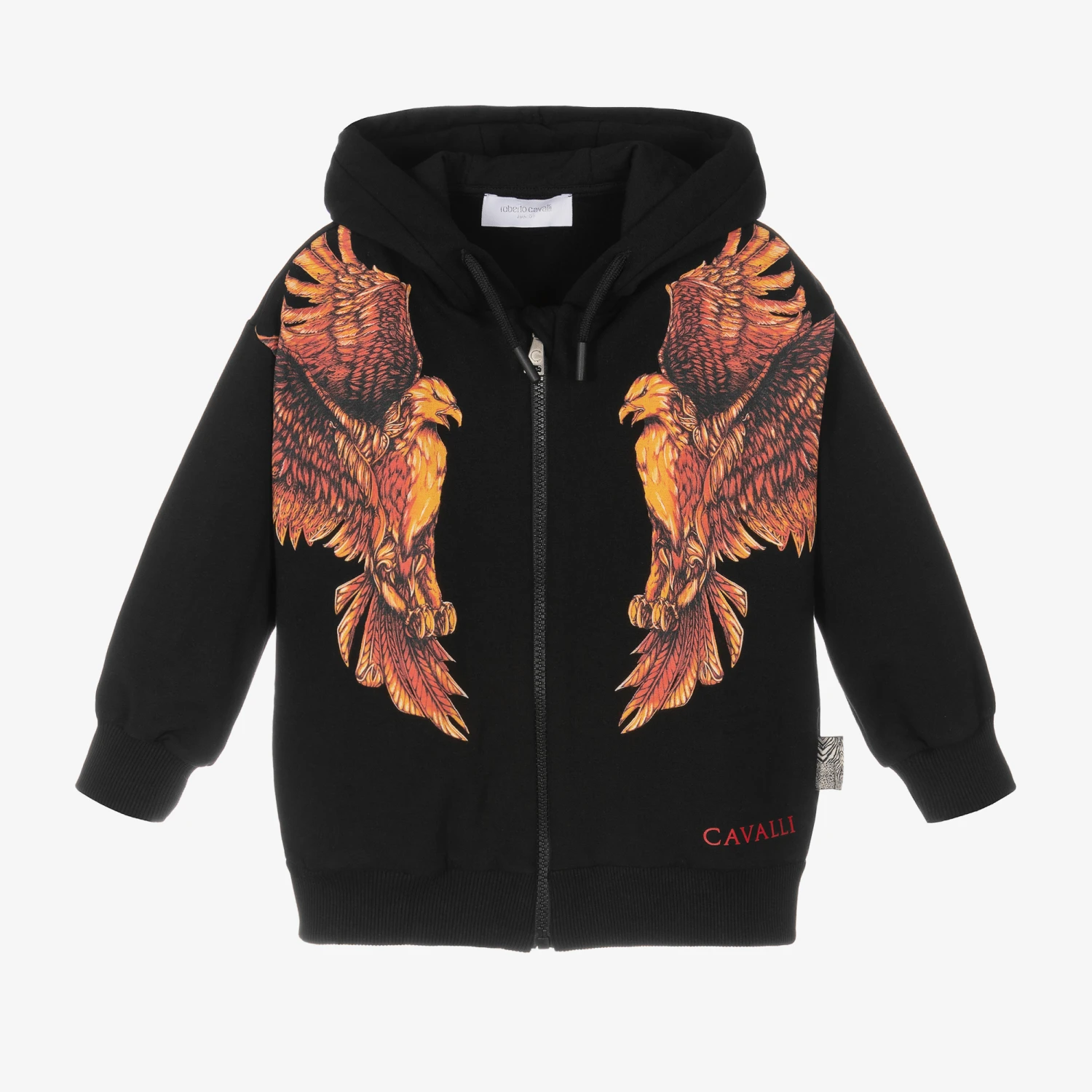 Black cotton zip-up hooded top for boys by luxury Italian brand Roberto Cavalli. This top has two orange eagles printed on the front, with a red logo above the hem. The Cavalli Animalier tab can also be found on the side seam, by the concealed side pocket.