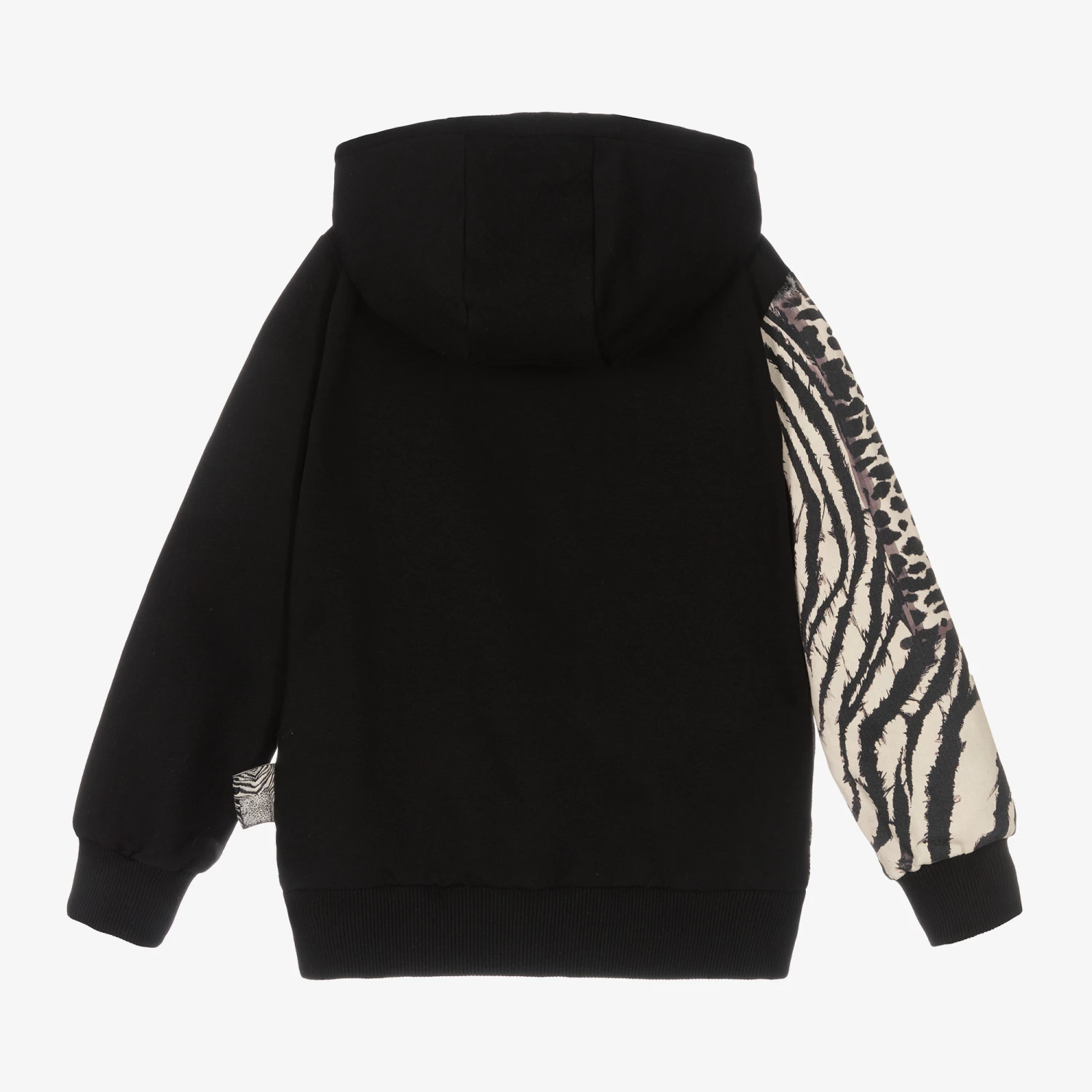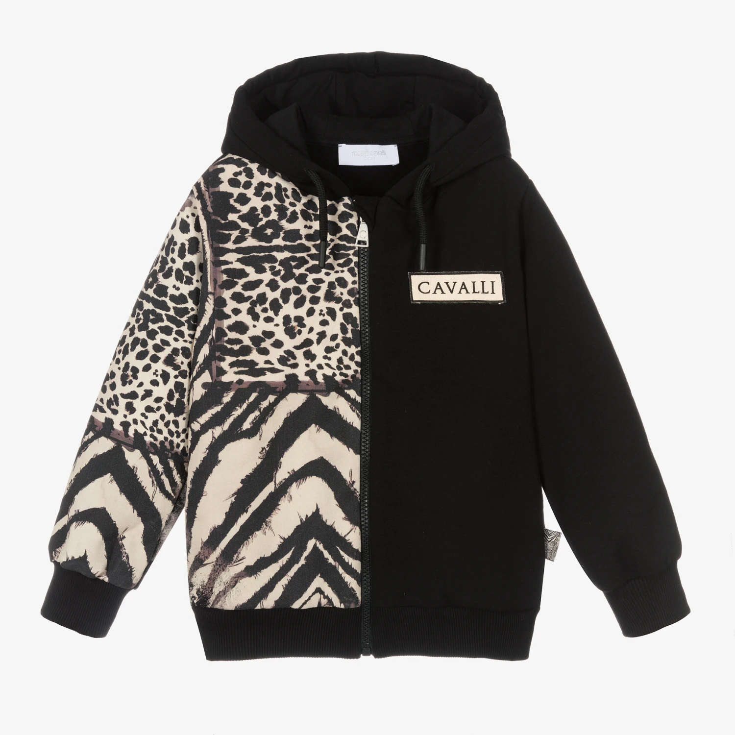 Black hoodie for boys by Roberto Cavalli, made in soft sweatshirt jersey, with a fleecy inside. One side has the brand’s Cavalli Animalier print, while the other side has an ivory logo patch. There are side seam pockets and a front zip fastening.