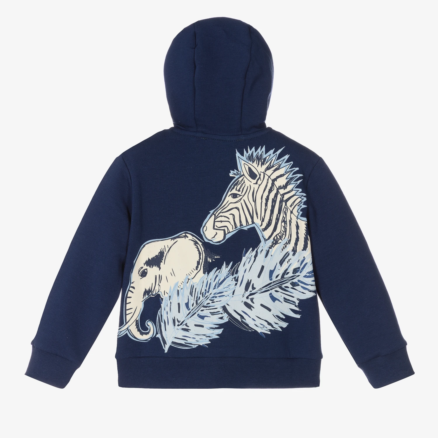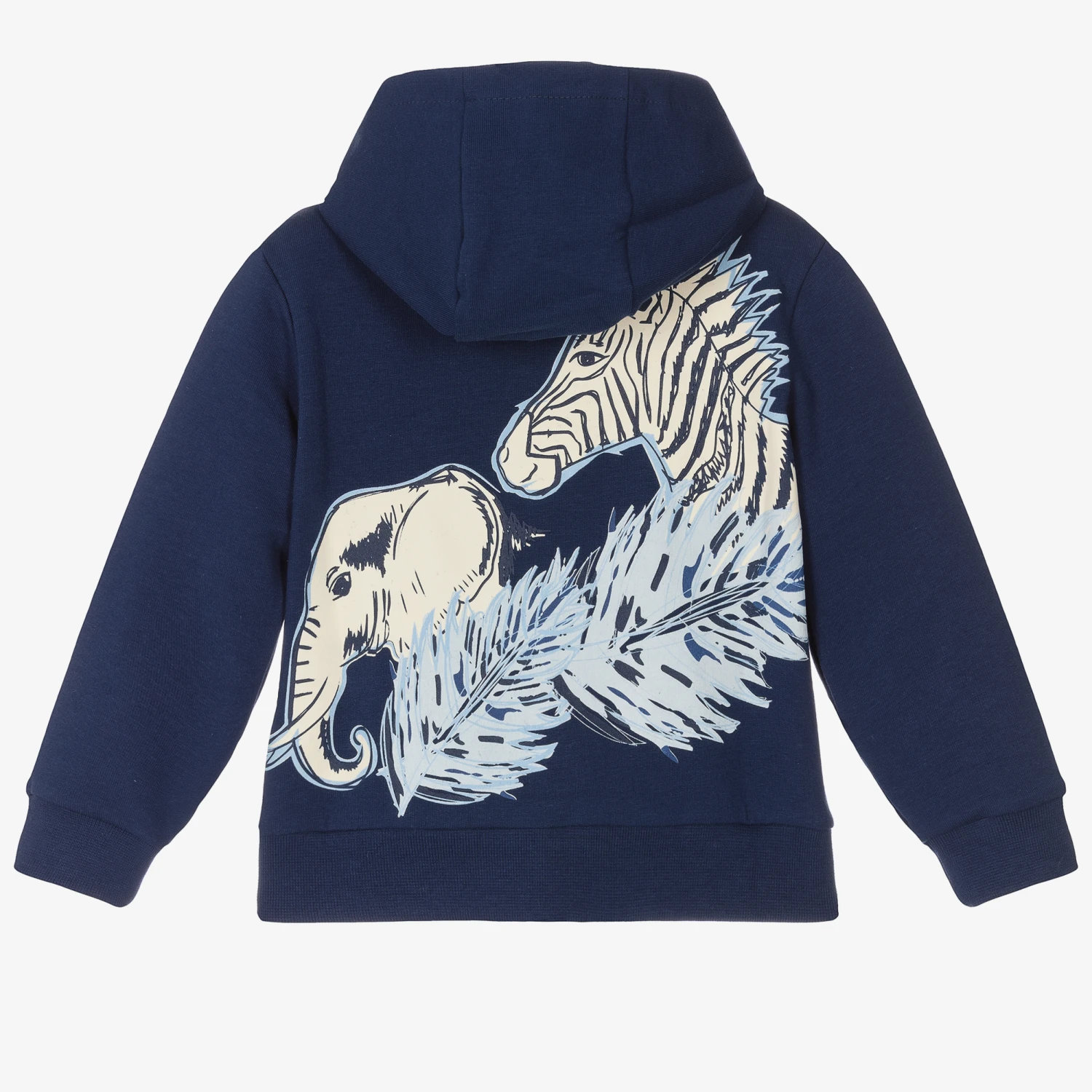 Navy blue hooded zip-up top for little boys from Roberto Cavalli. Made from soft and stretchy cotton blend jersey, it fastens with branded zip for easy dressing. The front has a logo and sweet giraffe print and there is an elephant and zebra print on the back.