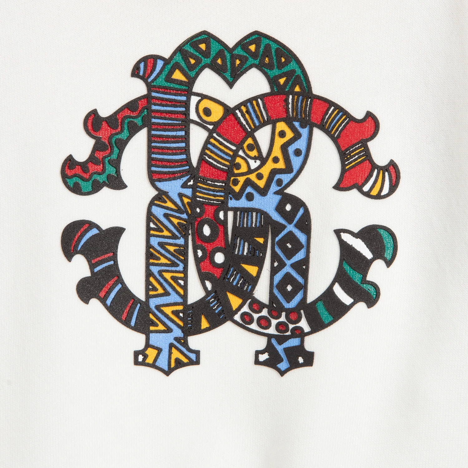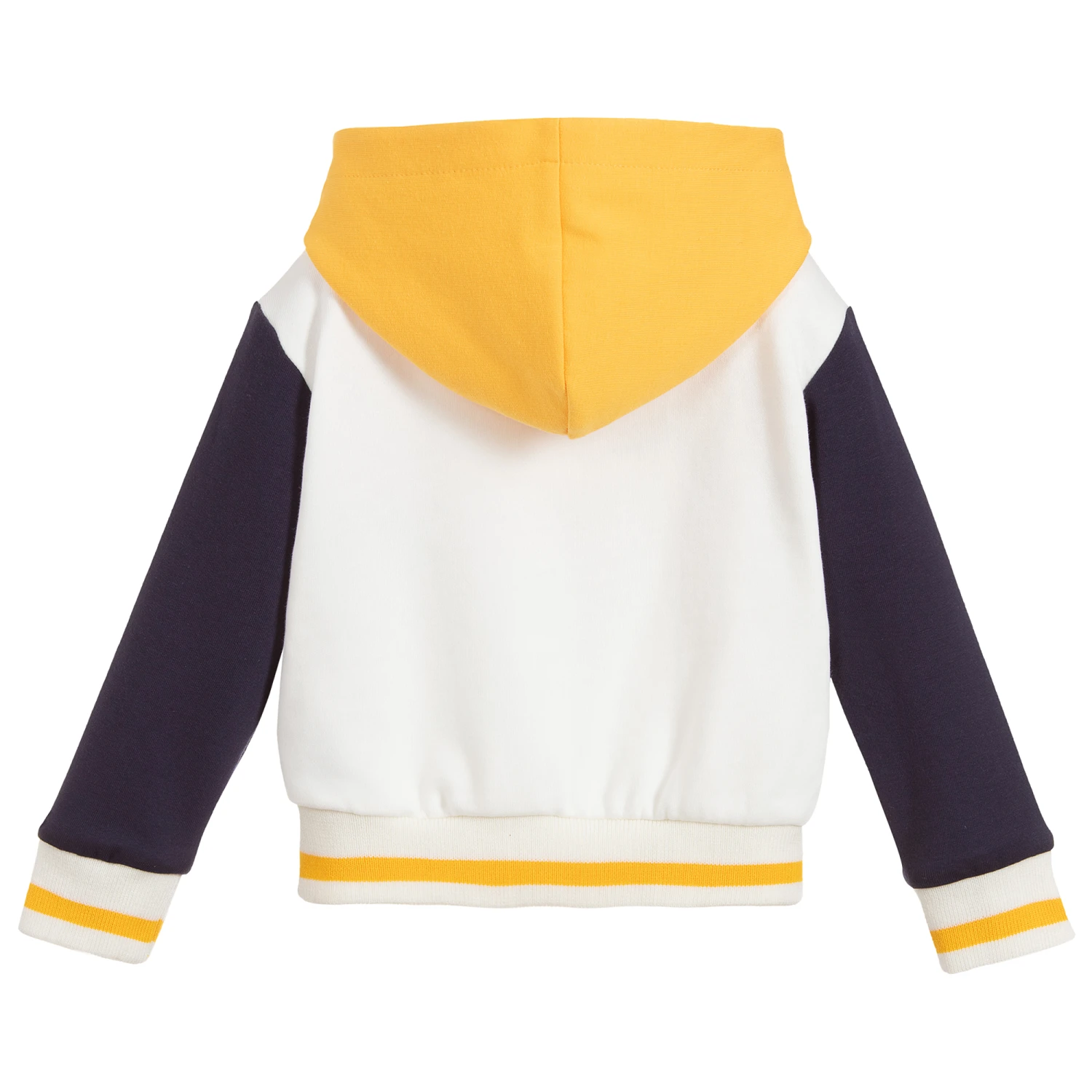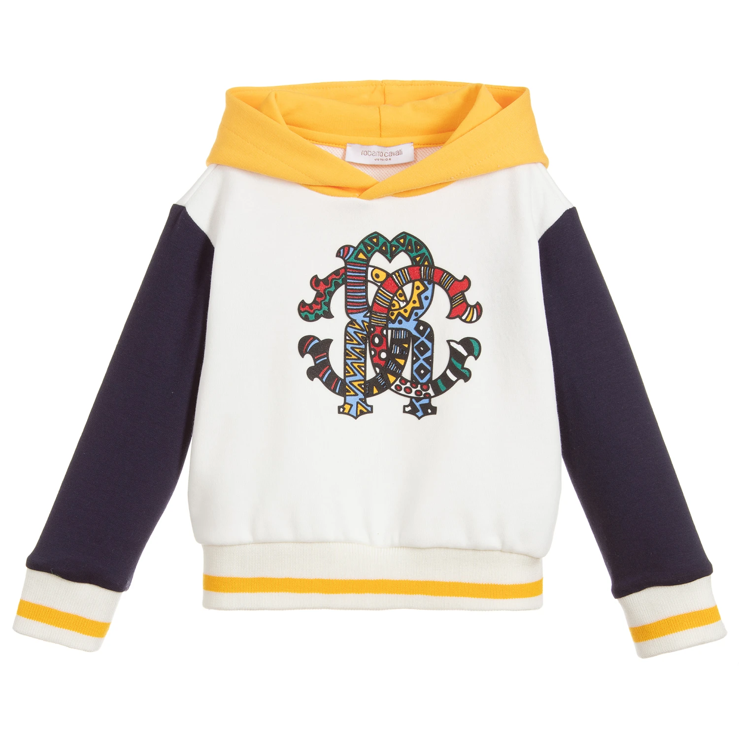Baby boys ivory hooded sweatshirt by Roberto Cavalli, made in soft cotton sweatshirt jersey. It has a colourful ‘RC’ print on the front with navy blue sleeves, a yellow hood, and ivory cuffs with yellow stripes.