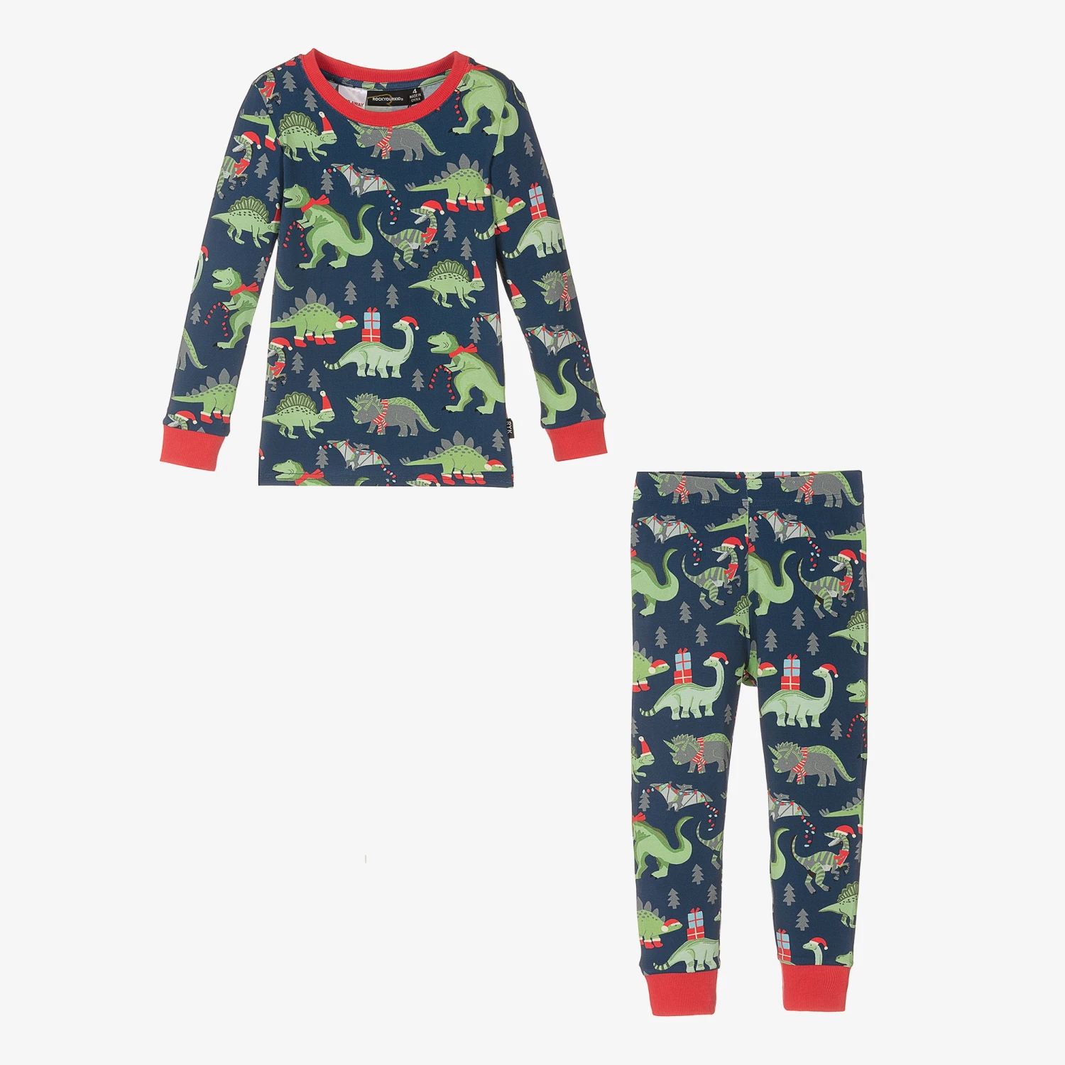 Festive fun for boys and girls, a navy blue pair of cotton pyjamas by Rock Your Baby, with a green Dino Greetings design. Made from soft stretchy jersey, for a comfortable night’s sleep. The full length bottoms have a gently elasticated waistband and there are red contrasting trims on both pieces for added seasonal appeal.