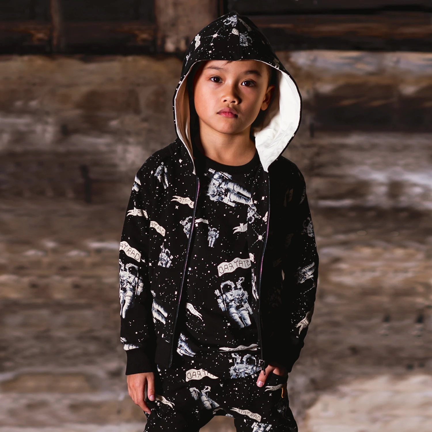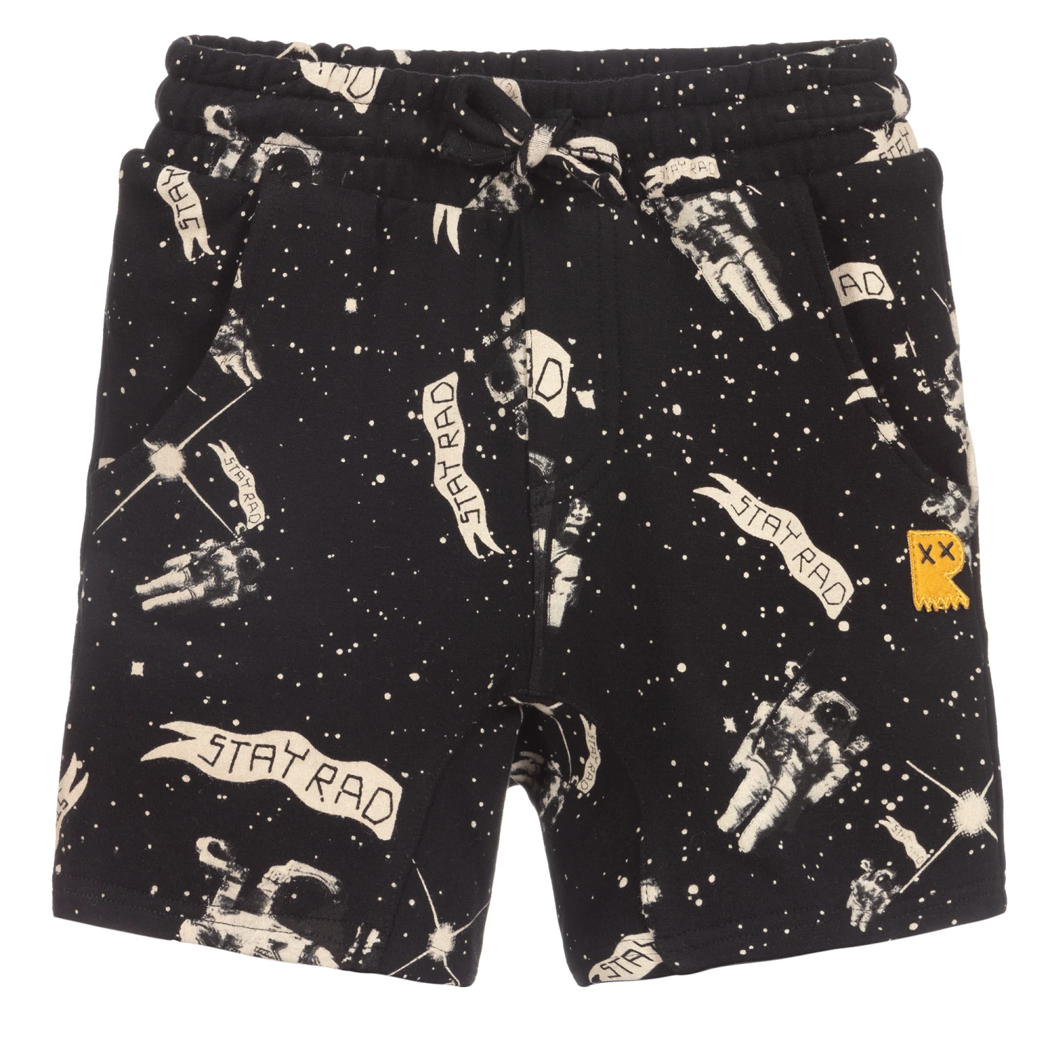 Black shorts for boys by Rock Your Baby, with a beige astronaut print. They are made in soft cotton jersey and have an elasticated drawstring waist. There are useful pockets on the back and front.
