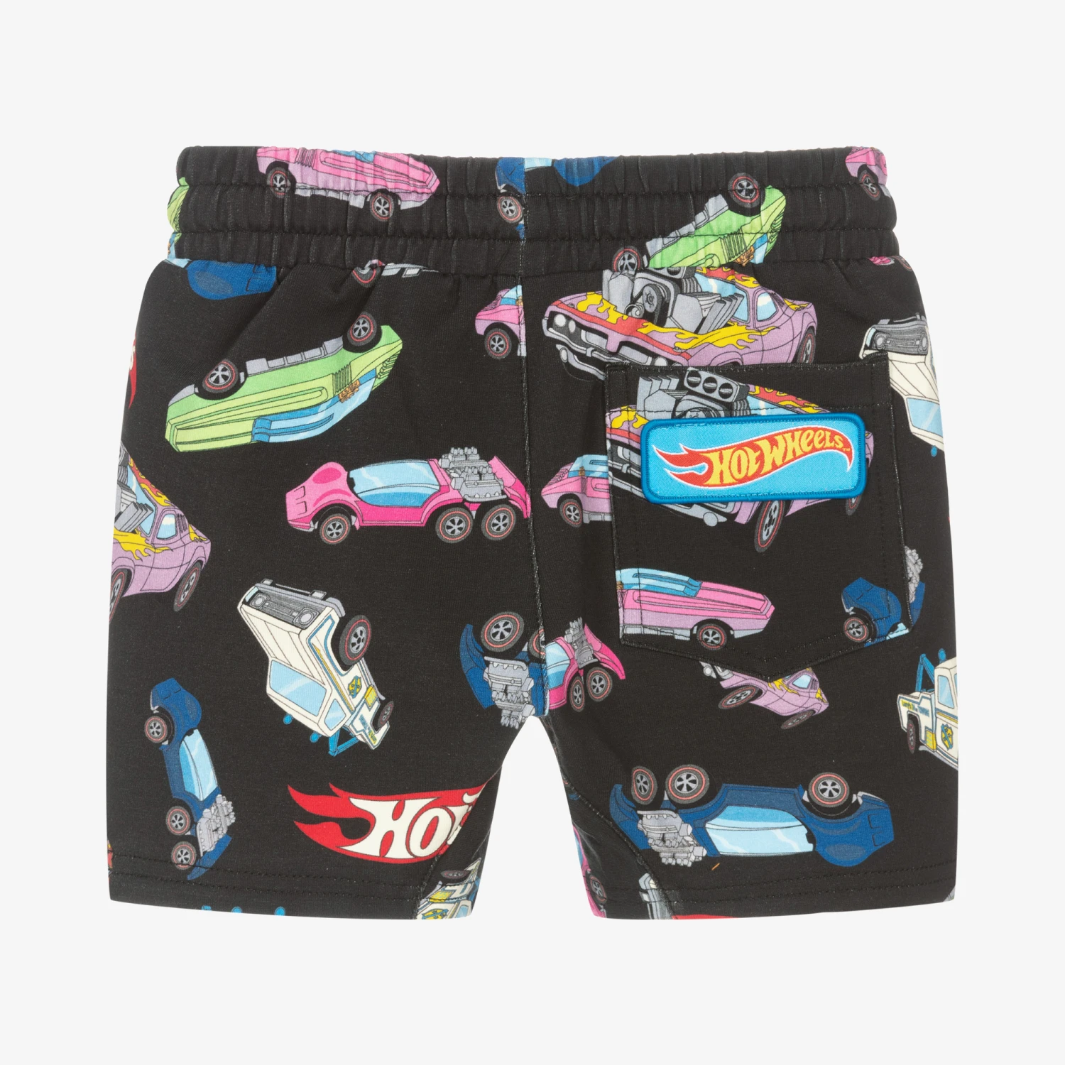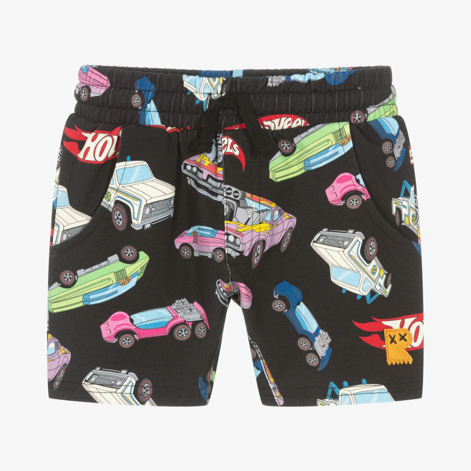 Fun black cotton shorts for boys by Rock Your Baby. Patterned with a colourful car all-over print, there is a bright blue patch with the iconic Hot Wheels logo on the back pocket and an orange felt logo applique on the front. Soft and comfortable, they are made in soft cotton jersey with an elasticated drawstring waistband and two front pockets.