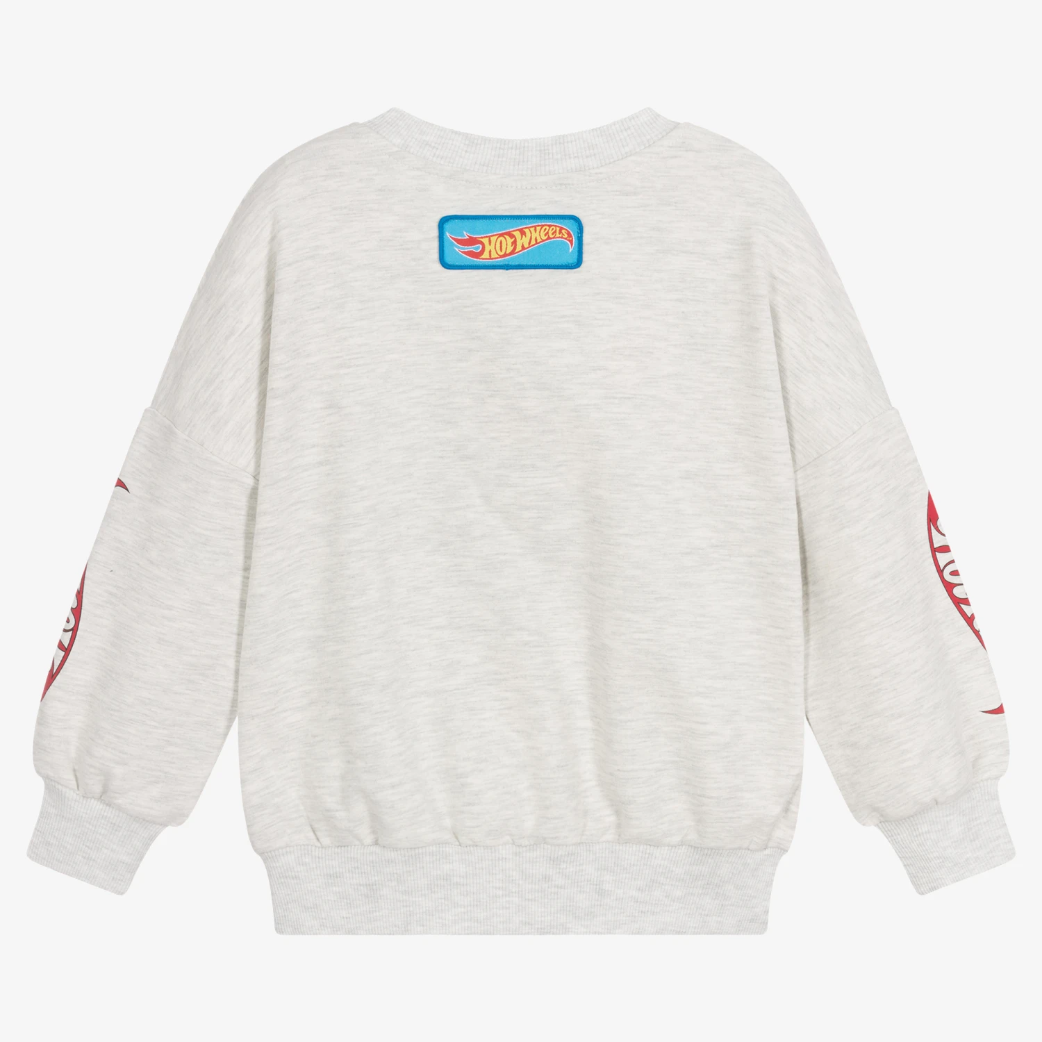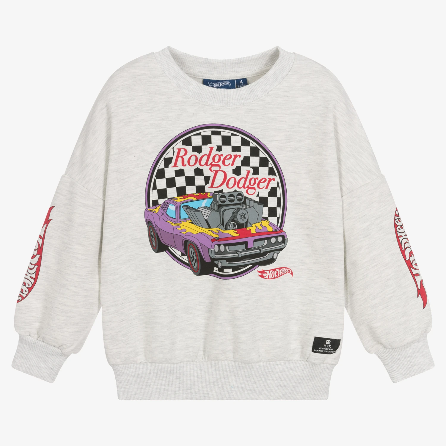 Fun grey marl sweatshirt for boys by Rock Your Baby, made in soft, mid-weight cotton jersey. It has an eye-catching purple Rodger Dodger car print on the front with a black and grey checquered background. There are Hot Wheels™ prints on the sleeves and a blue, red and yellow embroidered appliqué patch on the back. This cool top has comfortable ribbed trims and a black logo patch by the hem.