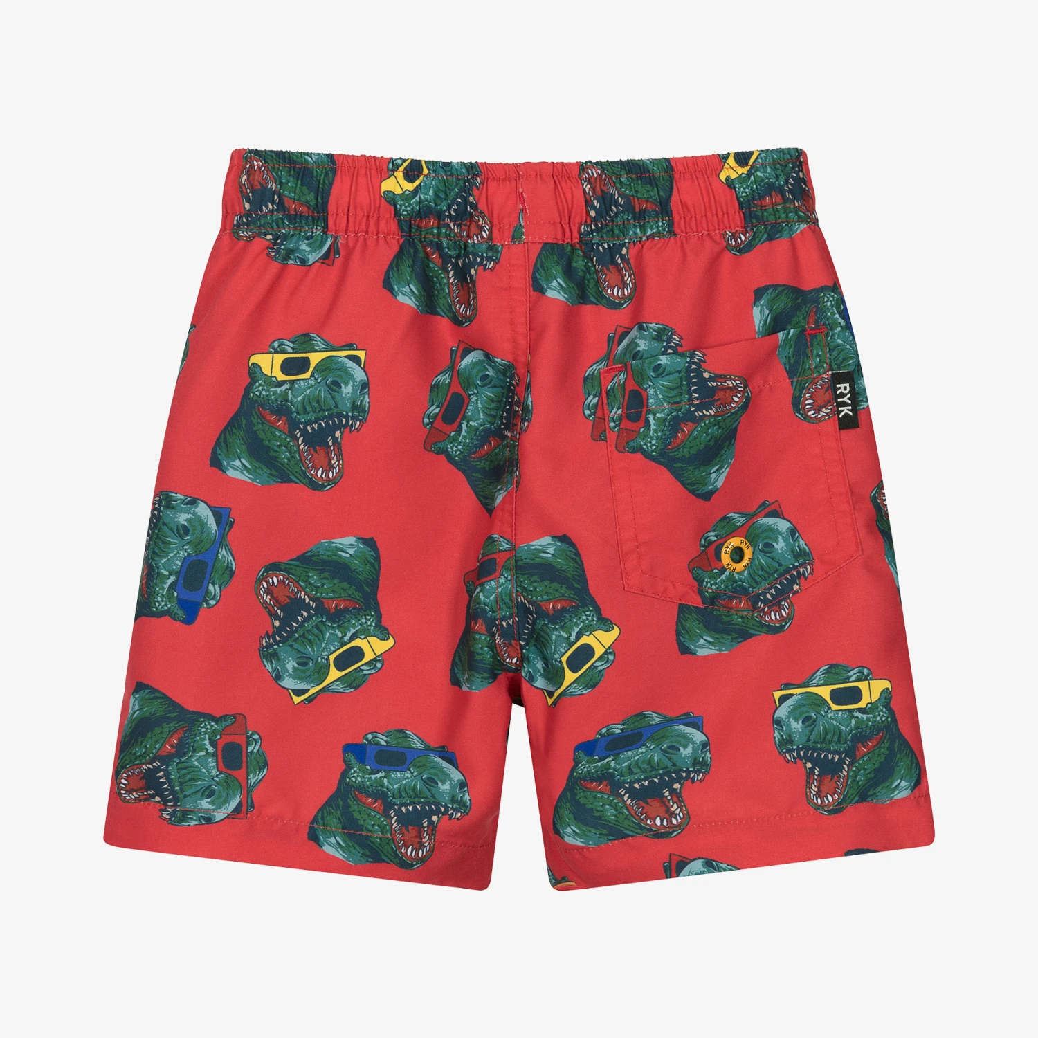 Playful red swim shorts for boys by Rock Your Baby, lined in soft mesh. They are patterned with a green dinosaur print all-over, wearing cool sunglasses in bright yellow, blue and red shades. They have a stretchy drawstring waist for comfort. A yellow ‘R’ logo appliqué finishes off this poolside style with branded appeal.