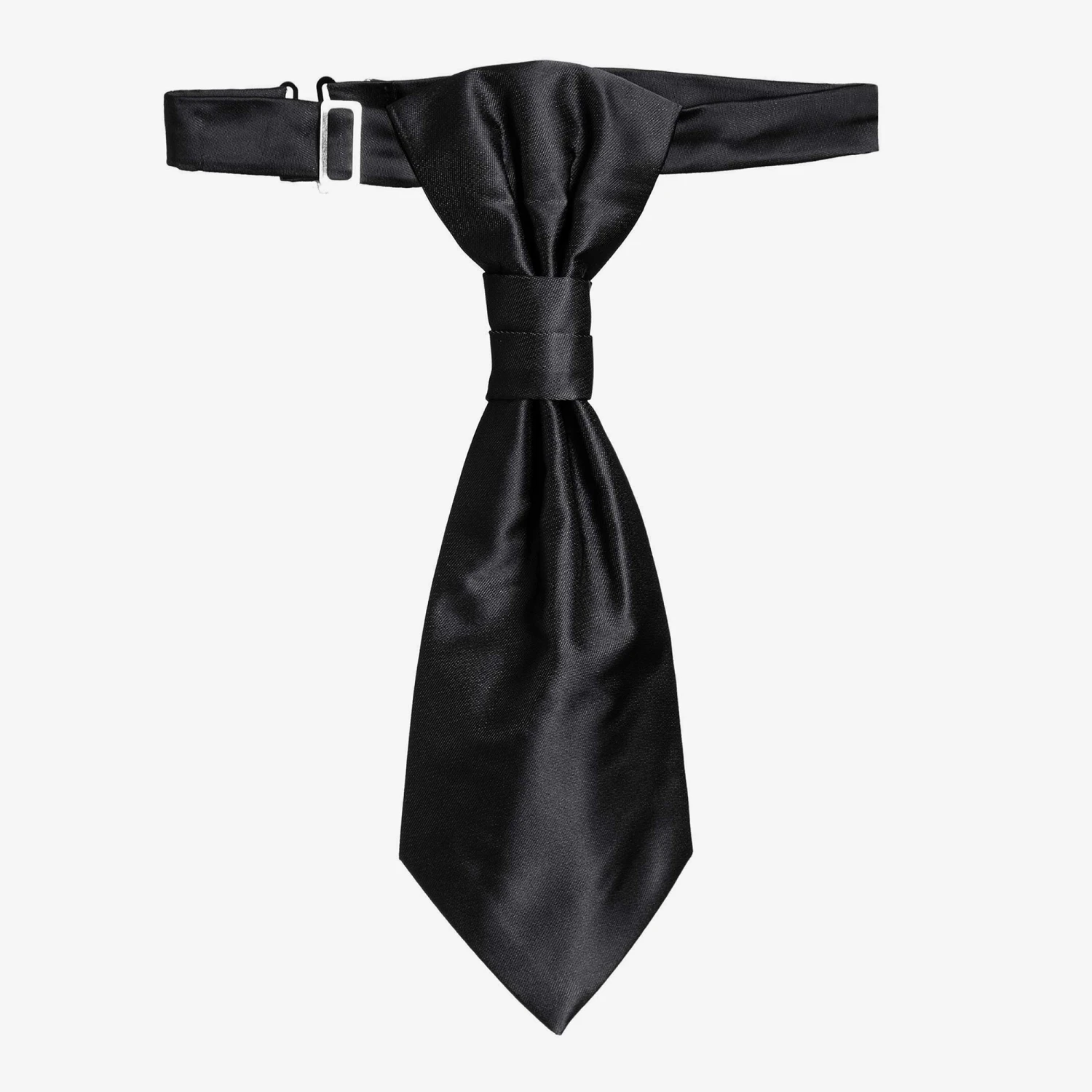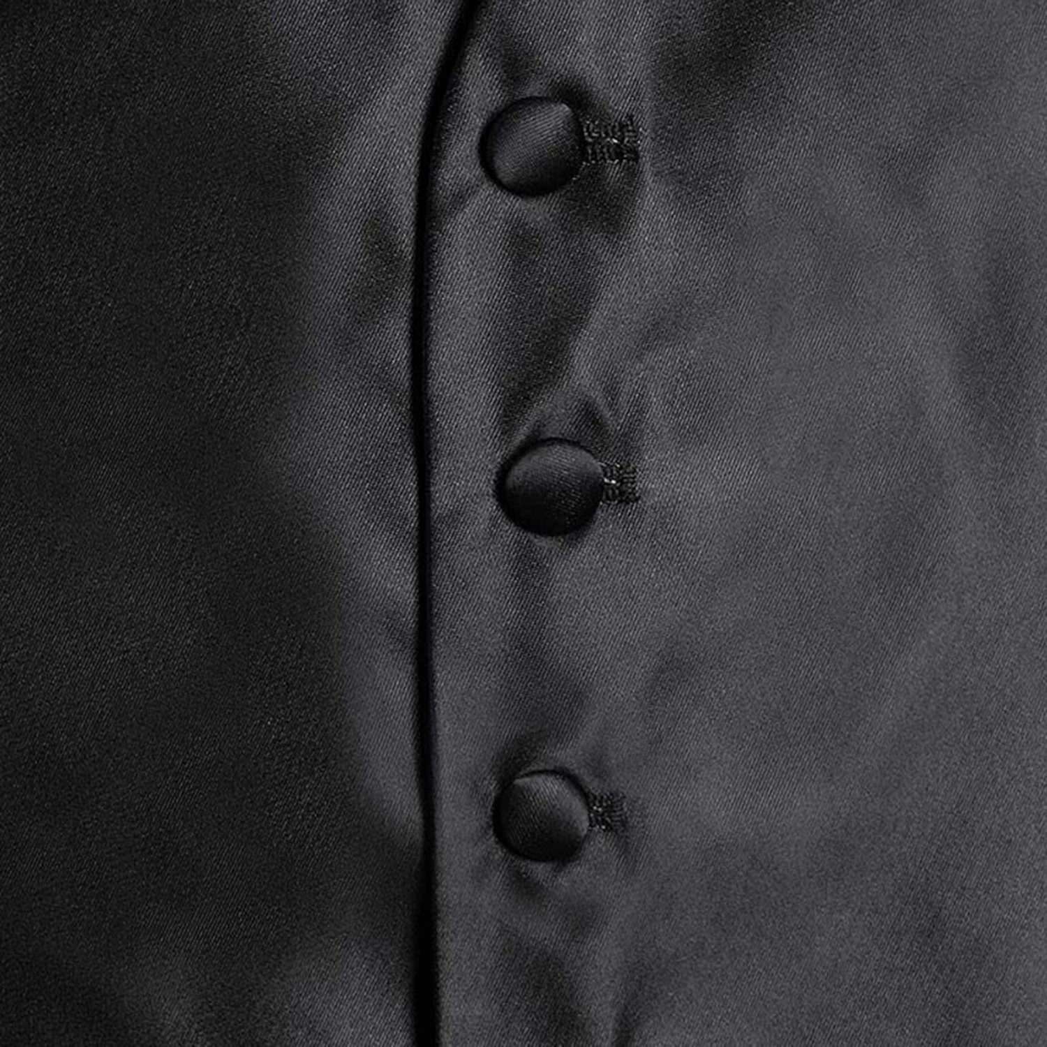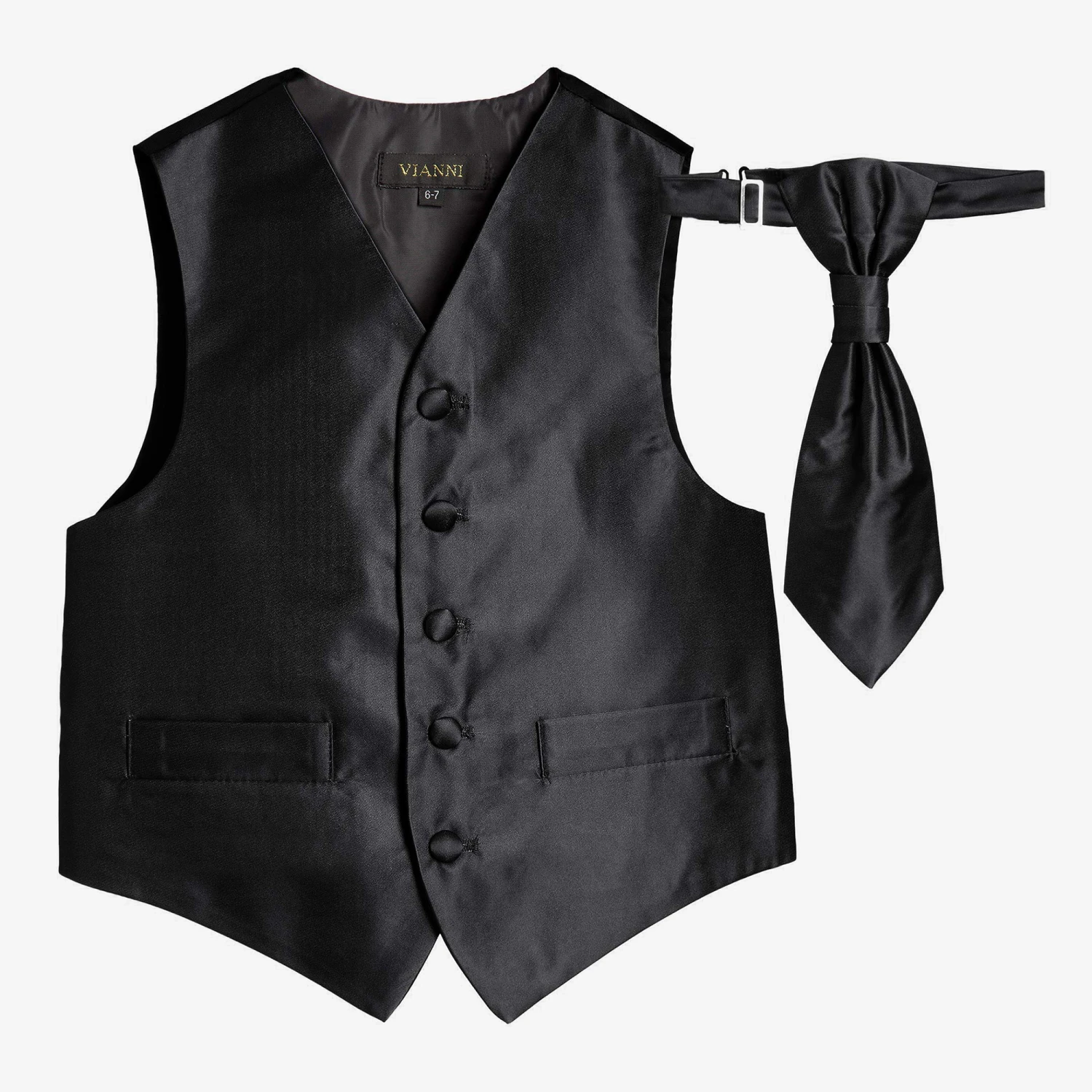 Boys black satin waistcoat and adjustable tie set by Romano Vianni. Made in a smooth silky fabric, this classic style waistcoat has covered buttons, two faux front pockets and a contrasting back panel in black with adjustable buckle. The matching cravat style tie is ready made and has an adjustable neck strap.