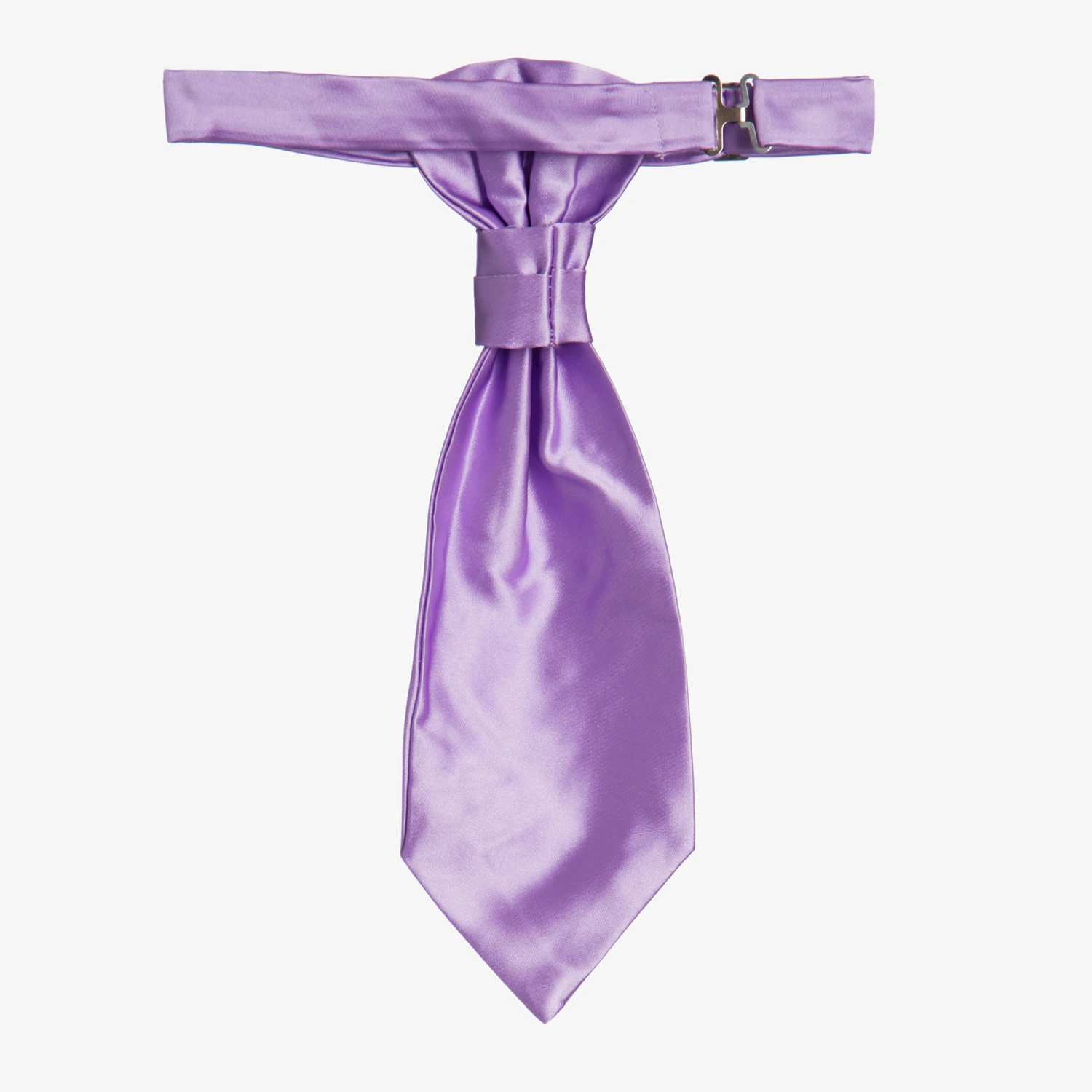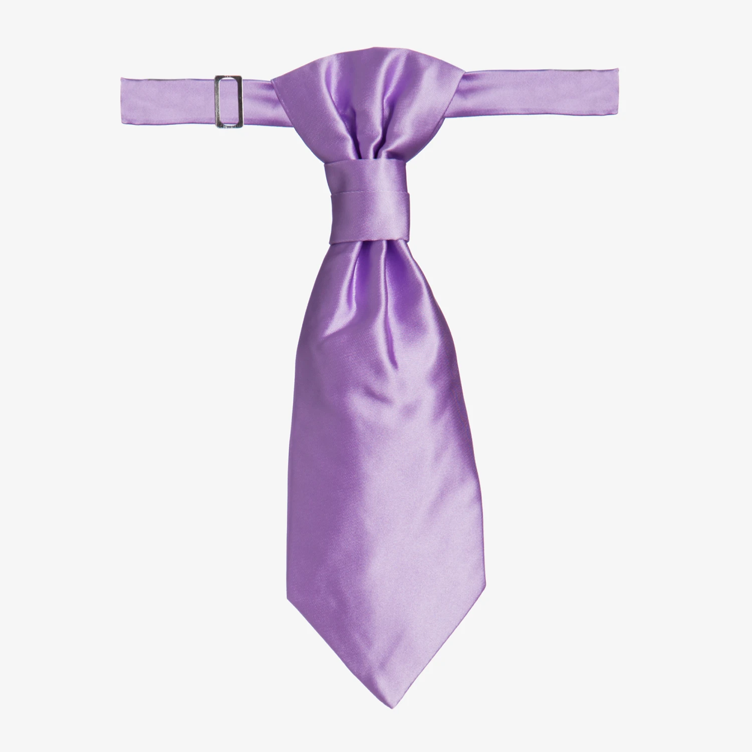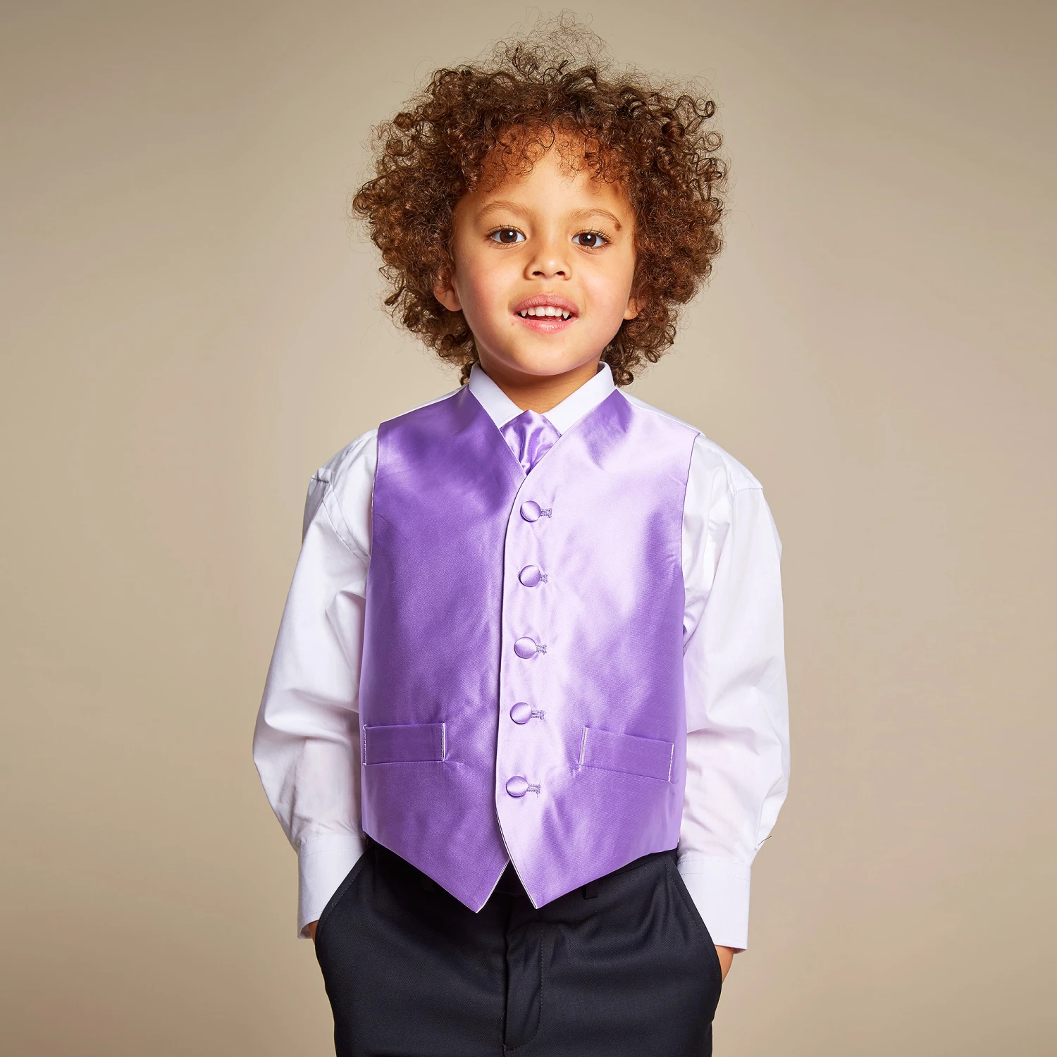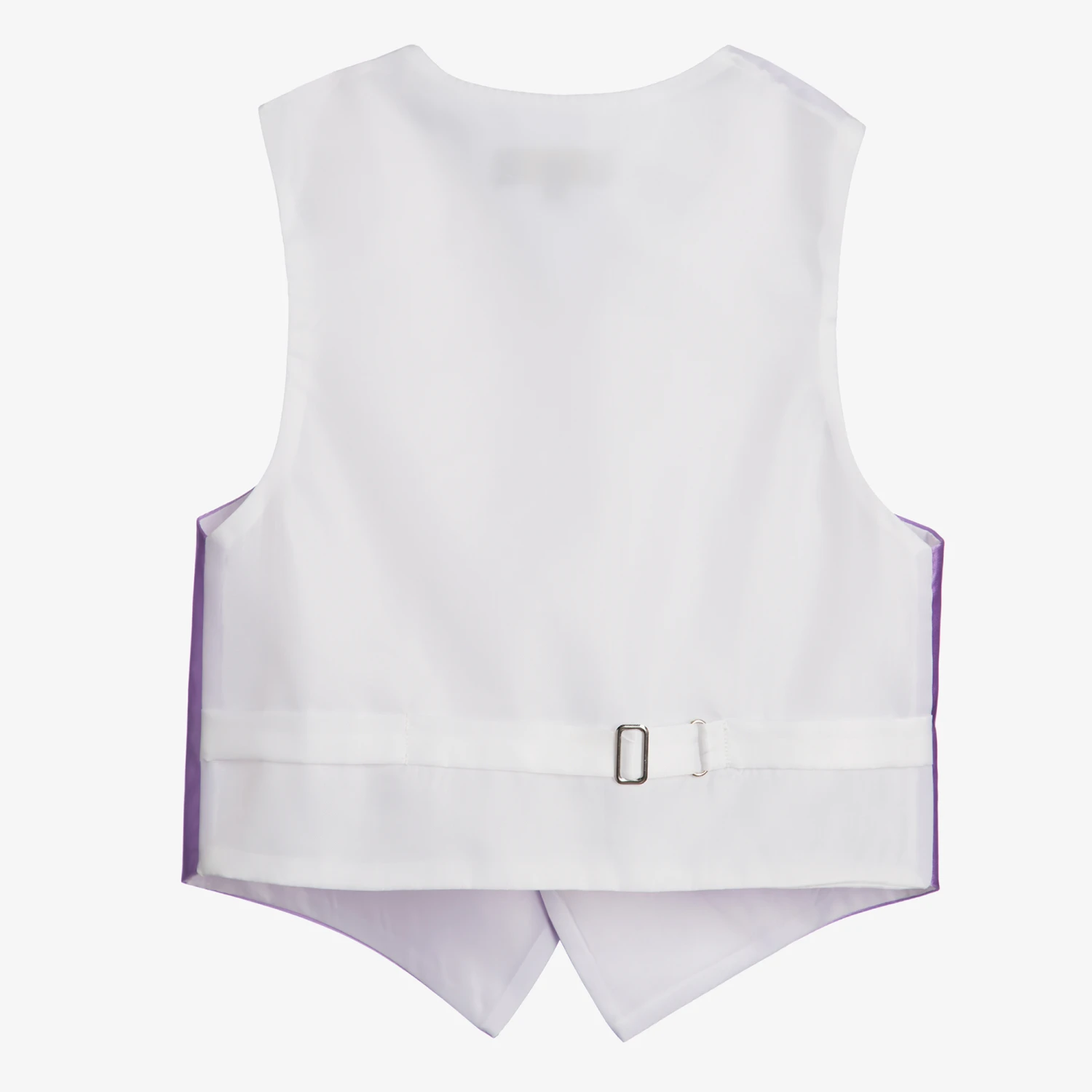 Boys lilac purple satin waistcoat and adjustable tie set by Romano Vianni. Made in a smooth silky fabric, this classic style waistcoat has covered buttons, two faux front pockets and a contrasting back panel in black with adjustable buckle. The matching cravat style tie is ready made and has an adjustable neck strap.