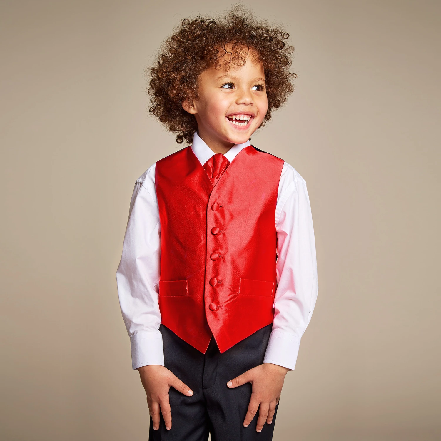 Boys bright red satin waistcoat and adjustable tie set by Romano Vianni. Made in a smooth silky fabric, this classic style waistcoat has covered buttons, two faux front pockets and a contrasting back panel in black with an adjustable buckle. The matching cravat style tie is ready made and has an adjustable neck strap.