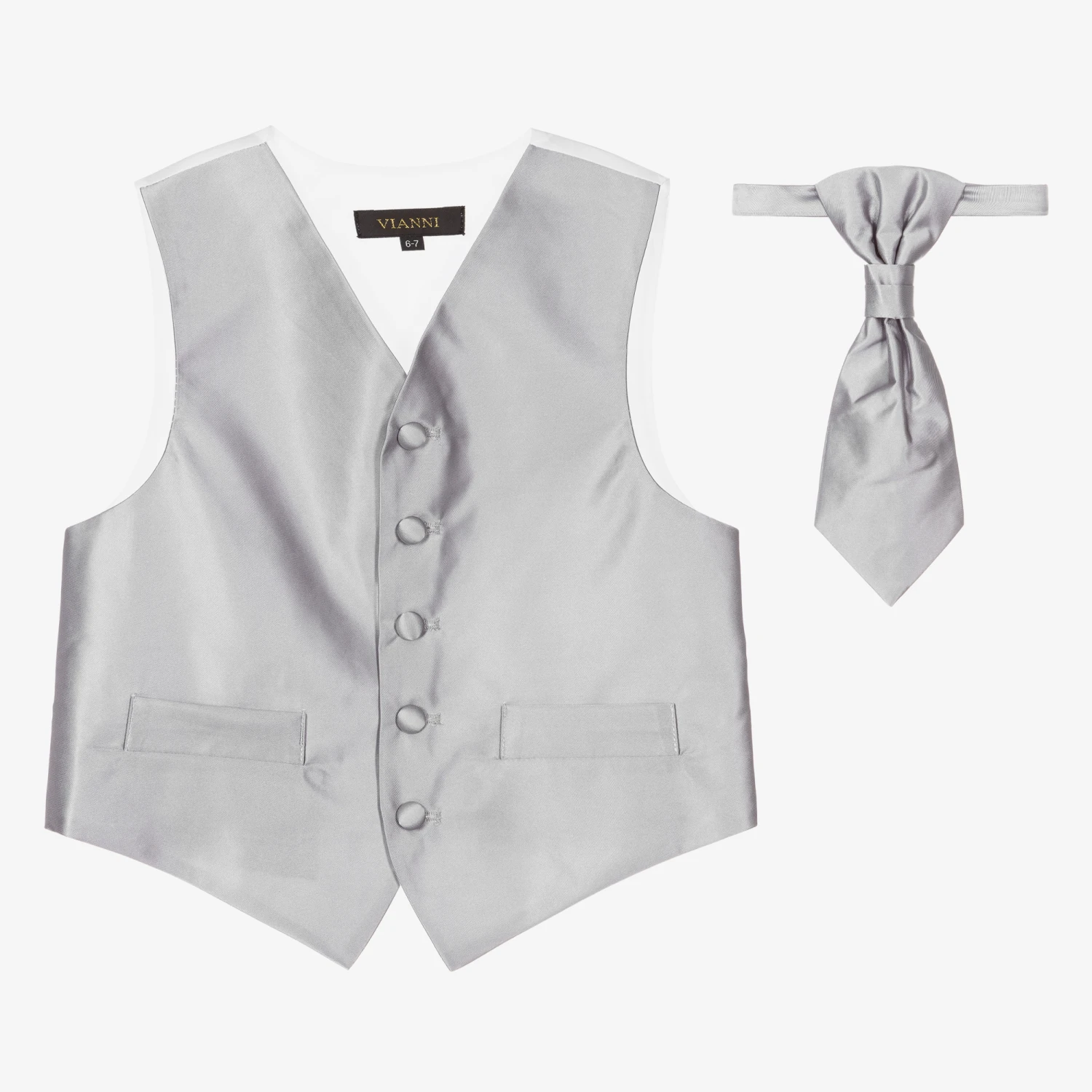 Boys silver grey satin waistcoat and adjustable tie set by Romano Vianni. Made in a smooth silky fabric, this classic style waistcoat has covered buttons, two faux front pockets and a contrasting back panel in white with adjustable buckle. The matching cravat style tie is ready made and has an adjustable neck strap.