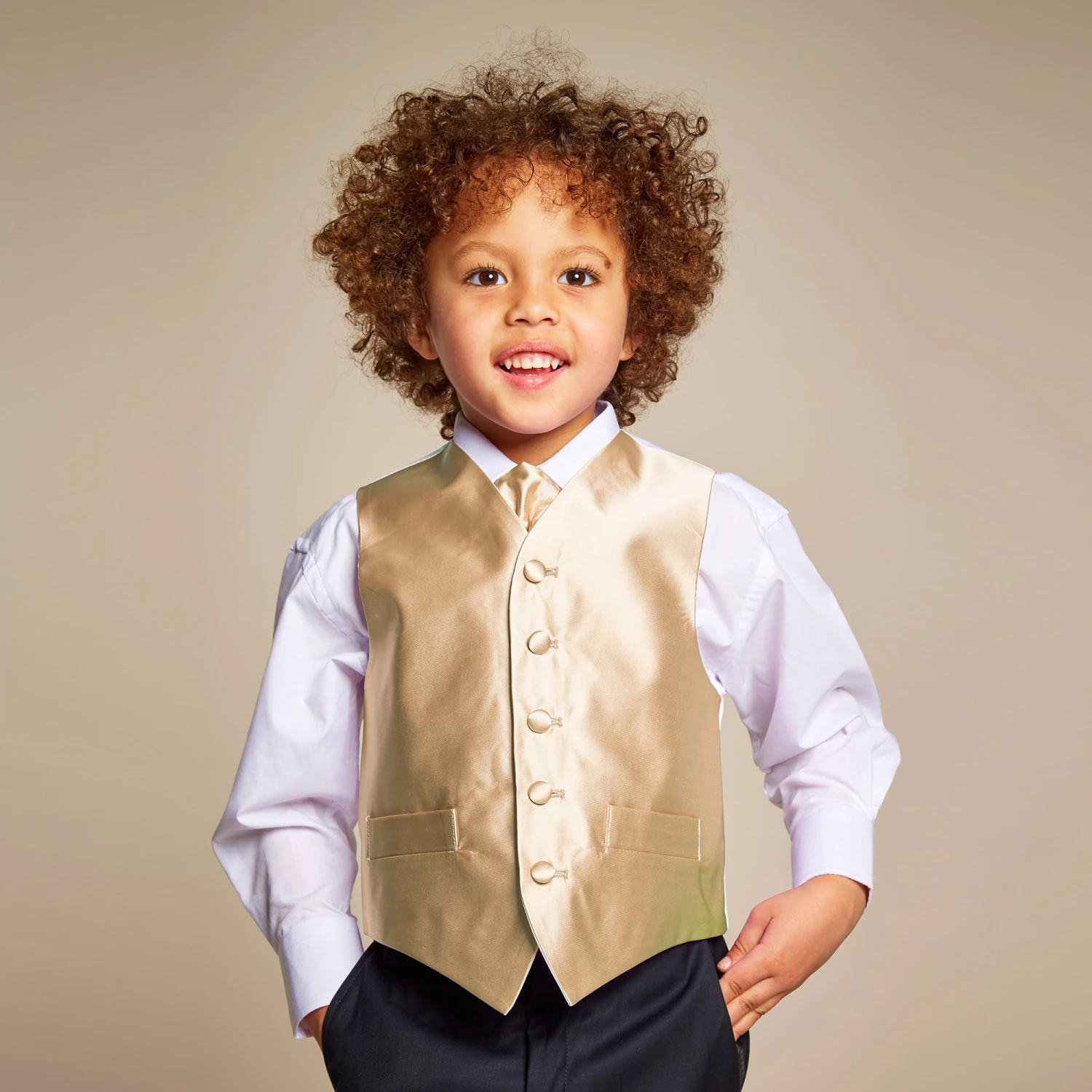 Boys gold satin waistcoat and adjustable tie set by Romano Vianni. Made in a smooth silky fabric, this classic style waistcoat has covered buttons, two faux front pockets and a contrasting back panel in black with adjustable buckle. The matching cravat style tie is ready made and has an adjustable neck strap.
