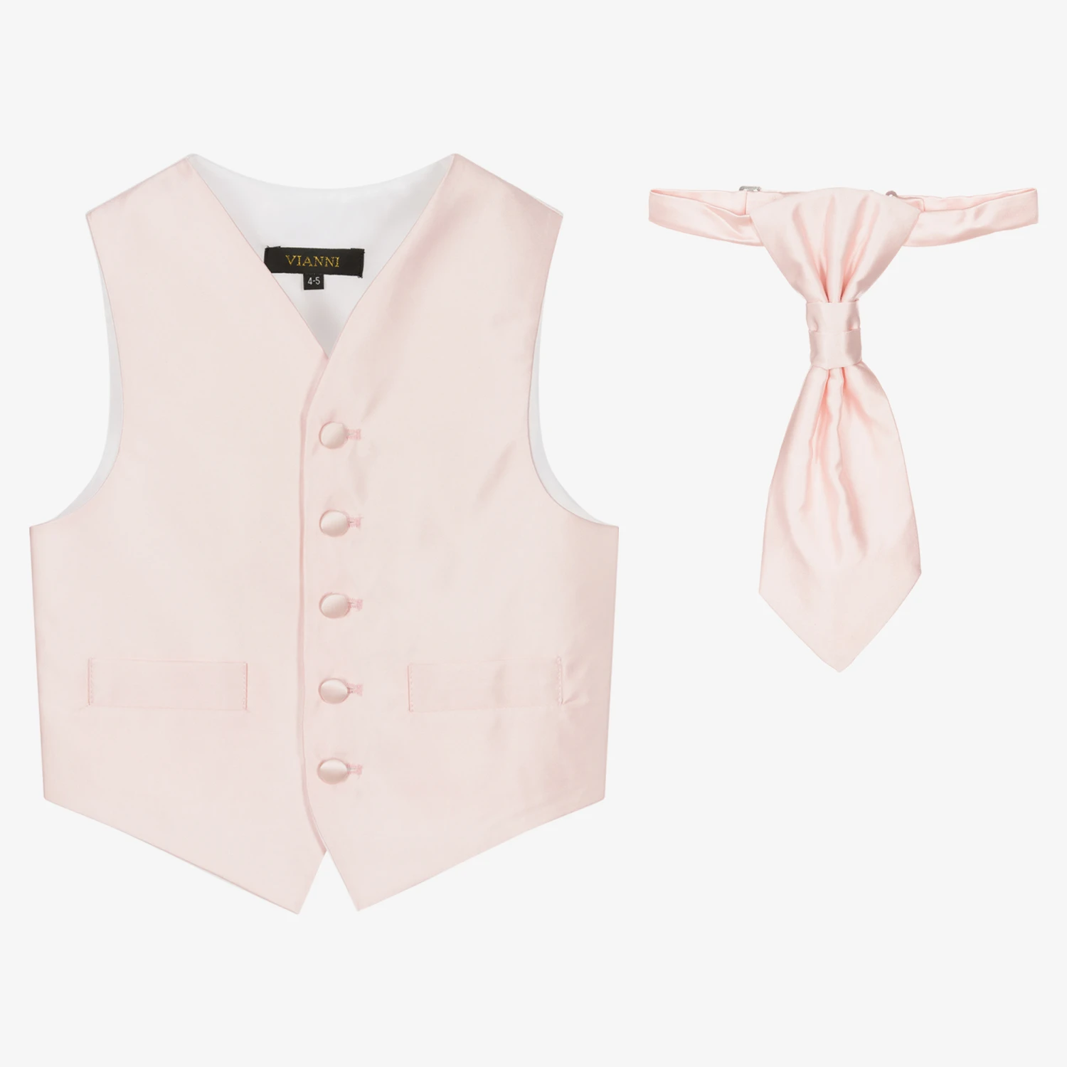 Boys pink satin waistcoat and tie set by Romano Vianni. Smart and classic, the waistcoat has covered buttons, faux front pocket detail and a contrasting white back panel with an adjustable buckle. The matching cravat-style tie has an adjustable neck strap.