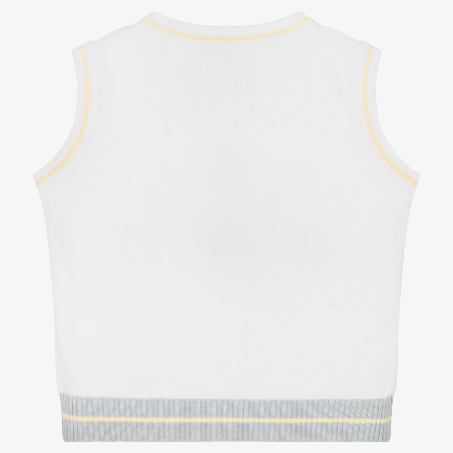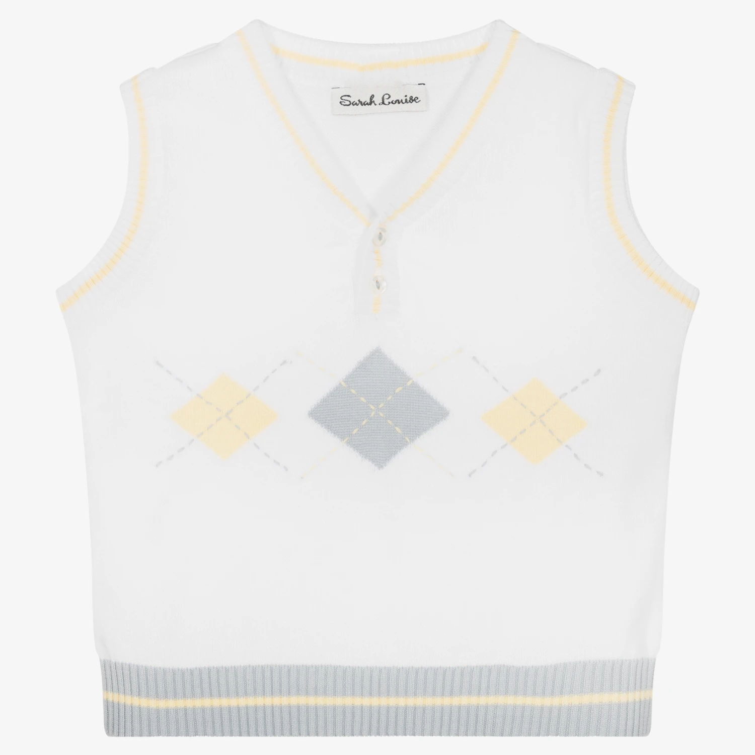 Sleeveless white sweater vest for boys by Sarah Louise, knitted in a soft cotton. This timeless piece has a yellow and grey Argyle pattern on the front with matching ribbed trims. There are pearlised button fastenings on the front for a classic finish.