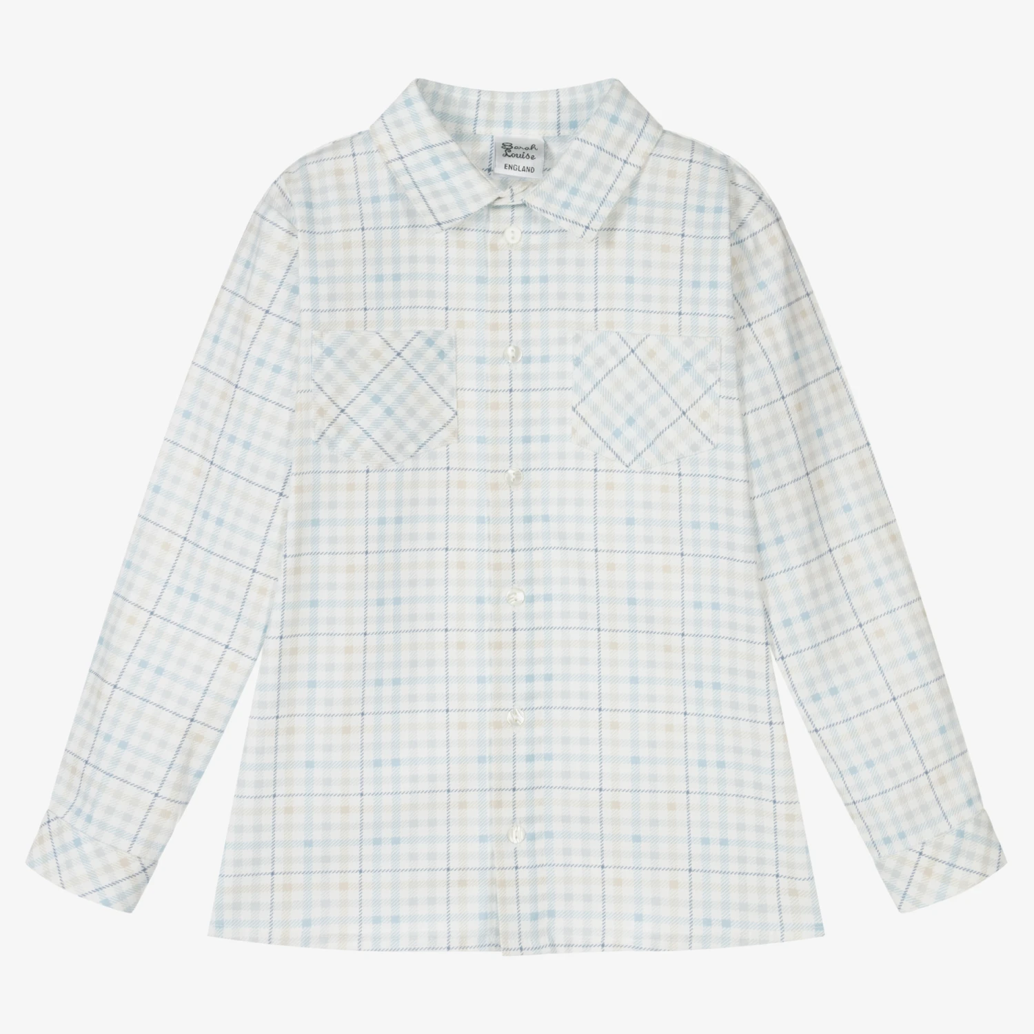 White, blue and beige checked shirt for boys by Sarah Louise. Made in soft cotton-blend twill, it has chest pockets and button fastenings.