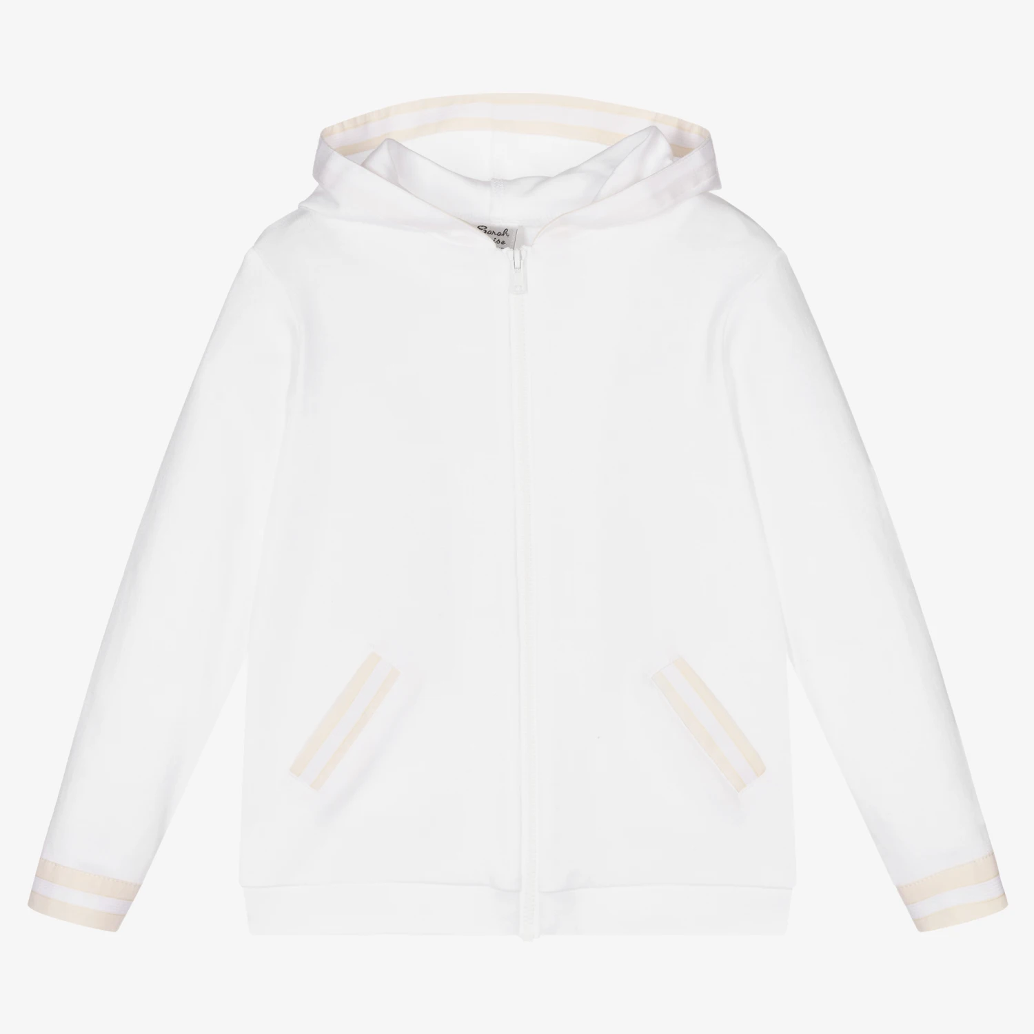 White hooded zip-up top for little boys and girls by Sarah Louise, with beige trims. Made in soft cotton jersey, it has useful front pockets and an exposed front zip fastening.