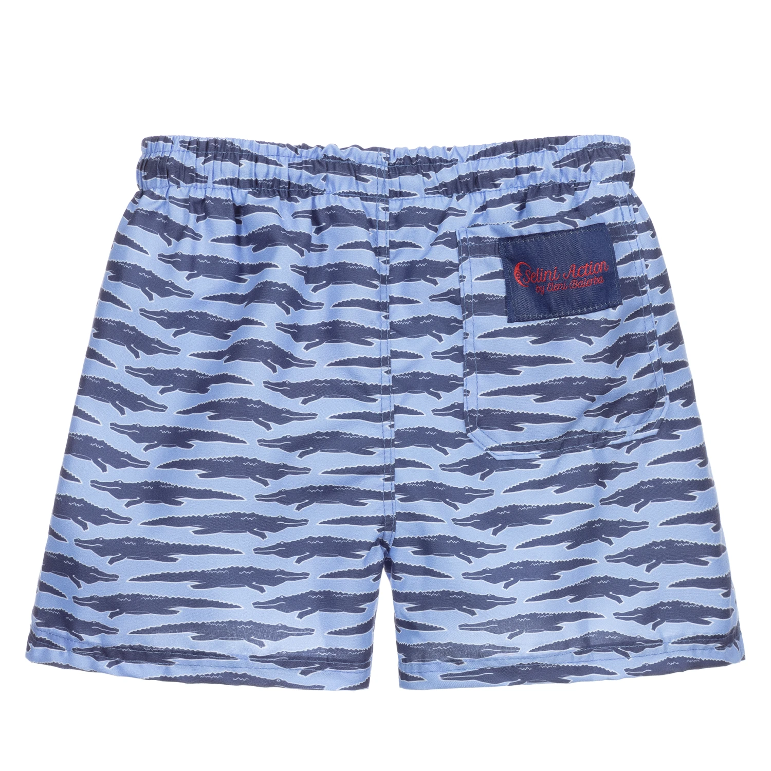 Boys swim shorts by Selini Action, in pale blue with navy blue crocodile print. Silky soft and lightweight, they have a comfortable mesh lining and an elasticated waistband with a woven drawstring. There are side vents for ease of movement and a back pocket with a blue and red logo patch