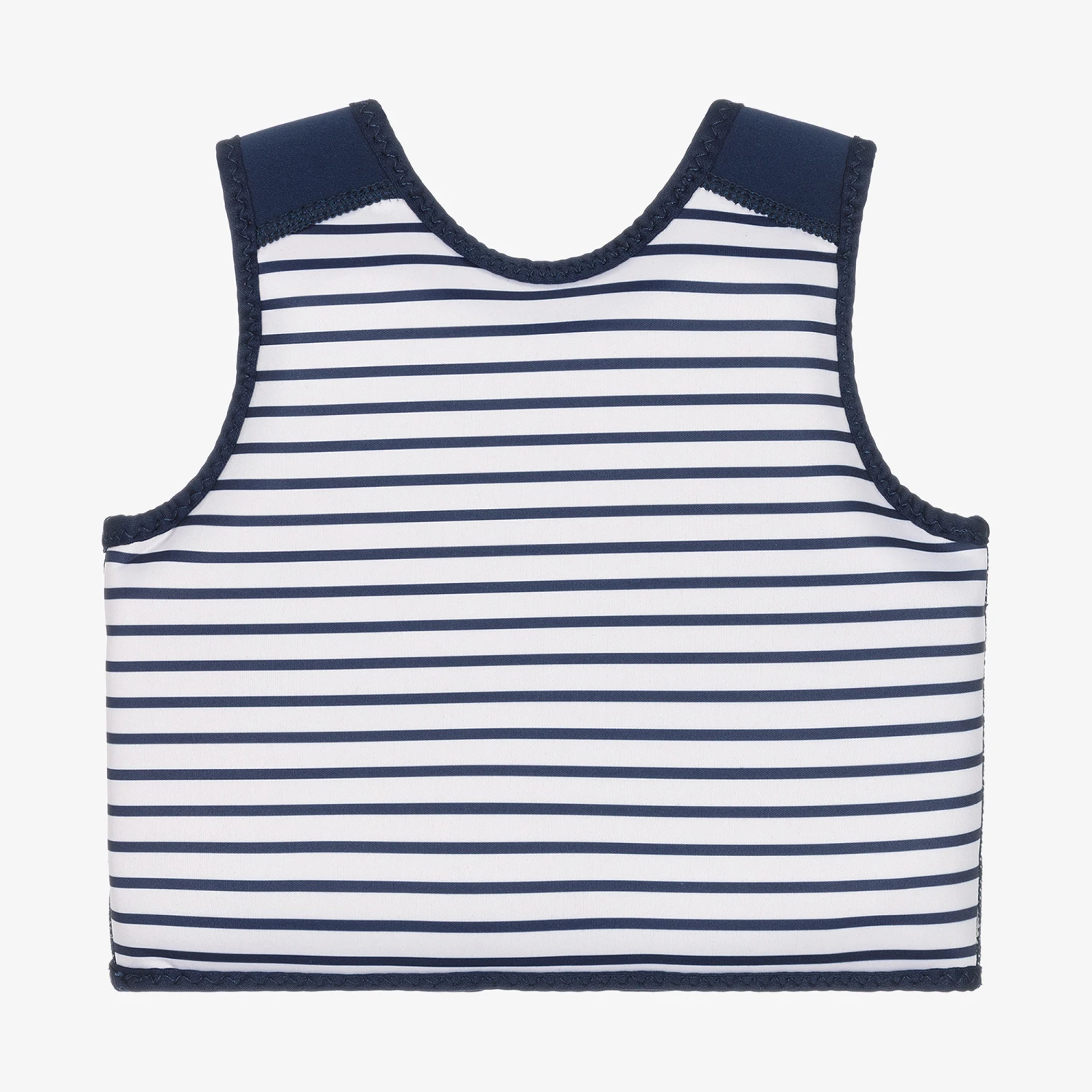 A red and navy blue float suit for little boys by Soli Swim, patterned in white stripes with a smooth exterior. Enhancing their confidence in the water, this vest is padded to ensure buoyancy as your little one learns to swim. It has useful zip and velcro fastenings for fuss-free dressing.