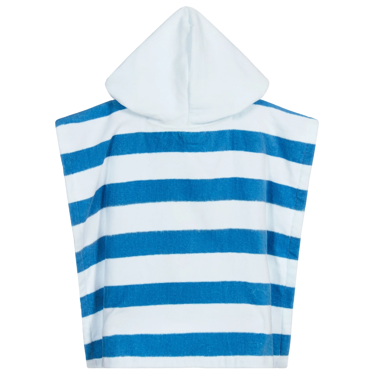 Fun blue and white striped beach towel for boys by British designer Stella McCartney Kids. Made in absorbent cotton towelling, it has a pirate’s body printed on the front and a pirate’s hat printed on the hood.