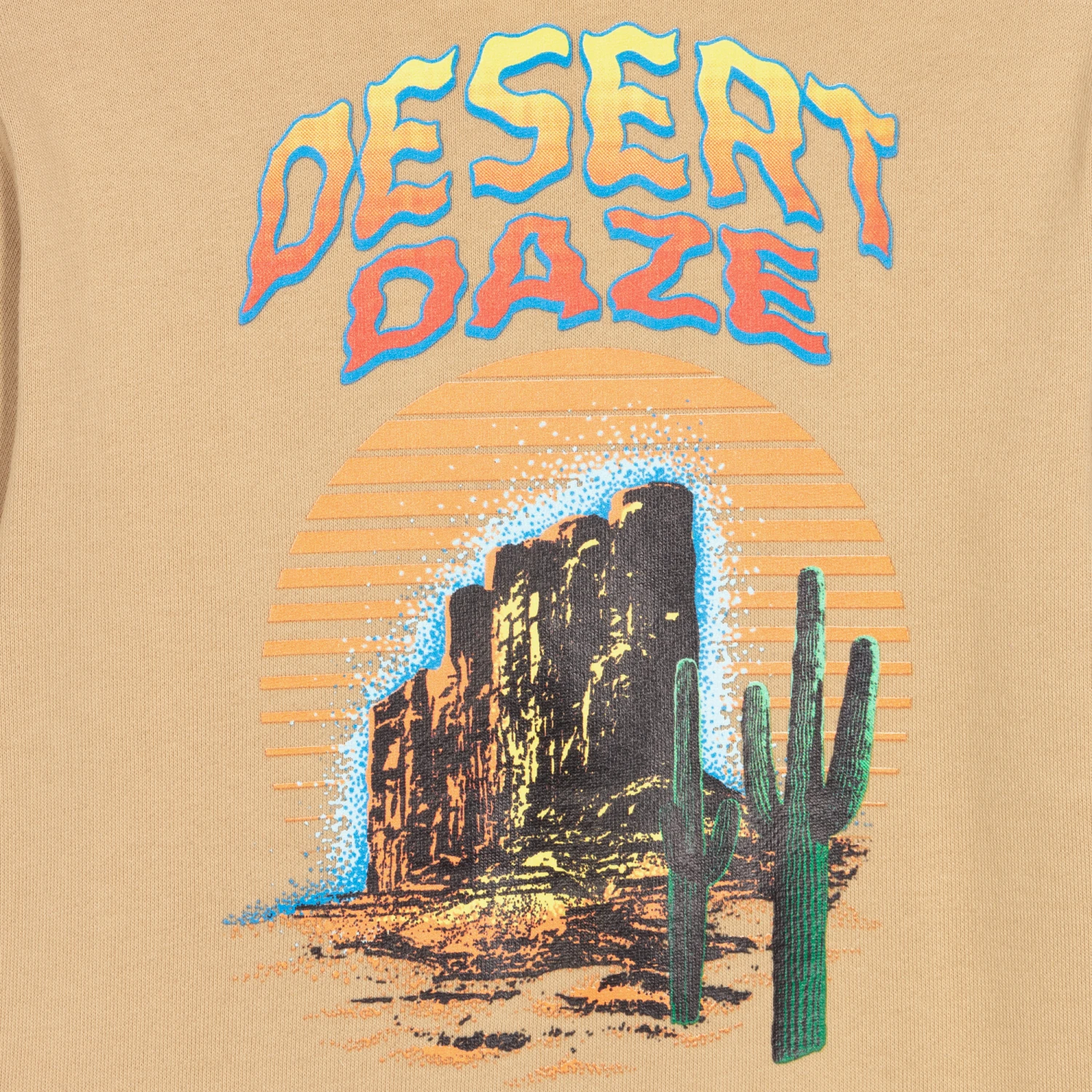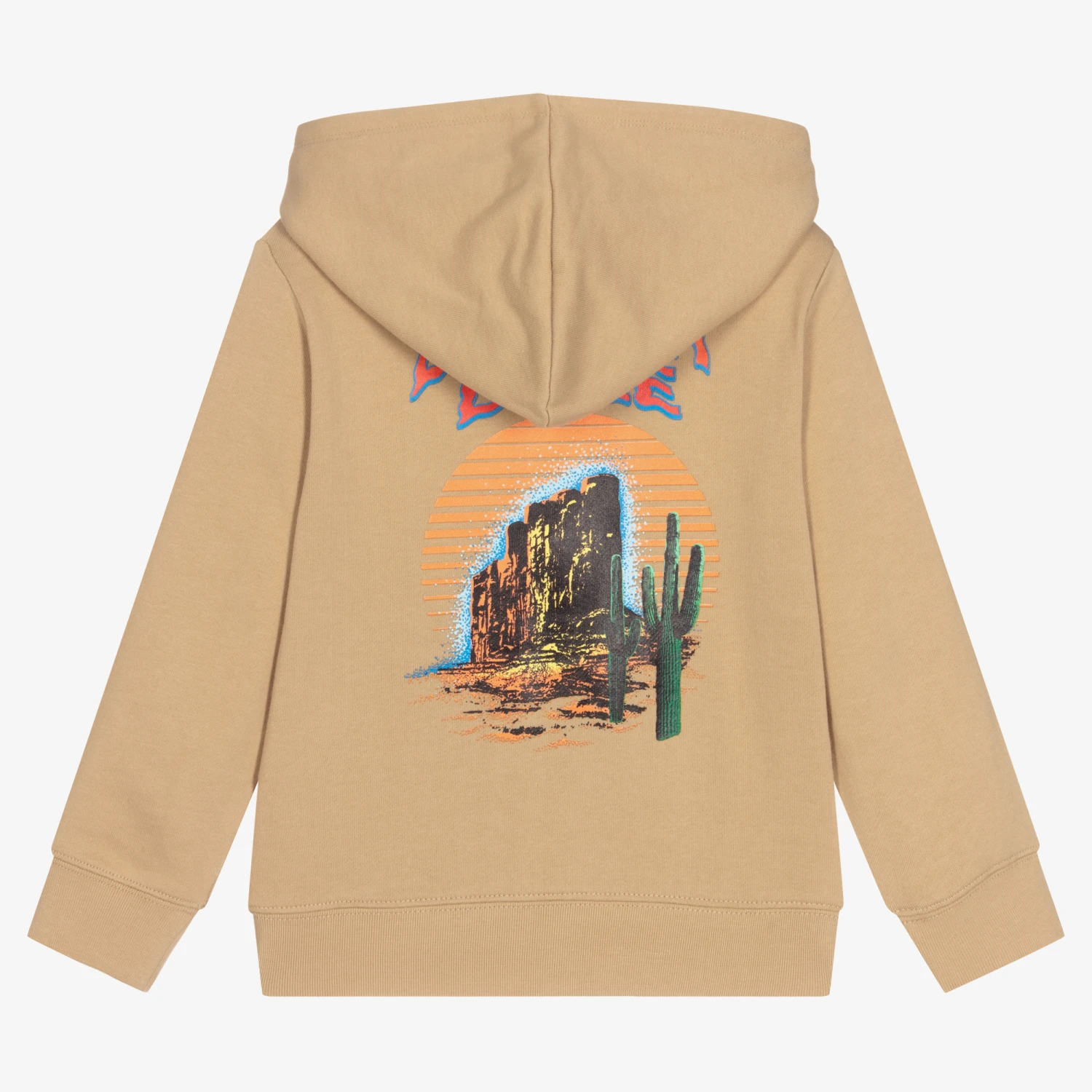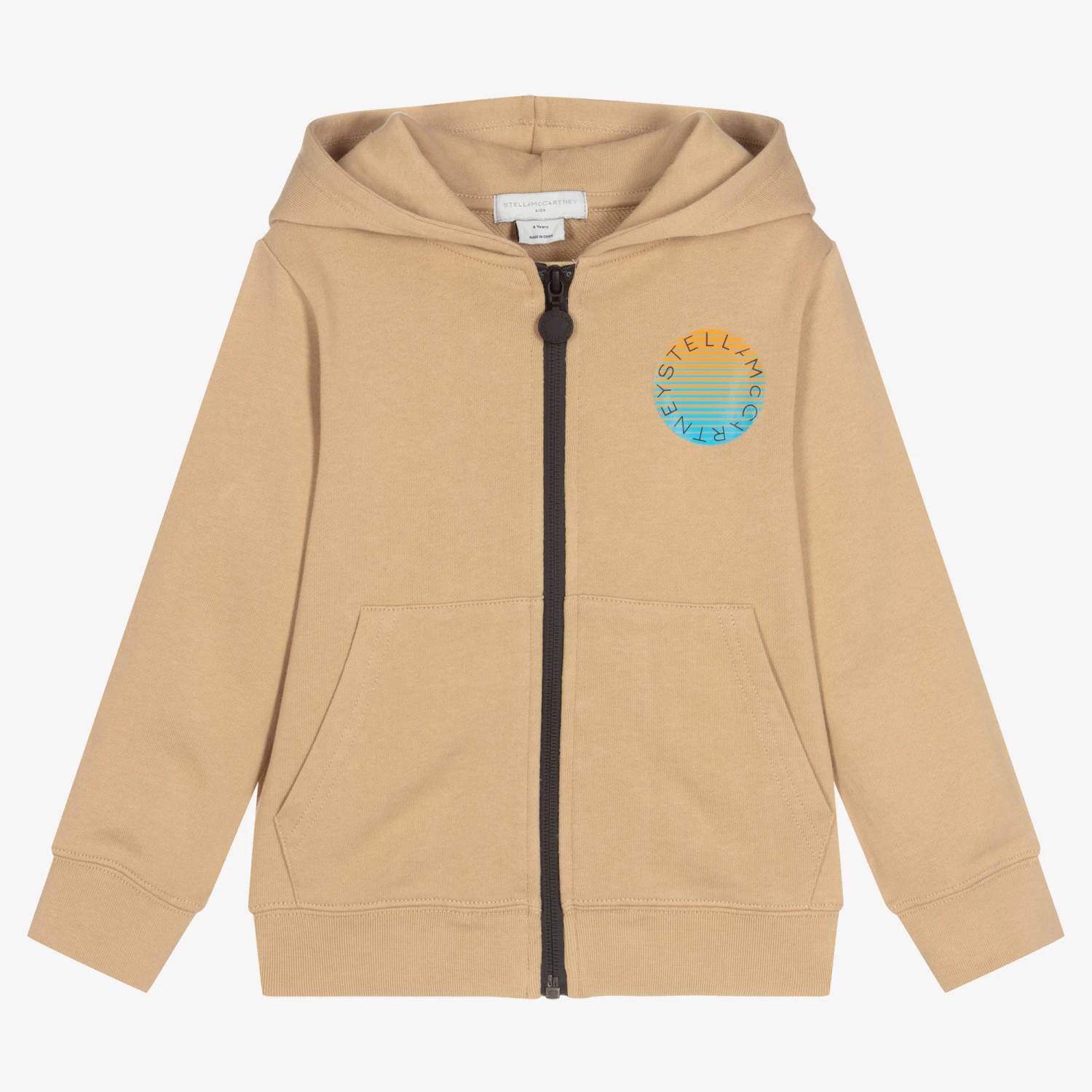 Beige zip-up hoodie for boys by British brand Stella McCartney Kids. Made in mid-weight organic cotton jersey, it has the designer’s striped blue and orange logo printed on the front, with a desert scene printed on the back with the words ‘Desert Daze’. It has a black zip fastening with a logo pull-tab, front pockets and ribbed trims.