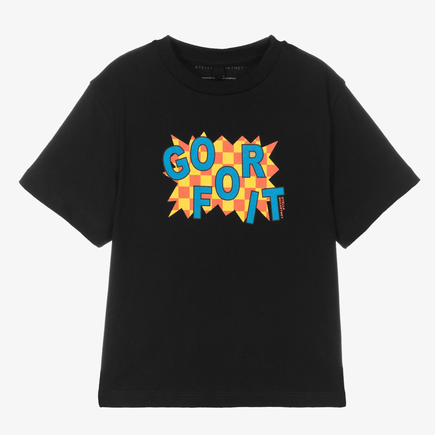 Black T-shirt for boys by Stella McCartney Kids, made in soft organic cotton jersey. It has an eye-catching, flag-inspired motif on the front with a fun, branded slogan to make an instant statement.
