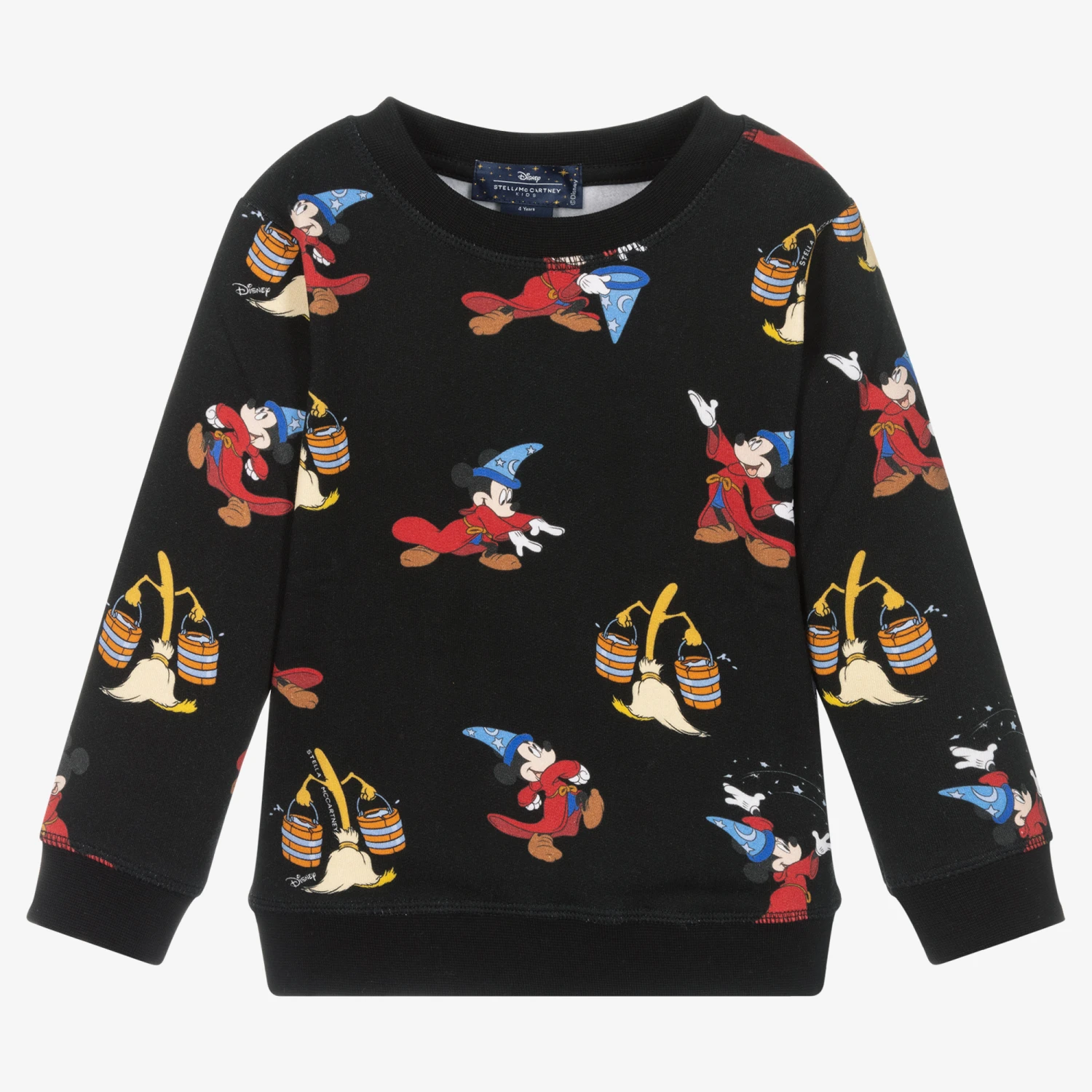 Black organic cotton sweatshirt for boys by Stella McCartney Kids. Forming part of the Disney© Fantasia capsule collection, this comfortable top is soft and fleecy inside and is patterned all over with iconic Mickey Mouse prints. For everyday comfort, it has a crew neckline and stretchy ribbed cuffs. The Stella McCartney fit can be quite small so choose a size up if you want room to grow.