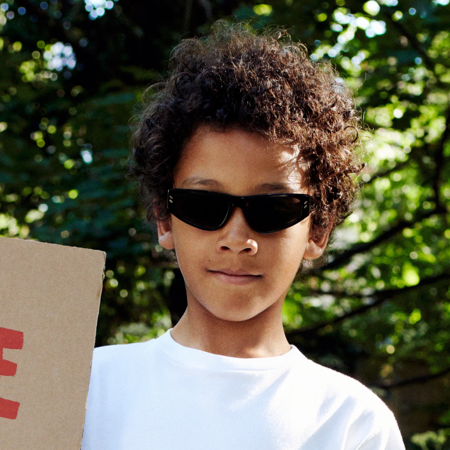 A pair of black sunglasses for boys by Stella McCartney Kids. They have grey tinted lenses, with category 3 filter against the sun glare. They come with a neoprene case for safe storage.