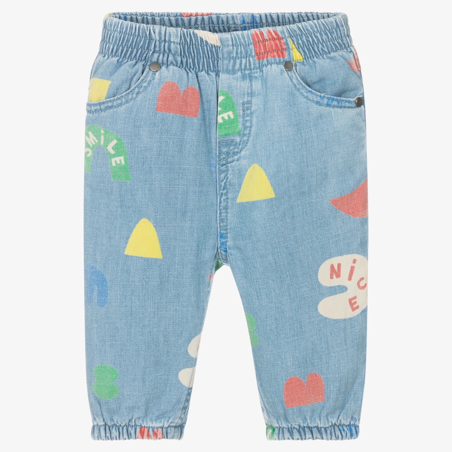 Light blue chambray joggers for little boys, by Stella McCartney Kids. Made in soft cotton chambray, they have a quirky, colourful shapes print all-over and a comfortable stretchy waist. With cuffed trims, they have a faux leather logo badge on the back of the waist.