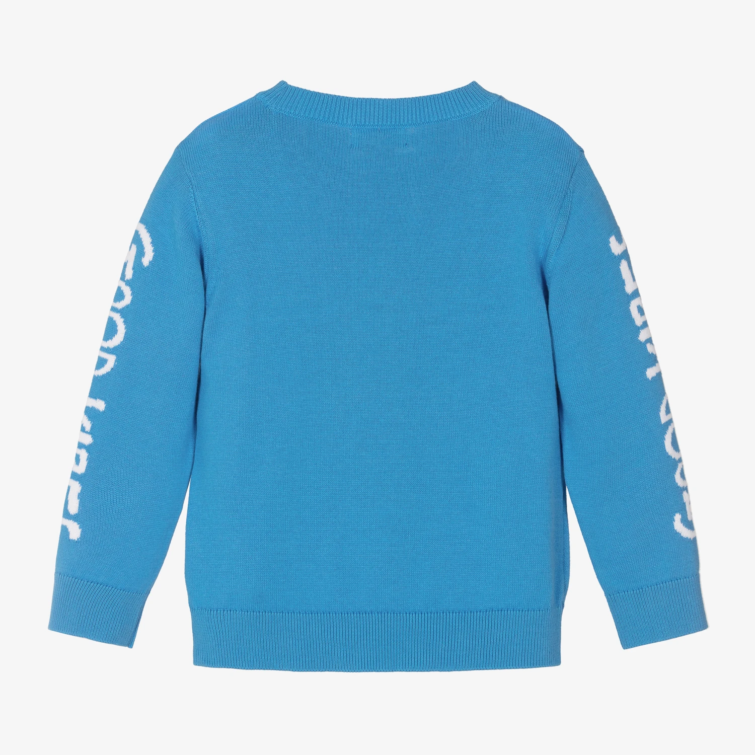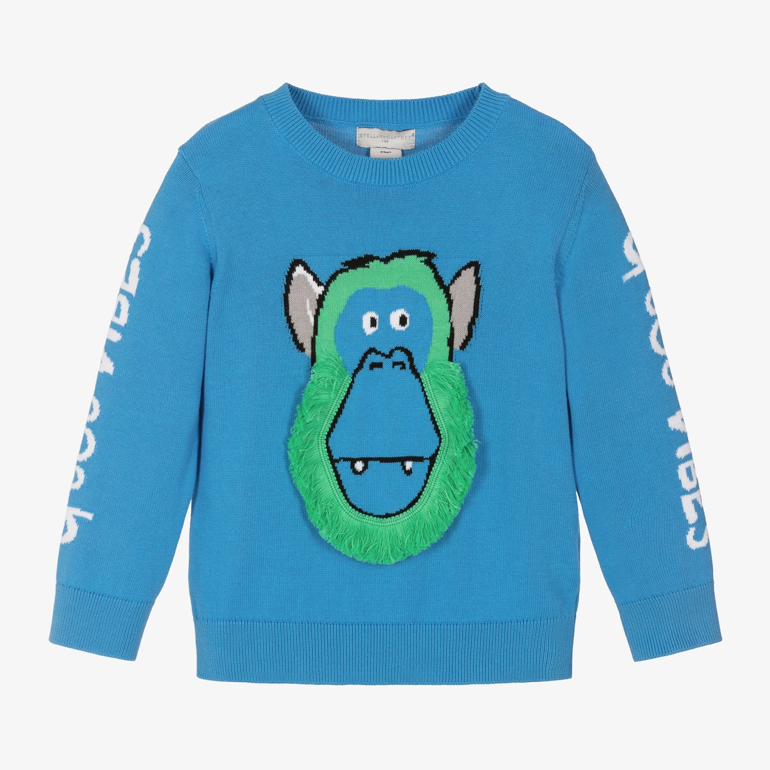 Boys bright blue sweater by Stella McCartney Kids. Finely knitted in soft and sustainable organic cotton, the front has an intarsia monkey face motif and green fringing, with ‘Good Vibes’ woven down the sleeves.