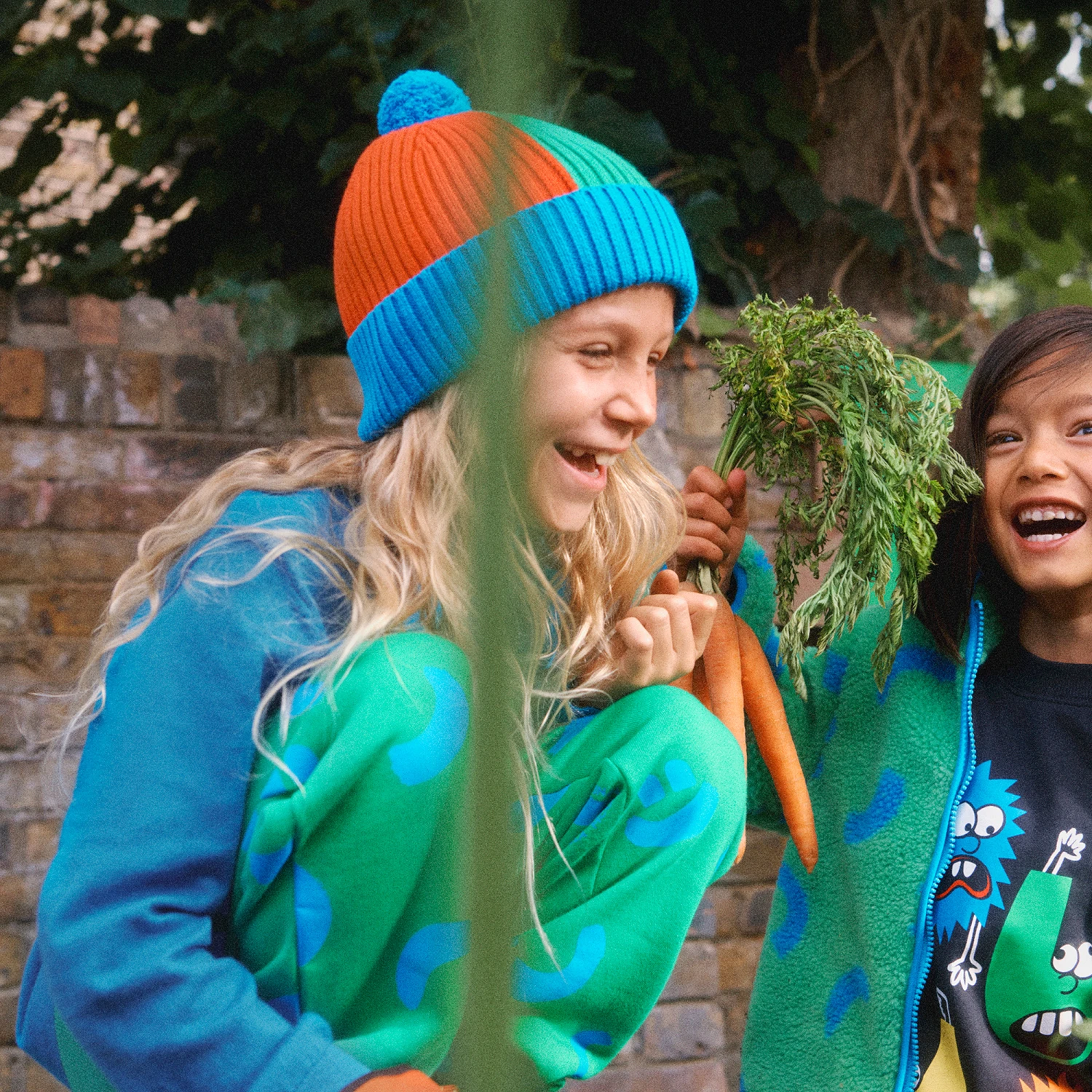 Fun blue sweater for boys by Stella McCartney Kids, knitted in a soft organic cotton and wool blend. With contrasting yellow and green trims, it has a colourful, intarsia smiling face on the front and a casual crew neckline.